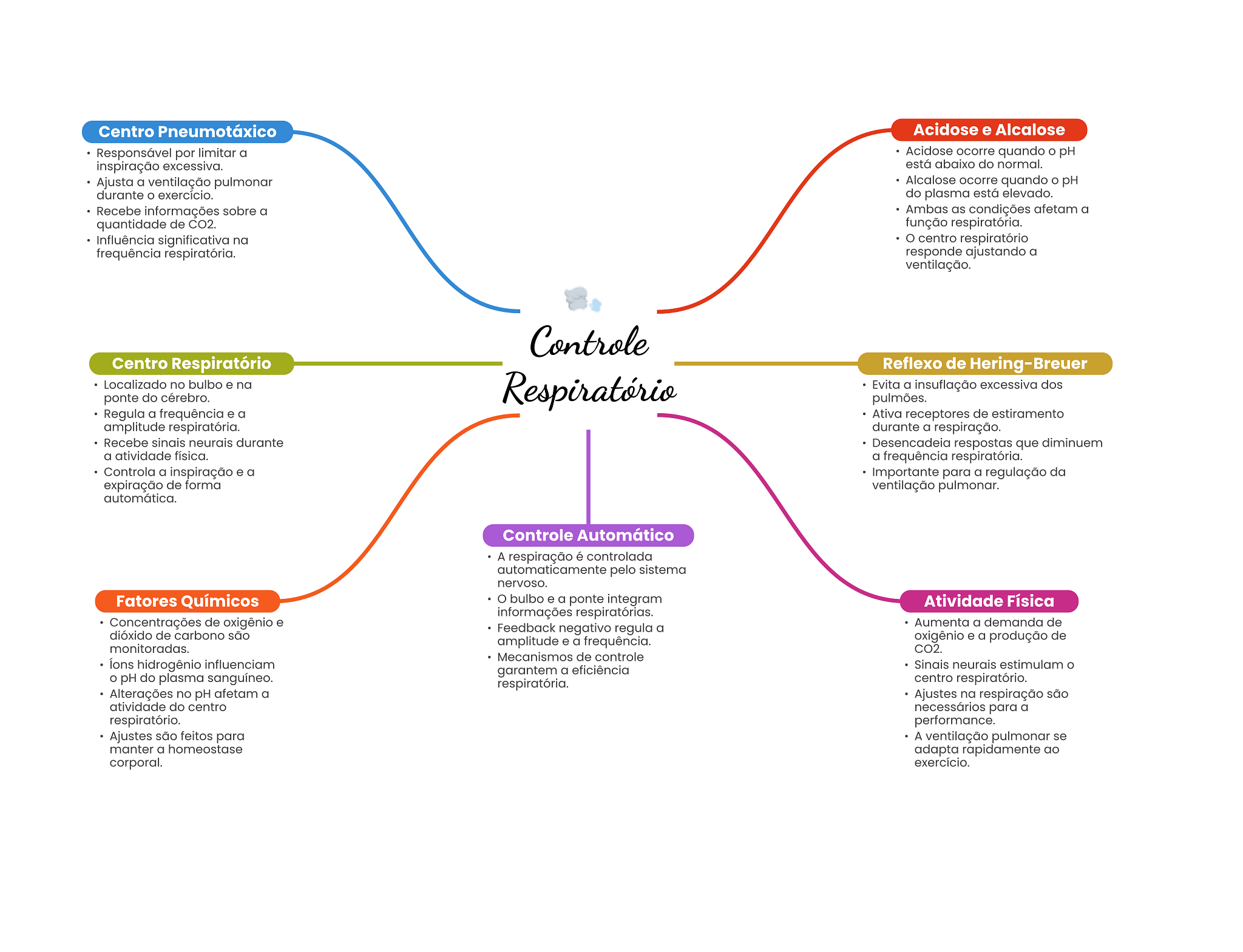 Centro Pneumotáxico Acidose e Alcalose Responsável por limitar a Acidose ocorre quando pH inspiração excessiva. está abaixo do normal. Ajusta a ventilação pulmonar Alcalose ocorre quando pH durante exercício. do plasma está elevado. Recebe informações sobre a Ambas as condições afetam a quantidade de CO2. função respiratória. Influência significativa na centro respiratório frequência respiratória. responde ajustando a ventilação. Controle Centro Respiratório Reflexo de Hering-Breuer Localizado no bulbo e na Respiratório Evita a insuflação excessiva dos ponte do cérebro. pulmões. Regula a frequência e a Ativa receptores de estiramento amplitude respiratória. durante a respiração. Recebe sinais neurais durante Desencadeia respostas que diminuem a atividade física. a frequência respiratória. Controla a inspiração e a Importante para a regulação da expiração de forma ventilação pulmonar. automática. Controle Automático A respiração é controlada pelo sistema nervoso. Fatores Químicos bulbo e a ponte integram Atividade Física informações respiratórias. Concentrações de oxigênio e Aumenta a demanda de dióxido de carbono são Feedback negativo regula a monitoradas. amplitude e a frequência. oxigênio e a produção de CO2. Mecanismos de controle lons hidrogênio influenciam Sinais neurais estimulam garantem a eficiência O pH do plasma sanguíneo. respiratória. centro respiratório. Alterações no pH afetam a Ajustes na respiração são atividade do centro necessários para a respiratório. performance. Ajustes são feitos para A ventilação pulmonar se manter a homeostase adapta rapidamente ao corporal. exercício.