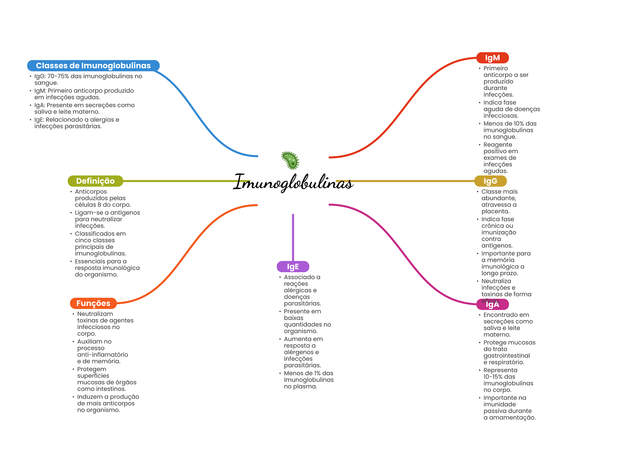 IgM Classes de Imunoglobulinas Primeiro IgG: 70-75% das imunoglobulinas no anticorpo a ser sangue. produzido durante IgM: Primeiro anticorpo produzido em infecções agudas. infecções. Indica fase IgA: Presente em secreções como saliva e leite materno. aguda de doenças infecciosas. IgE: Relacionado a alergias e Menos de 10% das infecções parasitárias. no sangue. Reagente positivo em exames de infecções agudas. Definição Imunoglobulinas IgG Anticorpos Classe mais produzidos pelas abundante, células do corpo. atravessa a Ligam-se a antígenos placenta. para neutralizar Indica fase infecções. crônica ou Classificados em imunização cinco classes contra principais de antígenos. imunoglobulinas. Importante para Essenciais para a a memória resposta imunológica IgE imunológica a do organismo. longo prazo. Associado a Neutraliza reações alérgicas e infecções e toxinas de forma doenças Funções parasitárias. IgA Neutralizam Presente em Encontrado em baixas toxinas de agentes infecciosos no quantidades no secreções como saliva e leite corpo. organismo. materno. Auxiliam no Aumenta em processo resposta a Protege mucosas do trato anti-inflamatório alérgenos e e de memória. infecções gastrointestinal parasitárias. e respiratório. Protegem Menos de 1% das Representa 10-15% das mucosas de órgãos imunoglobulinas como intestinos. no plasma. imunoglobulinas no corpo. Induzem a produção Importante na de mais anticorpos imunidade no organismo. passiva durante a amamentação.