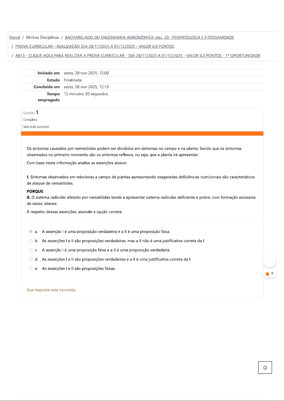 Painel / Minhas Disciplinas / BACHARELADO EM ENGENHARIA AGRONÔMICA-disc. 20- FITOPATOLOGIA E FITOSSANIDADE / PROVA CURRICULAR REALIZAÇÃO DIA 28/11/2025 A 01/12/2025 VALOR 6,0 PONTOS / AB13 CLIQUE AQUI PARA REALIZAR A PROVA CURRICULAR DIA 28/11/2025 A 01/12/2025 VALOR 6,0 PONTOS OPORTUNIDADE Iniciado em sexta, 28 nov 2025, 12:00 Estado Finalizada Concluída em sexta, 28 nov 2025, 12:13 Tempo 12 minutos 50 segundos empregado Questão 1 Completo Vale 0,60 ponto(s). Os sintomas causados por nematóides podem ser divididos em sintomas no campo e na planta. Sendo que os sintomas observados no primeiro momento são os sintomas reflexos, ou seja, que a planta irá apresentar. Com base nesta informação analise as asserções abaixo: I. Sintomas observados em reboleiras a campo de plantas apresentando exageradas deficiências nutricionais são característicos de ataque de nematóides. PORQUE II. sistema radicular afetado por nematóides tende a apresentar sistema radicular deficiente e pobre, com formação excessiva de raízes laterais. A respeito dessas asserções, assinale a opção correta: a. A asserção lé uma proposição verdadeira e a é uma proposição falsa. b. As asserções I e são proposições verdadeiras, mas a não é uma justificativa correta da I. C. A asserção lé uma proposição falsa e a é uma proposição verdadeira. d. As asserções e são proposições verdadeiras e a II é uma justificativa correta da I. e. As asserções e são proposições falsas. 0 Sua resposta está incorreta.Questão 2 Completo Vale 0,60 ponto(s). As doenças abióticas são geralmente causadas pela falta ou excesso de fatores ambientais, ou químicos, ou seja, não são causadas por patógenos. Existem alguns fatores ambientais que ocasionam injúrias, afetando as plantas momentaneamente, como, por exemplo, o vendaval, a chuva de pedras e o choque térmico. Com relação às doenças abióticas, analise as afirmativas a seguir: I A queda de flores e frutos é um sintoma a ser observado após a ocorrência de um longo período seco, estresse hídrico. estiolamento (internódios longos e finos) de plantas é sintoma característico de presença de encharcamento do solo. III Observar um fruto de tomate com o necrose na parte apical, ou seja, no fundo do fruto é um provável sinal de ocorrência de doença biótica. IV Observar um fruto de tomate com podridão na parte basal, próximo ao ramo, é um provável sinal de doença abiótica. Assinale a alternativa correta. a. Apenas II, III e IV estão corretas. b. Apenas a I está correta. C. Apenas III e IV estão corretas. d. Apenas I, e III estão corretas. e. Apenas I e estão corretas. Sua resposta está correta.Questão 3 Completo Vale 0,60 ponto(s). Os espiroplasmas são semelhantes aos fitoplasmas, pertencem à classe Mollicutes e diferem dos fitoplasmas pelos filamentos helicoidais que possuem. termo espiroplasma foi designado devido à morfologia espiralada e ausência de parede celular. Esses organismos foram identificados nos anos 70, em plantas de milho com sintomas de enfezamento e em plantas de citros com a doença conhecida por "sub-born". Em relação aos espiroplasmas, analise as afirmativas a seguir. I Os espiroplasmas quando observados na seiva de um hospedeiro, são vistos na forma de filamentos helicoidais (semelhantes a uma corda). A disseminação dos espiroplasmas ocorre por insetos sugadores que sugam seiva do floema de seus hospedeiros. III As cigarrinhas são hospedeiras de espiroplasmas, mas não atuam como vetores. IV Atualmente um grande problema no milho é a ocorrência da cigarrinha Dalbulus maidis, vetor do Spiroplasma kunkelii, o qual causa o enfezamento pálido do milho. Assinale a alternativa correta: a. Apenas a I está correta. b. Apenas II, III e IV estão corretas. C. Apenas III e IV estão corretas. d. Apenas I, e IV estão corretas. e. Apenas I, e III estão corretas. Sua resposta está correta.Questão 4 Completo Vale 0,60 ponto(s). O conceito de doenças em plantas é apresentado de diversas formas pelos fitopatologistas, eles encontram algumas dificuldades que nos levam a entender a doença como um fenômeno de natureza complexa, que não tem uma definição precisa. No entanto, existem características básicas consideradas pelos fitopatologistas sobre o conceito de doença. Diante disso, analise as afirmativas abaixo com relação a essas características: A doença causa interferência em processos fisiológicos das plantas. Portanto, as plantas doentes apresentam desempenho anormal nas suas funções vitais, como, por exemplo, na absorção e transporte de nutrientes e água ou na síntese de compostos. A interferência causada pela doença é prejudicial às plantas, pois elas reduzem sua eficiência fisiológica. O balanço energético é alterado naquelas doentes, ou seja, a utilização da energia torna-se desordenada e com isso ocorre prejuízo para as plantas. III A doença não é um processo contínuo, ou seja, é um processo temporário que ocorre nas plantas. IV A diferença entre injúria e doença é que injúria é um processo contínuo causado por diversos fatores, como ferimentos, e doença é um processo momentâneo. Assinale a alternativa correta: a. Apenas e III estão corretas. b. Apenas e estão corretas. C. Apenas II, III e IV estão corretas. d. Todas as alternativas estão corretas. e. Apenas I, e III estão corretas. Sua resposta está incorreta.Questão 5 Completo Vale 0,60 ponto(s). O controle químico de doenças de plantas é realizado pelo uso de vários tipos de produtos, incluindo fertilizantes e agrotóxicos. Os fertilizantes são utilizados para controle de doenças abióticas. Dentre os agrotóxicos estão os inseticidas, acaricidas, fungicidas, bactericidas, nematicidas e herbicidas. uso de agrotóxicos no controle de doenças envolve ao menos um dos princípios de controle. Nesse contexto, analise as afirmativas a seguir. Herbicidas atuam pelo princípio
