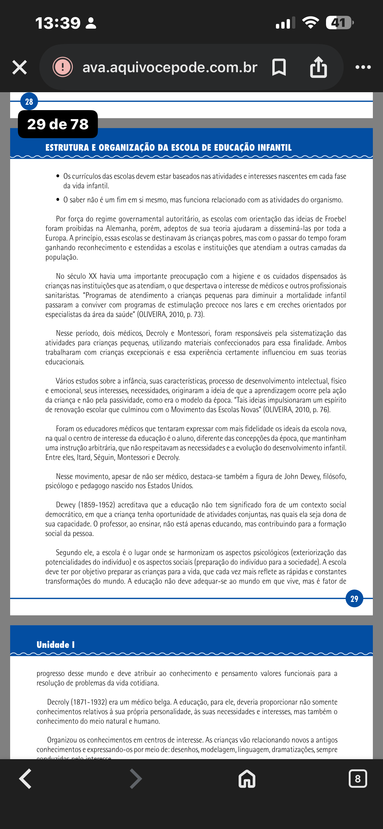 13:39 41 X ! ava.aquivocepode.com.br 28 29 de 78 ESTRUTURA E ORGANIZAÇÃO DA ESCOLA DE EDUCAÇÃO INFANTIL Os currículos das escolas devem estar baseados nas atividades e interesses nascentes em cada fase da vida infantil. 0 saber não é um fim em si mesmo, mas funciona relacionado com as atividades do organismo. Por força do regime governamental autoritário, as escolas com orientação das ideias de Froebel foram proibidas na Alemanha, porém, adeptos de sua teoria ajudaram a disseminá-las por toda a Europa. A princípio, essas escolas se destinavam às crianças pobres, mas com 0 passar do tempo foram ganhando reconhecimento e estendidas a escolas e instituições que atendiam a outras camadas da população. No século XX havia uma importante preocupação com a higiene e os cuidados dispensados às crianças nas instituições que as atendiam, 0 que despertava 0 interesse de médicos e outros profissionais sanitaristas. "Programas de atendimento a crianças pequenas para diminuir a mortalidade infantil passaram a conviver com programas de estimulação precoce nos lares e em creches orientados por especialistas da área da saúde" (OLIVEIRA, 2010, p. 73). Nesse período, dois médicos, Decroly e Montessori, foram responsáveis pela sistematização das atividades para crianças pequenas, utilizando materiais confeccionados para essa finalidade. Ambos trabalharam com crianças excepcionais e essa experiência certamente influenciou em suas teorias educacionais. Vários estudos sobre a infância, suas características, processo de desenvolvimento intelectual, físico e emocional, seus interesses, necessidades, originaram a ideia de que a aprendizagem ocorre pela ação da criança e não pela passividade, como era 0 modelo da época. "Tais ideias impulsionaram um espírito de renovação escolar que culminou com 0 Movimento das Escolas Novas" (OLIVEIRA, 2010, p. 76). Foram educadores médicos que tentaram expressar com mais fidelidade os ideais da escola nova, na qual 0 centro de interesse da educação é 0 aluno, diferente das concepções da época, que mantinham uma instrução arbitrária, que não respeitavam as necessidades e a evolução do desenvolvimento infantil. Entre eles, Itard, Séguin, Montessori e Decroly. Nesse movimento, apesar de não ser médico, destaca-se também a figura de John Dewey, filósofo, psicólogo e pedagogo nascido nos Estados Unidos. Dewey (1859-1952) acreditava que a educação não tem significado fora de um contexto social democrático, em que a criança tenha oportunidade de atividades conjuntas, nas quais ela seja dona de sua capacidade. 0 professor, ao ensinar, não está apenas educando, mas contribuindo para a formação social da pessoa. Segundo ele, a escola é 0 lugar onde se harmonizam os aspectos psicológicos (exteriorização das potencialidades do indivíduo) e os aspectos sociais (preparação do indivíduo para a sociedade). A escola deve ter por objetivo preparar as crianças para a vida, que cada vez mais reflete as rápidas e constantes transformações do mundo. A educação não deve adequar-se ao mundo em que vive, mas é fator de 29 Unidade I progresso desse mundo e deve atribuir ao conhecimento e pensamento valores funcionais para a resolução de problemas da vida cotidiana. Decroly (1871-1932) era um médico belga. A educação, para ele, deveria proporcionar não somente conhecimentos relativos à sua própria personalidade, às suas necessidades e interesses, mas também 0 conhecimento do meio natural e humano. Organizou conhecimentos em centros de interesse. As crianças vão relacionando novos a antigos conhecimentos e expressando-os por meio de: desenhos, modelagem, linguagem, dramatizações, sempre 8