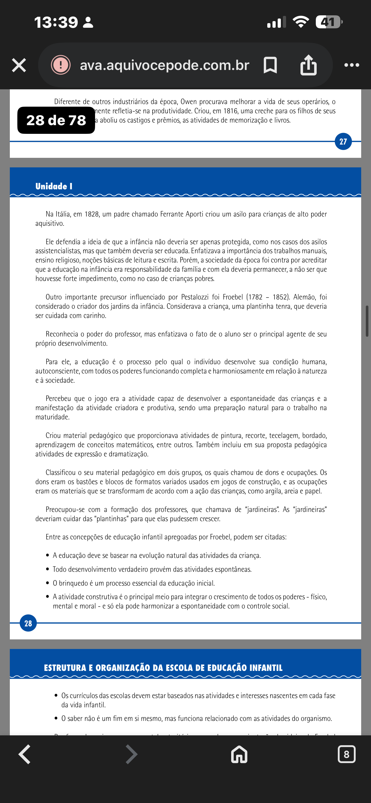 13:39 41 X ! ava.aquivocepode.com.br Diferente de outros industriários da época, Owen procurava melhorar a vida de seus operários, 0 nente refletia-se na produtividade. Criou, em 1816, uma creche para filhos de seus 28 de 78 aboliu os castigos e prêmios, as atividades de memorização e livros. 27 Unidade I Na Itália, em 1828, um padre chamado Ferrante Aporti criou um asilo para crianças de alto poder aquisitivo. Ele defendia a ideia de que a infância não deveria ser apenas protegida, como nos casos dos asilos assistencialistas, mas que também deveria ser educada. Enfatizava a importância dos trabalhos manuais, ensino religioso, noções básicas de leitura e escrita. Porém, a sociedade da época foi contra por acreditar que a educação na infância era responsabilidade da família e com ela deveria permanecer, a não ser que houvesse forte impedimento, como no caso de crianças pobres. Outro importante precursor influenciado por Pestalozzi foi Froebel (1782 1852). Alemão, foi considerado 0 criador dos jardins da infância. Considerava a criança, uma plantinha tenra, que deveria ser cuidada com carinho. Reconhecia 0 poder do professor, mas enfatizava 0 fato de 0 aluno ser principal agente de seu próprio desenvolvimento. Para ele, a educação é 0 processo pelo qual 0 indivíduo desenvolve sua condição humana, autoconsciente, com todos poderes funcionando completa e harmoniosamente em relação à natureza e à sociedade. Percebeu que 0 jogo era a atividade capaz de desenvolver a espontaneidade das crianças e a manifestação da atividade criadora e produtiva, sendo uma preparação natural para 0 trabalho na maturidade. Criou material pedagógico que proporcionava atividades de pintura, recorte, tecelagem, bordado, aprendizagem de conceitos matemáticos, entre outros. Também incluiu em sua proposta pedagógica atividades de expressão e dramatização. Classificou 0 seu material pedagógico em dois grupos, os quais chamou de dons e ocupações. Os dons eram os bastões e blocos de formatos variados usados em jogos de construção, e as ocupações eram os materiais que se transformam de acordo com a ação das crianças, como argila, areia e papel. Preocupou-se com a formação dos professores, que chamava de "jardineiras". As "jardineiras" deveriam cuidar das "plantinhas" para que elas pudessem crescer. Entre as concepções de educação infantil apregoadas por Froebel, podem ser citadas: A educação deve se basear na evolução natural das atividades da criança. Todo desenvolvimento verdadeiro provém das atividades espontâneas. 0 brinquedo é um processo essencial da educação inicial. A atividade construtiva é 0 principal meio para integrar 0 crescimento de todos os poderes físico, mental e moral e só ela pode harmonizar a espontaneidade com 0 controle social. 28 ESTRUTURA E ORGANIZAÇÃO DA ESCOLA DE EDUCAÇÃO INFANTIL Os currículos das escolas devem estar baseados nas atividades e interesses nascentes em cada fase da vida infantil. 0 saber não é um fim em si mesmo, mas funciona relacionado com as atividades do organismo. 8