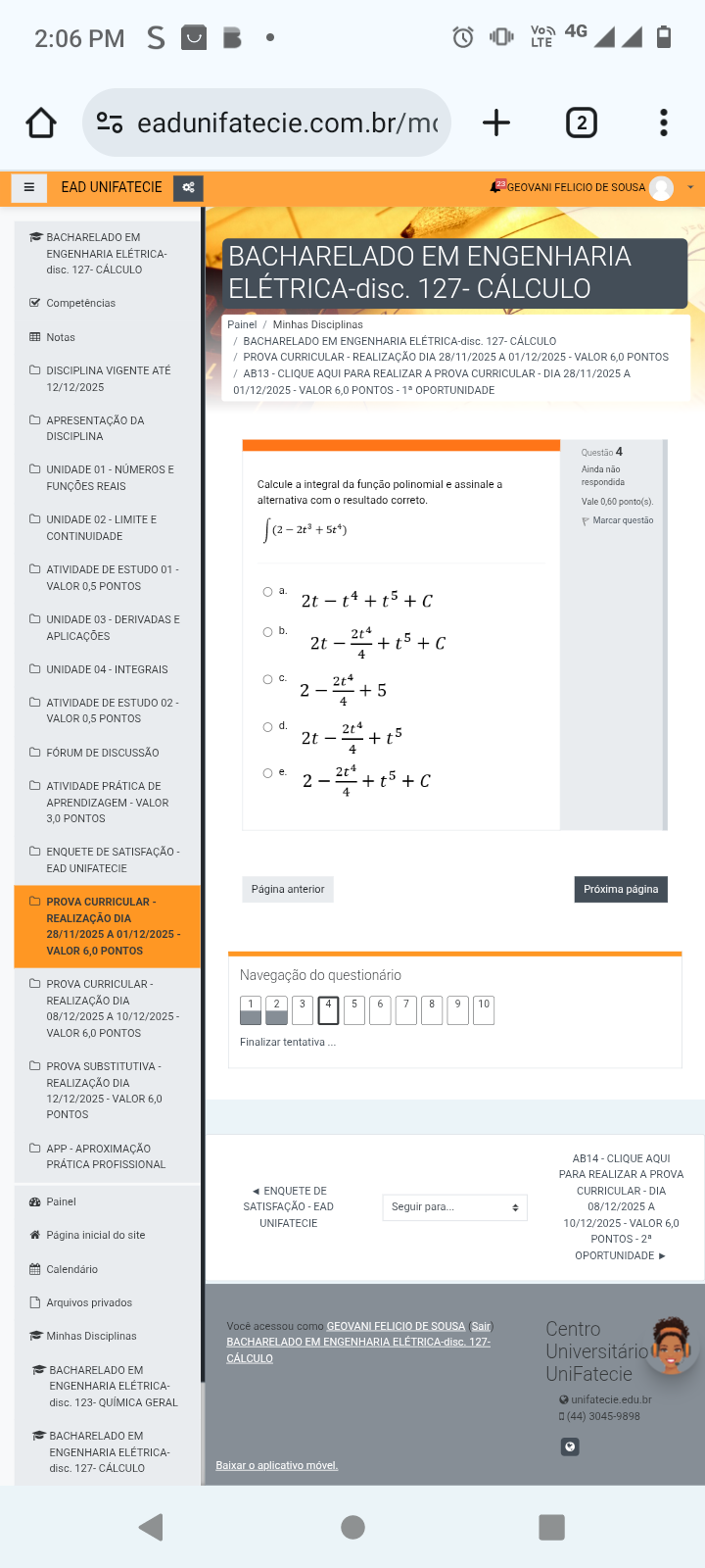2:06 PM S 4G LTE + 2 III EAD UNIFATECIE 8 GEOVANI FELICIO DE SOUSA BACHARELADO EM ENGENHARIA ELÉTRICA- BACHARELADO EM ENGENHARIA disc. 127- CÁLCULO ELÉTRICA-disc. 127- CÁLCULO Competências Painel / Minhas Disciplinas Notas / BACHARELADO EM ENGENHARIA 127- CÁLCULO / PROVA CURRICULAR REALIZAÇÃO DIA 28/11/2025 A 01/12/2025 VALOR 6,0 PONTOS DISCIPLINA VIGENTE ATÉ / AB13 CLIQUE AQUI PARA REALIZAR A PROVA CURRICULAR DIA 28/11/2025 A 12/12/2025 01/12/2025 VALOR 6.0 PONTOS OPORTUNIDADE APRESENTAÇÃO DA DISCIPLINA Questão 4 UNIDADE 01 NÚMEROS E Ainda não FUNÇÕES REAIS Calcule a integral da função polinomial e assinale a respondida alternativa com 0 resultado Vale 0,60 ponto(s). UNIDADE 02 LIMITE E CONTINUIDADE Marcar questão ATIVIDADE DE ESTUDO 01 VALOR 0,5 PONTOS UNIDADE 03 DERIVADAS E APLICAÇÕES b. UNIDADE 04 INTEGRAIS ATIVIDADE DE ESTUDO 02 VALOR 0,5 PONTOS d. FORUM DE DISCUSSÃO 4 ATIVIDADE PRÁTICA DE APRENDIZAGEM VALOR 3.0 PONTOS ENQUETE DE SATISFAÇÃO EAD UNIFATECIE Página anterior Próxima página PROVA CURRICULAR REALIZAÇÃO DIA 28/11/2025 A 01/12/2025 VALOR 6,0 PONTOS Navegação do questionário PROVA CURRICULAR - REALIZAÇÃO DIA 1 2 3 4 5 6 7 8 9 10 08/12/2025 A 10/12/2025 VALOR 6,0 PONTOS Finalizar tentativa PROVA SUBSTITUTIVA REALIZAÇÃO DIA 12/12/2025 VALOR 6,0 PONTOS APP APROXIMAÇÃO PROFISSIONAL AB14 CLIQUE AQUI PARA REALIZAR A PROVA ENQUETE DE CURRICULAR DIA Painel SATISFAÇÃO EAD Seguir para... 08/12/2025 A UNIFATECIE 10/12/2025 VALOR 6,0 Página inicial do site PONTOS- OPORTUNIDADE Calendário Arquivos privados acessou como GEOVANI FELICIO Sair Centro Minhas Disciplinas BACHARELADO EM ENGENHARIA 127- CÁLCULO Universitário BACHARELADO EM UniFatecie ENGENHARIA disc. 123- QUIMICA GERAL unifatecie.edu.br 0 (44) 3045-9898 BACHARELADO EM ENGENHARIA disc. 127- CALCULO Baixar 0 aplicativo