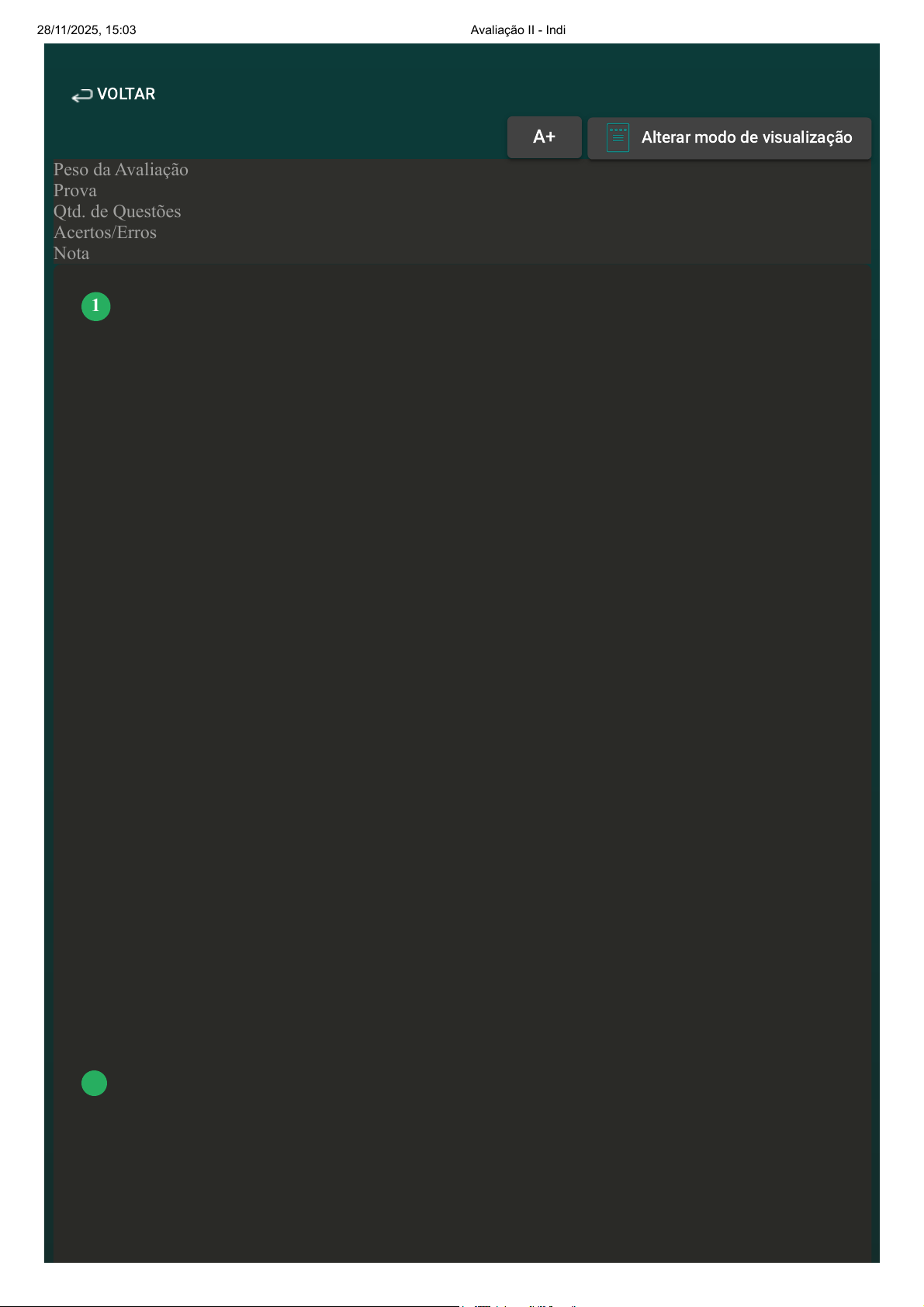 Prova Impressa GABARITO | Avaliação II - Individual (Cod.:1522293) Peso da Avaliação 2,00 Prova 109517099 Qtd. de Questões 10 Acertos/Erros 9/1 Nota 9,00 A síndrome de Guillain-Barré (SGB) é uma doença autoimune de natureza neurológica que compromete o sistema nervoso periférico, levando à fraqueza muscular e, em casos mais severos, à paralisia. O processo fisiopatológico da SGB ocorre quando o sistema imunológico ataca os nervos periféricos, afetando principalmente a mielina, uma camada lipídica que envolve os axônios e é fundamental para a condução eficiente dos impulsos nervosos. Sobre a síndrome de Guillain-Barré, analise as afirmativas a seguir: I. O vírus Epstein-Barr é uma das principais causas bacterianas associadas à síndrome de Guillain- Barré. II. O Campylobacter jejuni é um dos agentes patogênicos mais frequentemente associados ao desenvolvimento da síndrome de Guillain-Barré. III. Em casos de síndrome de Guillain-Barré, a desmielinização dos nervos periféricos ocorre devido à resposta imunológica desregulada após infecções virais ou bacterianas. IV. A síndrome de Guillain-Barré é caracterizada pela desmielinização dos nervos periféricos, o que pode levar a uma interrupção da condução nervosa e, em alguns casos, paralisia. É correto o que se afirma em: A III e IV, apenas. B I e IV, apenas. C II, III e IV, apenas. D II e III, apenas. VOLTAR A+ Alterar modo de visualização 1 28/11/2025, 15:03 Avaliação II - Individual about:blank 1/9 E I, II e III, apenas. A hematopoiese é o processo responsável pela formação e desenvolvimento das células sanguíneas, que ocorre principalmente na medula óssea. Este processo é crucial para a manutenção da homeostase do organismo, uma vez que as células sanguíneas desempenham funções vitais, como o transporte de oxigênio e nutrientes, a defesa contra infecções e a regulação da coagulação sanguínea. A hematopoiese envolve a diferenciação de células-tronco hematopoéticas em diversos tipos de células, incluindo eritrócitos, leucócitos e plaquetas, cada uma com funções específicas e características morfológicas distintas. Fonte: GUYTON, A. C.; HALL, J. E. Tratado de fisiologia médica. 13. ed. Rio de Janeiro: Elsevier, 2017. Considerando o processo de hematopoiese descrito, qual das alternativas a seguir melhor descreve a diferenciação das células-tronco hematopoéticas e seu impacto na resposta imunológica? A Os progenitores mieloides, derivados das células-tronco hematopoiéticas, são responsáveis pela produção de eritrócitos, plaquetas e leucócitos granulocíticos, enquanto os progenitores linfoides são responsáveis pela produção de linfócitos B, linfócitos T e células NK, essenciais para a resposta imunológica. B Durante a hematopoiese, as células-tronco hematopoiéticas multipotentes se dividem em progenitores linfoides e mieloides, sendo que apenas os progenitores linfoides são responsáveis pela produção de todos os leucócitos, enquanto os progenitores mieloides originam eritrócitos e plaquetas. C O processo de hematopoiese envolve a diferenciação das células-tronco hematopoiéticas diretamente em linfócitos B e T, com função exclusiva na imunidade adaptativa, enquanto outras células sanguíneas são formadas por diferenciação direta em progenitores mieloides. D As células-tronco hematopoiéticas se diferenciam exclusivamente em progenitores mieloides, que originam todas as células do sistema imunológico, incluindo linfócitos B, T e células NK. E A hematopoiese ocorre exclusivamente na medula óssea vermelha e é responsável pela produção de todas as células do sangue, incluindo células do sistema imunológico, como linfócitos B, linfócitos T e células NK, que se originam dos progenitores linfoides. O Infarto Agudo do miocárdio (IAM) inicia uma série de eventos inflamatórios e alterações hemodinâmicas. A morte das células do miocárdio provoca uma resposta inflamatória em nível sistêmico, com a liberação de citocinas e o recrutamento de células do sistema imunológico. As áreas 2 3 28/11/2025, 15:03 Avaliação II - Individual about:blank 2/9 afetadas passam por um processo de remodelação tecidual, o que pode resultar na formação de cicatrizes fibrosas e na perda definitiva da capacidade contrátil da região envolvida. Sem intervenção rápida, o IAM pode evoluir para complicações graves, como insuficiência cardíaca, arritmias letais e choque cardiogênico, aumentando substancialmente o risco de morte. A respeito da fisiopatologia do Infarto Agudo do Miocárdio (IAM), analise as afirmativas a seguir: I. O choque cardiogênico é uma complicação precoce comum em todos os pacientes com IAM, sem exceção. II. Pacientes com IAM, se não tratados rapidamente, têm alto risco de desenvolver arritmias fatais e insuficiência cardíaca. III. A remodelação tecidual após o IAM resulta na formação de tecido cicatricial fibrótico e na perda irreversível da função contrátil da área afetada. IV. A necrose das células miocárdicas desencadeia uma resposta inflamatória que inclui a liberação de citocinas e o recrutamento de células imunológicas. É correto o que se afirma em: A I, II, III e IV. B III e IV, apenas. C II, III e IV, apenas. D I, apenas. E II e IV, apenas. As distrofias musculares constituem um conjunto diverso de doenças genéticas que se caracterizam pela degeneração progressiva das fibras musculares, resultando em fraqueza e perda de massa muscular ao longo do tempo. A fisiopatologia dessas condições geralmente envolve mutações em genes que são responsáveis pela produção de proteínas essenciais para a integridade do sarcolema, que é a membrana que envolve as fibras musculares. Essas proteínas, como a distrofina, são cruciais para a manutenção da estrutura e da função muscular. Quando há ausência ou disfunção dessas proteínas, ocorre uma fragi