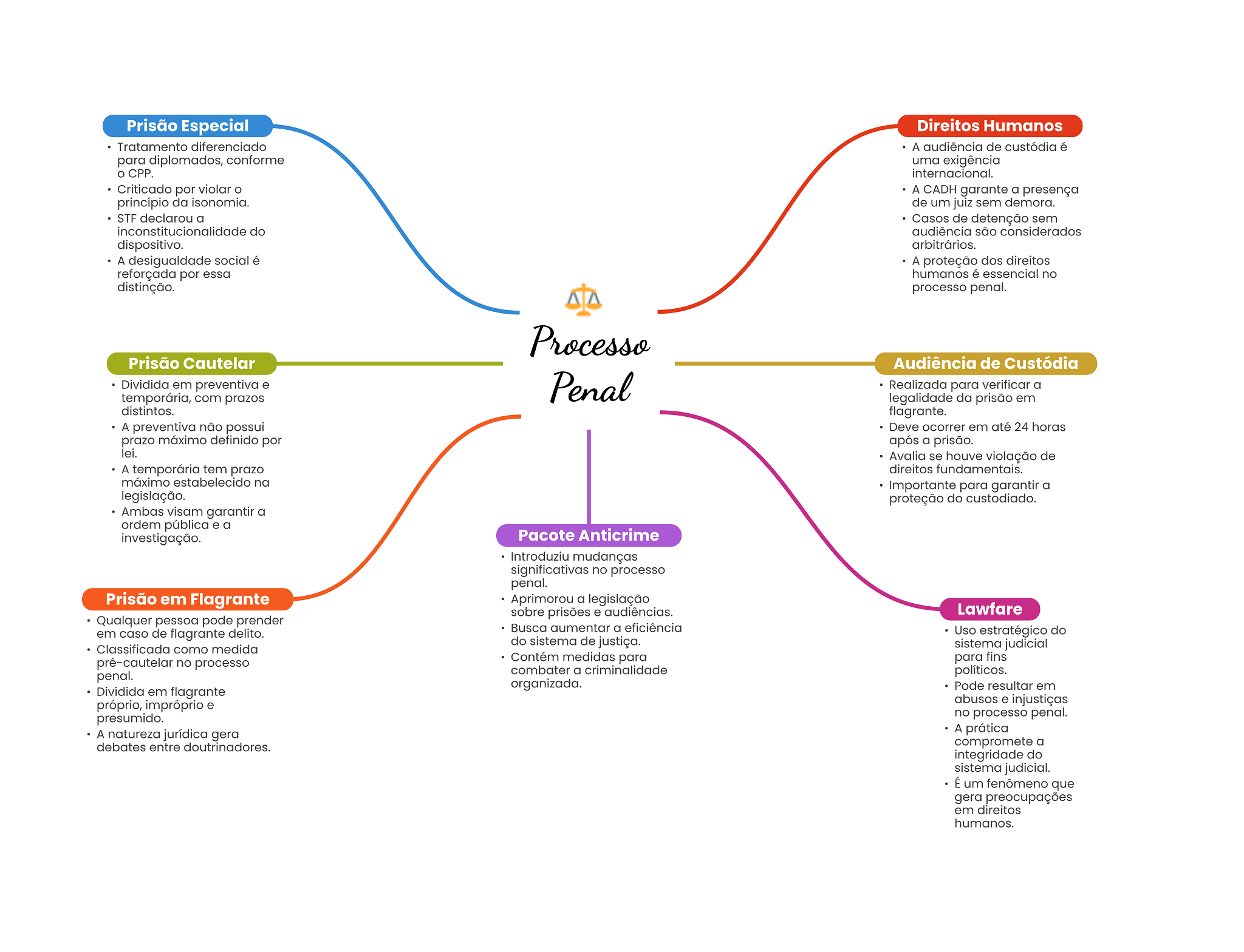 Prisão Especial Direitos Humanos Tratamento diferenciado A audiência de custódia é para diplomados, conforme uma exigência CPP. internacional. Criticado por violar A CADH garante a presença princípio da isonomia. de um juiz sem demora. STF declarou a Casos de detenção sem inconstitucionalidade do audiência são considerados dispositivo. arbitrários. A desigualdade social é A proteção dos direitos reforçada por essa humanos é essencial no distinção. processo penal. Processo Prisão Cautelar Audiência de Custódia Dividida em preventiva e Penal Realizada para verificar a temporária, com prazos legalidade da prisão em distintos. flagrante. A preventiva não possui Deve ocorrer em até 24 horas prazo máximo definido por após a prisão. lei. Avalia se houve violação de A temporária tem prazo direitos fundamentais. máximo estabelecido na Importante para garantir a legislação. proteção do custodiado. Ambas visam garantir a ordem pública e a investigação. Pacote Anticrime Introduziu mudanças significativas no processo penal. Prisão em Flagrante Aprimorou a legislação sobre prisões e audiências. Lawfare Qualquer pessoa pode prender Busca aumentar a eficiência em caso de flagrante delito. Uso estratégico do do sistema de justiça. Classificada como medida sistema judicial pré-cautelar no processo Contém medidas para para fins combater a criminalidade penal. políticos. organizada. Pode resultar em Dividida em flagrante próprio, impróprio e abusos e injustiças presumido. no processo penal. A natureza jurídica gera A prática debates entre doutrinadores. compromete a integridade do sistema judicial. É um fenômeno que gera preocupações em direitos humanos.