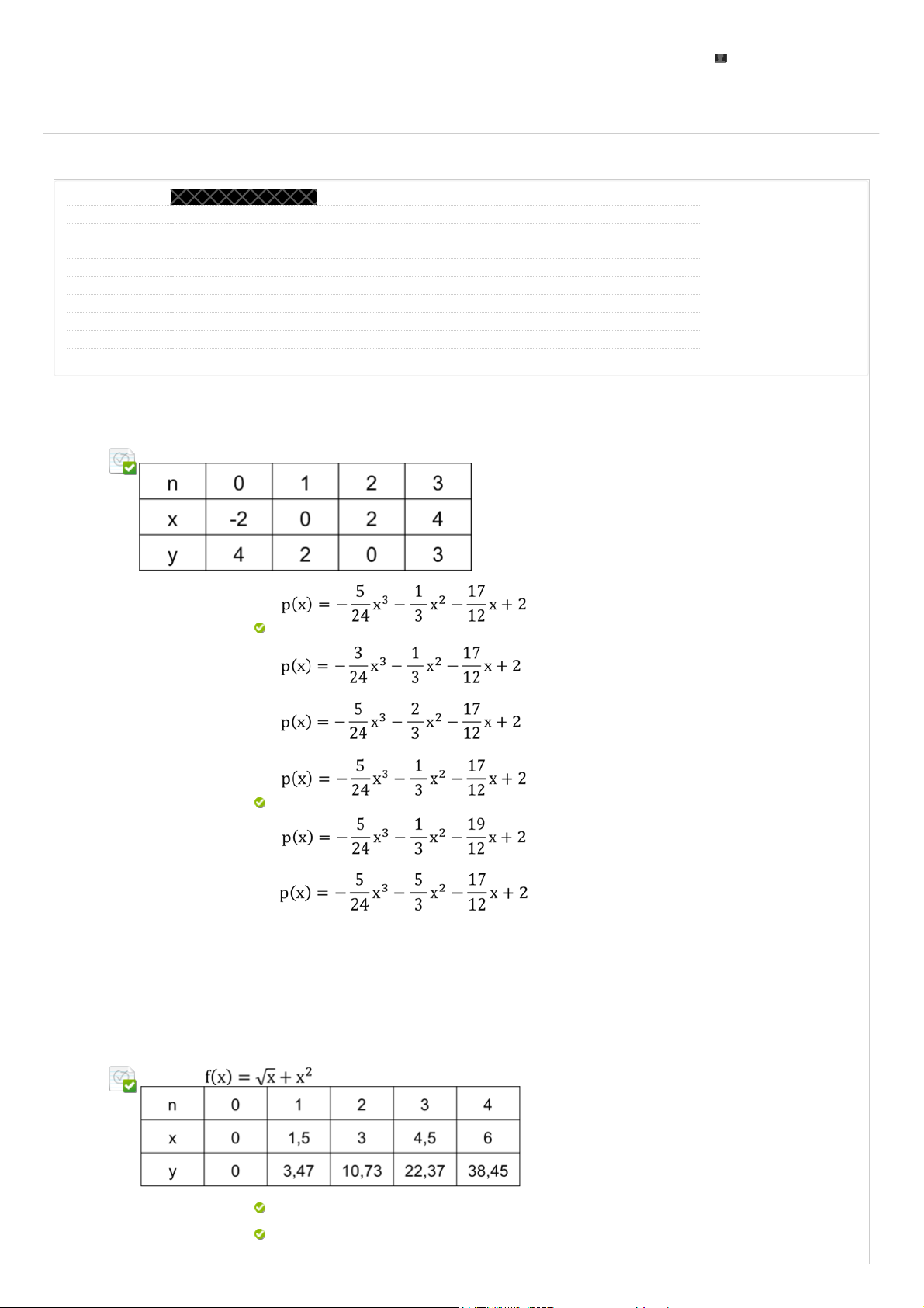 Revisar envio do teste: ATIVIDADE TELEAULA IICÁLCULO NUMÉRICO COMPUTACIONAL 7941-30_43701_R_E1_20252 CONTEÚDO Usuário Curso CÁLCULO NUMÉRICO COMPUTACIONAL Teste ATIVIDADE TELEAULA II Iniciado 03/10/25 20:27 Enviado 03/10/25 20:28 Status Completada Resultado da tentativa 0 em 0 pontos Tempo decorrido 0 minuto Autoteste O aluno responde e o resultado do aluno não é visível ao professor. Resultados exibidos Todas as respostas, Respostas enviadas, Respostas corretas, Comentários, Perguntas respondidas incorretamente Pergunta 1 Resposta Selecionada: c. Respostas: a. b. c. d. e. Comentário da resposta: Dada a tabela a seguir, determine a interpolação polinomial para os dados contidos na tabela utilizando a forma de Lagrange. Resposta: c) Pergunta 2 Resposta Selecionada: a. Respostas: a. Seja a função tabelada abaixo, aproxime f(2,9) usando interpolação quadrática pela forma de Newton. 10,1096 10,1096 CONTEÚDOS ACADÊMICOS BIBLIOTECAS MURAL DO ALUNO TUTORIAIS LABORATÓRIOS JULIO MELO 2 UNIP EAD 0 em 0 pontos 0 em 0 pontos 03/10/2025, 20:28 Revisar envio do teste: ATIVIDADE TELEAULA II – CÁLCULO ... https://ava.ead.unip.br/webapps/assessment/review/review.jsp?attempt_id=_116136646_1&course_id=_415352_1&content_id=_4630310_1&return_content=1… 1/2 http://company.blackboard.com/ https://ava.ead.unip.br/webapps/blackboard/execute/courseMain?course_id=_415352_1 https://ava.ead.unip.br/webapps/blackboard/content/listContent.jsp?course_id=_415352_1&content_id=_4628720_1&mode=reset https://ava.ead.unip.br/webapps/portal/execute/tabs/tabAction?tab_tab_group_id=_25_1 https://ava.ead.unip.br/webapps/portal/execute/tabs/tabAction?tab_tab_group_id=_27_1 https://ava.ead.unip.br/webapps/portal/execute/tabs/tabAction?tab_tab_group_id=_47_1 https://ava.ead.unip.br/webapps/portal/execute/tabs/tabAction?tab_tab_group_id=_29_1 https://ava.ead.unip.br/webapps/portal/execute/tabs/tabAction?tab_tab_group_id=_64_1 https://ava.ead.unip.br/webapps/portal/execute/tabs/tabAction?tab_tab_group_id=_10_1 https://ava.ead.unip.br/webapps/login/?action=logout Sexta-feira, 3 de Outubro de 2025 20h28min29s GMT-03:00 b. c. d. e. Comentário da resposta: 10,1010 10,1101 9,9901 9,9909 Resposta: a) Pergunta 3 Resposta Selecionada: d. Respostas: a. b. c. d. e. Comentário da resposta: Ajuste os dados da tabela abaixo pelo método dos mínimos quadrados utilizando uma parábola do tipo ax2 + bx + c. φ(x) = 0,4058 + 0,0781 x + 0,0154 x2 φ(x) = 0,4058 + 0,7810 x + 0,0154 x2 φ(x) = 0,4058 + 0,7081 x + 0,0154 x2 φ(x) = 0,4058 + 0,0781 x + 0,1540 x2 φ(x) = 0,4058 + 0,0781 x + 0,0154 x2 φ(x) = 0,4070 + 0,0781 x + 0,0154 x2 Resposta: d) Pergunta 4 Resposta Selecionada: b. Respostas: a. b. c. d. e. Comentário da resposta: Considere os dados da tabela a seguir e determine a interpolação polinomial de grau 2 para a função f(x) utilizando a forma de Newton. Resposta: b) ← OK 0 em 0 pontos 0 em 0 pontos 03/10/2025, 20:28 Revisar envio do teste: ATIVIDADE TELEAULA II – CÁLCULO ... https://ava.ead.unip.br/webapps/assessment/review/review.jsp?attempt_id=_116136646_1&course_id=_415352_1&content_id=_4630310_1&return_content=1… 2/2