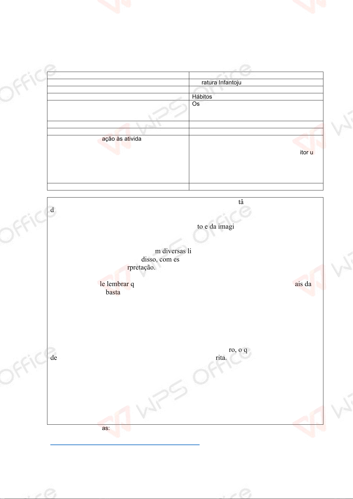 MANUAL DA BRINQUEDOTECA Tanto a leitura quanto a escrita são práticas sociais de suma importância para o desenvolvimento da cognição humana. Ambas proporcionam o desenvolvimento do intelecto e da imaginação, além de promoverem a aquisição de conhecimentos. Dessa maneira, quando lemos ocorrem diversas ligações no cérebro que nos permitem desenvolver o raciocínio. Além disso, com essa atividade aguçamos nosso senso crítico por meio da capacidade de interpretação. Nesse sentido, vale lembrar que a “interpretação” dos textos é uma das chaves essenciais da leitura. Afinal, não basta ler ou decodificar os códigos linguísticos, faz-se necessário compreender e interpretar essa leitura. Muitos são os benefícios que a leitura proporciona: desenvolvimento da imaginação, da criatividade, da comunicação, bem como o aumento do vocabulário, conhecimentos gerais e do senso crítico. Além desses benefícios, com a leitura exercitamos nosso cérebro, o que facilita a interpretação de textos e leva à maior a competência (habilidade) na escrita. Referências utilizadas: https://www.todamateria.com.br/a-importancia-da-leitura/ https://vestibular.brasilescola.uol.com.br/blog/a-importancia-leitura-na-qualidade-vida.htm Disciplina Data Tema Escolhido com justificativa Atividades que serão desenvolvidas Tempo necessário 1 hora Material Utilizado Livros, Cartilhas, desenhos. Expectativas em relação às atividades (objetivos) A leitura estimula o raciocínio, melhora o vocabulário, aprimora a capacidade interpretativa, além de proporcionar ao leitor um conhecimento amplo e diversificado sobre vários assuntos. Ler desenvolve a criatividade, a imaginação, a comunicação, o senso crítico, e amplia a habilidade na escrita. Quantidade de alunos e faixa etária 20 alunos idade 8 a9 anos Hábitos de ler Literatura Infantojuvenil Os alunos escolherão o livro e as histórias a serem lidas, depois cada um irá ler sua história preferida. 02/005/2023 https://www.todamateria.com.br/a-importancia-da-leitura/ MANUAL DA BRINQUEDOTECA A leitura é a maneira mais antiga – e mais eficiente, até hoje, de adquirir conhecimento. E é preciso desconstruir aquela ideia de que ler é um hábito chato e monótono. Ao contrário do que muitas pessoas acreditam, ler revistas, sites, gibis, livros de romance, entre outras leituras de entretenimento, é tão eficaz quanto ler um livro técnico. A diferença é que ler sobre algo técnico oferece conhecimento sobre aquele determinado assunto, enquanto ler sobre variedades estimula o raciocínio e melhora o vocabulário. É clichê, mas é fato: somente escreve bem quem lê bastante. Com a tecnologia fazendo parte das famílias cada vez mais cedo e de forma mais abrangente, é preciso dar atenção especial às crianças, e inserir o hábito da leitura na vida delas desde bem cedo. É estimula a criatividade e a imaginação; A criança aprende a interpretar textos e a desenvolver seu senso crítico; A leitura transporta a criança para uma realidade diferente da dela, o que ajuda a desenvolver empatia e consciência do seu papel como cidadã. Ao se falar ou ao se pensar em leitura e como ela contribui para o desenvolvimento da criança, não podemos esquecer-nos de todo o conjunto e do meio em que ela está inserida. Ela, a leitura, faz parte do processo de construção do conhecimento e acompanha o aluno durante toda sua formação. Acadêmico:Luana freire silva Matrícula:2522410 Disciplina: Literatura Infantojuvenil O tema escolhido: Hábitos de Ler A data da aplicação e/ou observação: 02/05/2023
