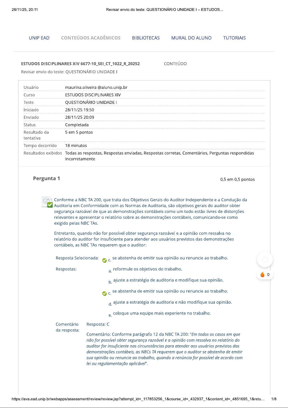 28/11/25, 20:11 Revisar envio do teste: QUESTIONÁRIO UNIDADE UNIP EAD CONTEÚDOS ACADÊMICOS BIBLIOTECAS MURAL DO ALUNO TUTORIAIS ESTUDOS DISCIPLINARES XIV 6677-10_SEI_CT_1022_R_20252 CONTEÚDO Revisar envio do teste: QUESTIONÁRIO UNIDADE Usuário maurina.oliveira @aluno.unip.br Curso ESTUDOS DISCIPLINARES XIV Teste QUESTIONÁRIO UNIDADE Iniciado 28/11/25 19:50 Enviado 28/11/25 20:09 Status Completada Resultado da 5 em 5 pontos tentativa Tempo decorrido 18 minutos Resultados exibidos Todas as respostas, Respostas enviadas, Respostas corretas, Comentários, Perguntas respondidas incorretamente Pergunta 1 0,5 em 0,5 pontos Conforme a NBC 200, que trata dos Objetivos Gerais do Auditor Independente e a Condução da Auditoria em Conformidade com as Normas de Auditoria, são objetivos gerais do auditor obter segurança razoável de que as demonstrações contábeis como um todo estão livres de distorções relevantes e apresentar relatório sobre as demonstrações contábeis, comunicando-se como exigido pelas NBC TAs. Entretanto, quando não for possível obter segurança razoável e a opinião com ressalva no relatório do auditor for insuficiente para atender aos usuários previstos das demonstrações contábeis, as NBC TAs requerem que auditor: Resposta Selecionada: se abstenha de emitir sua opinião ou renuncie ao trabalho. C. Respostas: reformule os objetivos do trabalho. a. 0 b. ajuste a estratégia de auditoria e modifique sua opinião. se abstenha de emitir sua opinião ou renuncie ao trabalho. d. ajuste a estratégia de auditoria e não modifique sua opinião. e. coloque uma equipe mais experiente no trabalho. Comentário Resposta: da resposta: Comentário: Conforme parágrafo 12 da NBC TA 200: "Em todos os casos em que não for possível obter segurança razoável e a opinião com ressalva no relatório do auditor for insuficiente nas circunstâncias para atender aos usuários previstos das demonstrações contábeis, as NBCs requerem que auditor se abstenha de emitir sua opinião ou renuncie ao trabalho, quando a renúncia for possível de acordo com lei ou regulamentação aplicável". 1/828/11/25, 20:11 Revisar envio do teste: QUESTIONÁRIO UNIDADE ESTUDOS... Pergunta 2 0,5 em 0,5 pontos De acordo com que estabelece a NBC 200 Objetivos Gerais do Auditor Independente, Auditoria de Demonstrações Contábeis e a Condução da Auditoria, julgue os itens abaixo, como Verdadeiros (V) ou Falsos (F) e, em seguida, assinale a opção correta. I. objetivo da auditoria é aumentar o grau de confiança nas demonstrações contábeis por parte dos usuários, mediante a expressão de uma opinião pelo auditor sobre se as demonstrações contábeis foram elaboradas, em todos os aspectos relevantes, em conformidade com uma estrutura de relatório financeiro aplicável. II. As demonstrações contábeis sujeitas à auditoria são as da entidade, elaboradas pela sua administração, com supervisão geral dos responsáveis pela governança. A auditoria das demonstrações contábeis não exime dessas responsabilidades a administração ou os responsáveis pela governança. III. conceito de materialidade é aplicado pelo auditor no planejamento e na execução da auditoria; e na avaliação do efeito de distorções identificadas sobre a auditoria, e de distorções não corrigidas, se houver, sobre as demonstrações contábeis. A sequência correta é: Resposta Selecionada: a. F,V,F. Respostas: b. F,V,V. V,F,V. d. V,V,V. Comentário da resposta: Resposta: D Comentário: - Afirmativa correta. Conforme NBC 200, parágrafo 3. II - Afirmativa correta. Conforme NBC 200, parágrafo 4. III Afirmativa correta. Conforme NBC 200, parágrafo 6. Pergunta 3 0,5 em 0,5 pontos De acordo com a NBC 200 - Objetivos Gerais do Auditor Independente e a Condução da Auditoria em Conformidade com Normas de Auditoria, Risco de Detecção é: Resposta b. Selecionada: risco de que os procedimentos executados pelo auditor, para reduzir risco de auditoria a um nível aceitavelmente baixo, não detectem uma distorção existente que possa ser relevante, individualmente ou em conjunto com outras distorções. 2/828/11/25, 20:11 Revisar envio do teste: QUESTIONÁRIO UNIDADE ESTUDOS... Respostas: a. risco de que auditor expresse uma opinião de auditoria inadequada quando as demonstrações contábeis contiverem distorção relevante. b. risco de que os procedimentos executados pelo auditor, para reduzir risco de auditoria a um nível aceitavelmente baixo, não detectem uma distorção existente que possa ser relevante, individualmente ou em conjunto com outras distorções. risco inerente à suscetibilidade de uma afirmação a respeito de uma transação, saldo contábil ou divulgação, a uma distorção que possa ser relevante, individualmente ou em conjunto com outras distorções, antes da consideração de quaisquer controles relacionados. d. risco que uma distorção pode causar em uma afirmação sobre uma classe de transação, saldo contábil ou divulgação, e que possa ser relevante, individualmente ou em conjunto com outras distorções. e. risco de que as demonstrações contábeis contenham distorção relevante antes da auditoria. Comentário da Resposta: resposta: Comentário: Conforme NBC 200, em seu parágrafo 13: "(e) Risco de detecção é risco de que os procedimentos executados pelo auditor para reduzir risco de auditoria a um nível aceitavelmente baixo não detectem uma distorção existente que possa ser relevante, individualmente ou em conjunto com outras distorções." Pergunta 4 0,5 em 0,5 pontos De acordo com a NBC 200 Objetivos Gerais do Auditor Independente e a Condução da Auditoria em Conformidade com Normas de Auditoria, objetivo da auditoria é aumentar grau de confiança nas demonstrações contábeis por parte dos usuários. Isso é alcançado mediante a expressão de uma opinião pelo auditor sobre as demonstrações contábeis, nos seguintes termos: Resposta d. Selecionada: As dem