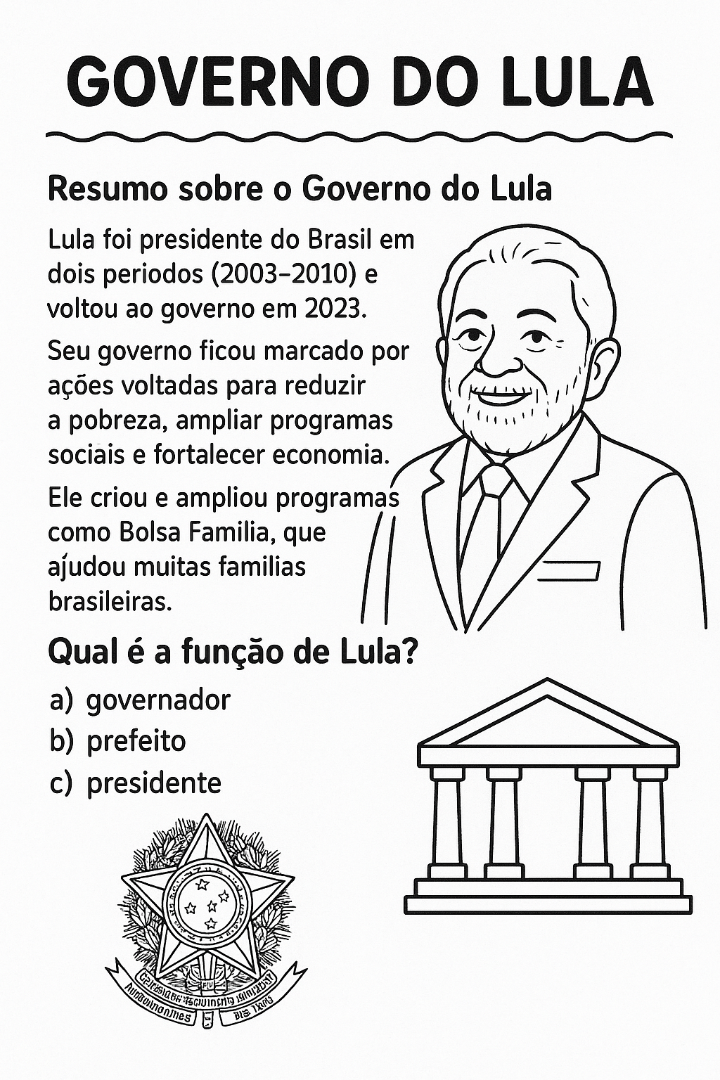 GOVERNO DO LULA Resumo sobre Governo do Lula Lula foi presidente do Brasil em dois periodos (2003-2010) e voltou ao governo em 2023. Seu governo ficou marcado por ações voltadas para reduzir a pobreza, ampliar programas sociais e fortalecer economia. Ele criou e ampliou programas como Bolsa Familia, que ajudou muitas familias brasileiras. Qual é função de Lula? a) governador b) prefeito c) presidente *