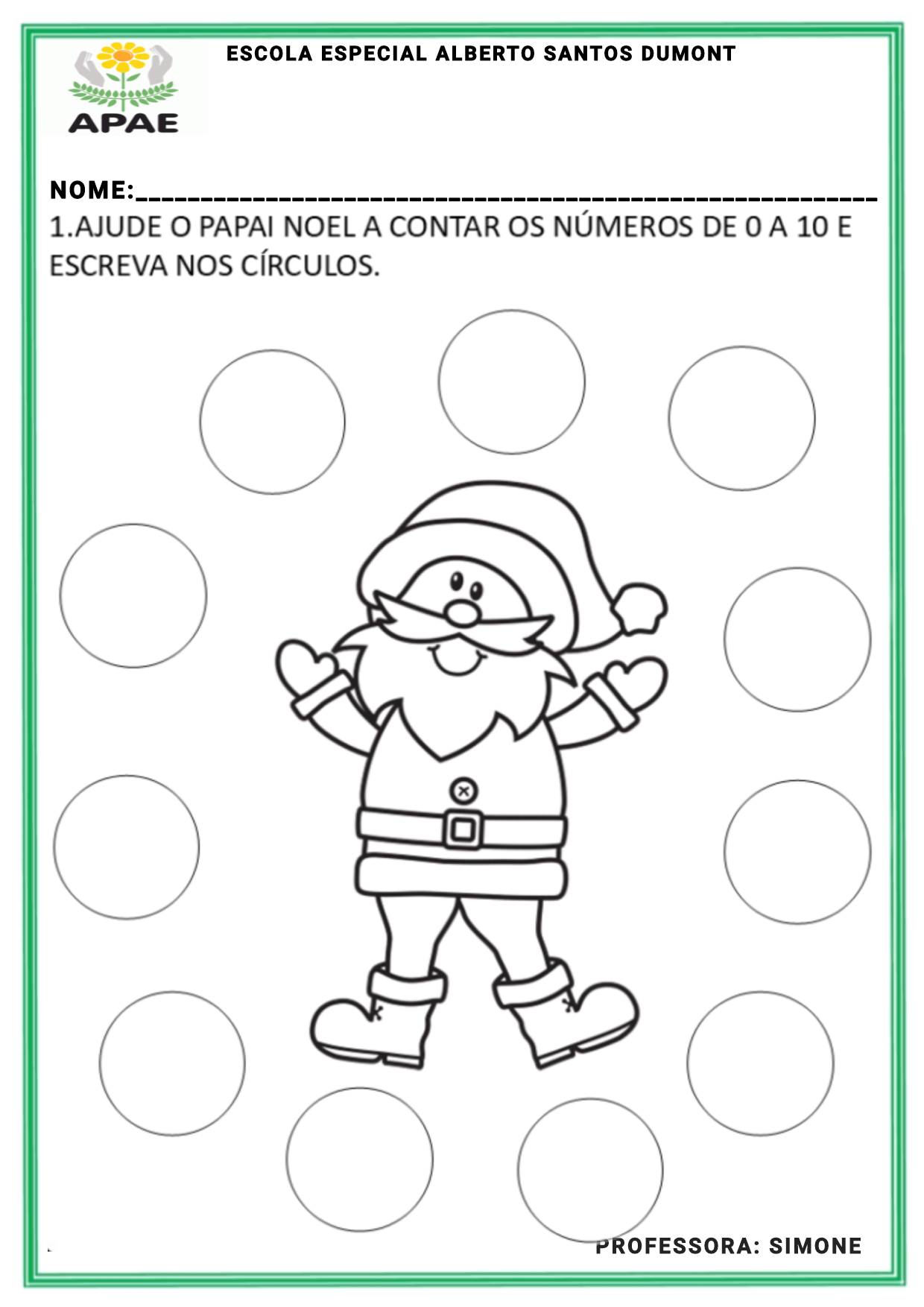 ESCOLA ESPECIAL ALBERTO SANTOS DUMONT APAE NOME: 1.AJUDE PAPAI NOEL A CONTAR OS DE 0A 10 E ESCREVA NOS CÍRCULOS. PROFESSORA: SIMONE