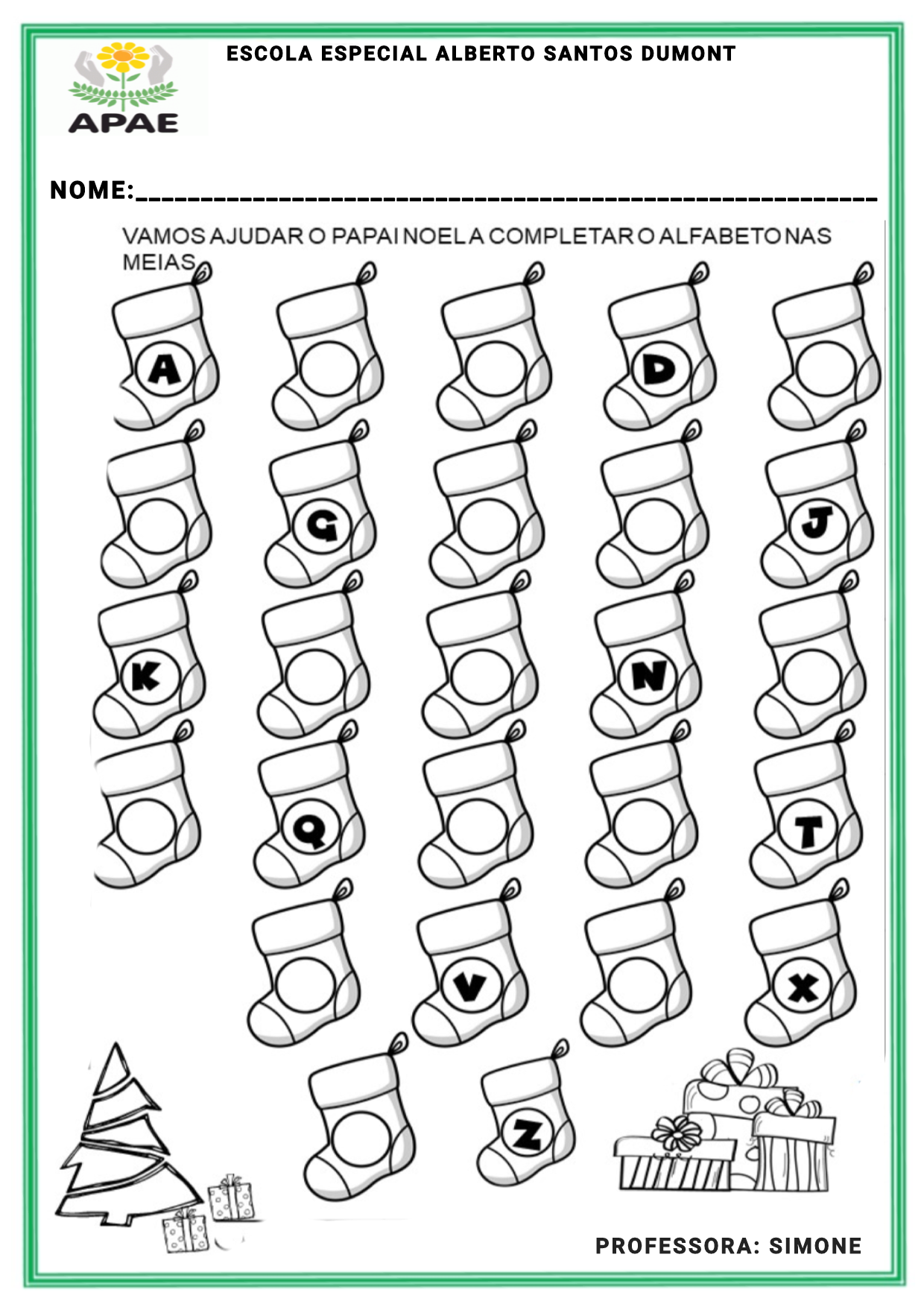 ESCOLA ESPECIAL ALBERTO SANTOS DUMONT APAE NOME: VAMOS AJUDAR PAPAI NOELA COMPLETAR ALFABETONAS MEIAS A D G N T z PROFESSORA: SIMONE