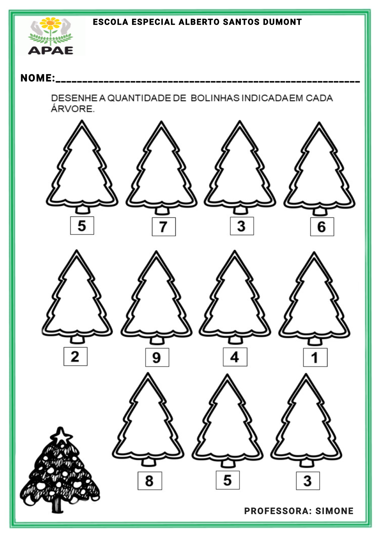ESCOLA ESPECIAL ALBERTO SANTOS DUMONT APAE NOME: DESENHE A QUANTIDADE DE BOLINHAS INDICADAEM CADA ÁRVORE. 5 7 3 6 2 9 4 1 8 5 3 PROFESSORA: SIMONE