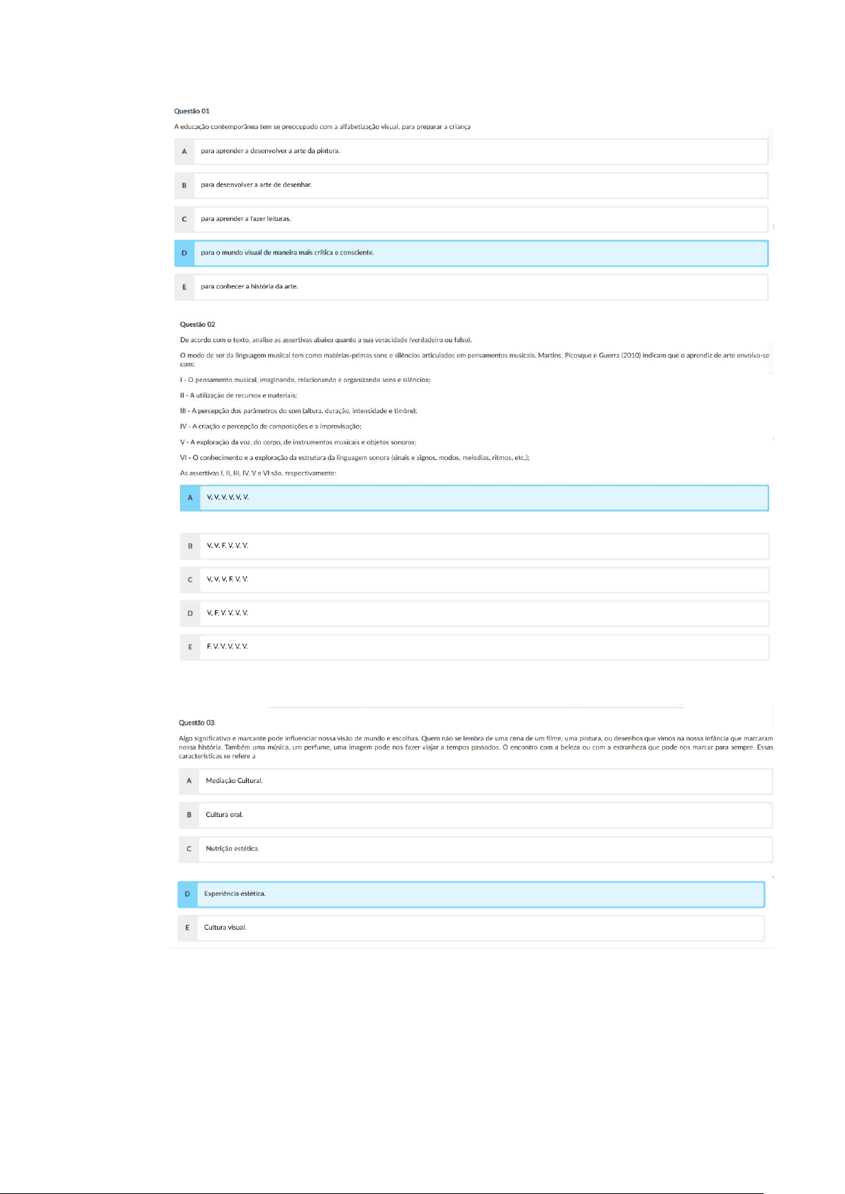 Questão 01 A educação contemporânea tem se preocupado com a alfabetização visual, para preparar a criança A para aprender a desenvolver a arte da pintura. para desenvolver a arte de desenhar. para aprender a fazer leituras. D para mundo visual de maneira mais crítica e consciente. E para conhecer a história da arte. Questão 02 De acordo com texto, analise as assertivas abaixo quanto a sua veracidade (verdadeiro ou falso). modo de ser da linguagem musical tem como matérias-primas sons e silêncios articulados em pensamentos musicais. Martins, Picosque e Guerra (2010) indicam que aprendiz de arte envolva-se com: I pensamento musical, imaginando, relacionando e organizando sons e silêncios; - A utilização de recursos e materiais: III . - A percepção dos parâmetros do som (altura, duração, intensidade e IV A criação e percepção de composições e a V - A exploração da do corpo, de instrumentos musicais e objetos sonoros; VI - conhecimento e exploração da estrutura da linguagem sonora (sinais e signos, modos, melodias, ritmos, etc.); As assertivas II. III. V e VI são, respectivamente: A V.V.V.V.V.V. V.V.F.V.V.V. V.V.V.F.V.V. D V.F.V.V.V.V. E F.V.V.V.V.V. Questão 03 Algo significativo e marcante pode influenciar nossa visão de mundo e escolhas. Quem não se lembra de uma cena de um filme, uma pintura, ou desenhos que vimos na nossa infância que marcaram nossa história. Também uma música, um perfume, uma imagem pode nos fazer viajar a tempos passados. encontro com a beleza ou com a estranheza que pode nos marcar para sempre. Essas características se refere a A Mediação Cultural. Cultura oral. Nutrição estética. D Experiência estética. E Cultura visual.Questão 04 Leia fragmento de texto e complete-o corretamente: Compreender a concepção de aprender arte por meio de leituras de obras de arte tem como objetivo refletir sobre as ideias e as aspirações de uma civilização. Neste sentido, a participação do aluno deve educador deve saber como apresentar as imagens, como planejar uma visita ao museu e como aproveitar esta experiência com seus alunos. A(s) palavra(s) que completa(m) corretamente texto é(são): A parcialmente ativa passiva de observação D passiva de observação E ativa não passiva Questão 05 Outra mudança bastante significativa nas aulas de arte foi a presença de imagens. Antes dos anos oitenta eram raros, no Brasil, relatos de educadores que trabalhavam com leituras de imagens em sala de aula. Com os estudos desenvolvidos pela professora Ana Mae Barbosa, no final dos anos de 1980, que ficou conhecido como abordagem triangular do ensino de arte, a imagem ficou cada vez mais presente nas aulas de arte, porque esta proposta metodológica previa três momentos de aprendizagem: ( Analise as assertivas abaixo quanto a sua veracidade (verdadeiro ou falso). I - leitura de obras de fazer III . contextualização; As assertivas I. e III são, respectivamente: A F.V.V: F.F.V: V.F.V: D V.V.V: E V.V.F: Questão 06 Leia, atentamente, as informações contidas nas colunas, em seguida, assinale alternativa que reune as correspondências corretas entre as informações nelas contidas. Coluna A I - Expressionismo; II - Dadaismo; III Art Pop; IV Arte conceitual; Coluna 1) no da década de 1960, os artistas questionavam crescimento de meios de comunicação de massa, como a televisão, que abriu um novo canal de divulgação de produtos para consumo. A publicidade começava a conduzir gosto desejo das pessoas por adquirirem objetos novos padrões de vida. Nesse cenário, Art Pop surgiu como um movimento artístico que se apropriava da cultura de massa com tom Nasceu na Inglaterra, espalhou se para outros e sociedade cultura dos EUA serviram de inspiração para diversos artistas que, em suas obras, questionavam estilo de vida americano; 2) manifestação artista que prima por uma arte mental, que está muito ligada ao discurso do artista à interpretação de quem aprecia. É uma arte intelectual não narrativa ou formal como mundo estava acostumado a ver antes do inicio do século XX; 3) movimento que nasceu no início do século XX. Em meio a conflitos e guerras, os artistas refletiam respeito das condições humanas da existência; 4) uma forma de fazer arte que manifestava intenção de romper fronteiras entre linguagens, delimitações de materiais ou regras na arte. se de modo em relação cultura do ocidente do do século XX em meio às contradições sociais encontradas entre avanços tecnológicos e a da guerra; A sequência CORRETA desta associação é: AII-1; III-4; IV-3; I-1; III-3; IV-4; D III-1; IV-2; E II-1; IV-3; Questão 07 Leia a afirmação a seguir sobre processo de criação, onde se omitiu uma lacuna o tipo de pensamento que também faz parte da criação. Na criação há pensamento (racional) tanto quanto há imaginação e intuição. Assinale a alternativa que preenche corretamente a lacuna: A Lógico. Esporádico. c Irreal. D Criterioso. E Complexo. Questão 08 conhecimento pela apreciação de obras de arte sejam elas pintura, escultura, música ou espetáculo de dança e teatro: I) Podem compor memórias culturais que serão essências no momento da criação também na formação do cidadão. II) Não deve compor memórias culturais, não há essência para formação do cidadão. III) Artistas sempre procuram saber sobre os assuntos que abordam em suas obras, com a criança não é diferente, é importante nutrir seu olhar e mente. Está correto que se afirma em: A apenas. apenas. c le III, apenas D III. E apenas. Questão 09 diagrama seguir representa: I III IV V VI Medida Transformação ou relação (positiva ou negativa) A A Agenda para AçãoA A Agenda para Ação diagrama de Venn Campo Conceitual das Estruturas Aditivas D diagrama da prova dos nove E movimento Matemática Moderna Questão 10 A situação problema a seguir é um exemplo de, assinale alternativa correta: Marta tem 3 camisetas (uma azul, uma preta