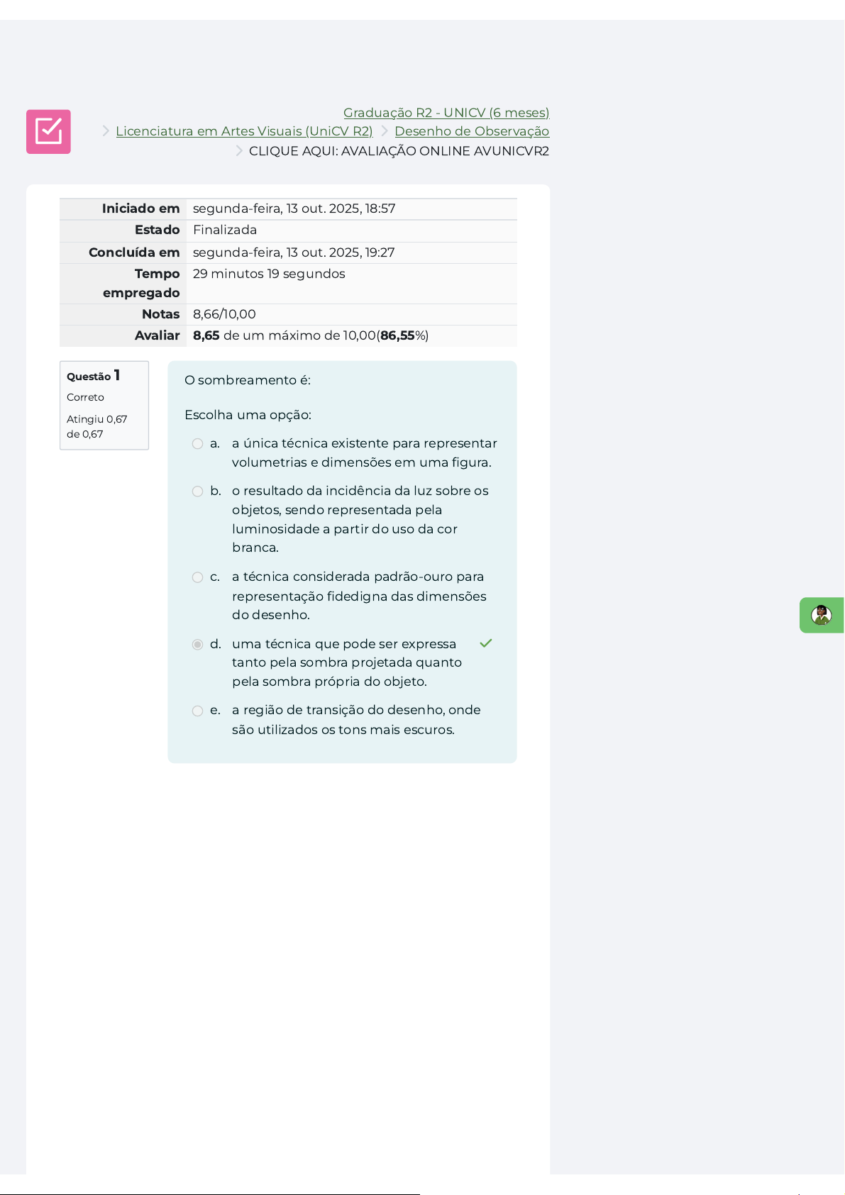 Graduação R2 - UNICV (6 meses) 〉 Licenciatura em Artes Visuais (UniCV R2) 〉 Desenho de Observação 〉 CLIQUE AQUI: AVALIAÇÃO ONLINE AVUNICVR2 Questão 1 Correto Atingiu 0,67 de 0,67 Iniciado em segunda-feira, 13 out. 2025, 18:57 Estado Finalizada Concluída em segunda-feira, 13 out. 2025, 19:27 Tempo empregado 29 minutos 19 segundos Notas 8,66/10,00 Avaliar 8,65 de um máximo de 10,00(86,55%) O sombreamento é: Escolha uma opção: a. a única técnica existente para representar volumetrias e dimensões em uma figura. b. o resultado da incidência da luz sobre os objetos, sendo representada pela luminosidade a partir do uso da cor branca. c. a técnica considerada padrão-ouro para representação fidedigna das dimensões do desenho. d. uma técnica que pode ser expressa tanto pela sombra projetada quanto pela sombra própria do objeto. ✓ e. a região de transição do desenho, onde são utilizados os tons mais escuros. https://ava.graduacaoead.unicv.edu.br/course/index.php?categoryid=125 https://ava.graduacaoead.unicv.edu.br/course/index.php?categoryid=131 https://ava.graduacaoead.unicv.edu.br/course/view.php?id=3890#section-4 Questão 2 Incorreto Atingiu 0,00 de 0,67 Avalie o desenho de observação da cafeteira abaixo e responda: o que deve-se observar quando avalia-se um desenho de observação? Escolha uma opção: a. Devemos observar se é uma reprodução fidedigna do objeto desenhado. b. Devemos observar se as formas elementares do objeto foram representadas no desenho. c. Devemos observar se as medidas estão condizentes com a realidade. × d. Devemos observar se está perfeito acabamento do desenho final. e. Devemos observar o fator estético. Questão 3 Correto Atingiu 0,67 de 0,67 Assinale a alternativa que contempla a combinação de duas regras de composição, a das Três Arestas e a dos Ímpares. Escolha uma opção: a. b. c. ✓ d. e. Questão 4 Correto Atingiu 0,67 de 0,67 Indique a opção em que a composição apresenta a relação espaço-formal Movimento Visual. Escolha uma opção: a. b. c. d. ✓ e. Questão 5 Correto Atingiu 0,67 de 0,67 Os croquis são criados: Escolha uma opção: a. quando o projeto ainda não está em fase de execução e queremos acompanhar a evolução da edificação. b. quando é necessário fazer um levantamento dos modelos de edificação que teremos à volta do local onde a futura edificação será construída. c. à mão livre, quando é necessário representar as ideias iniciais dentro da proporcionalidade adequada da futura edificação em relação ao ambiente onde será alocada. ✓ d. com objetivo único de esboçar o entorno a volta de onde a futura edificação é construída. e. com o auxílio de instrumentos de desenho técnico, que depois irão compor a edificação com elementos que representam as devidas dimensões da edificação criada. Questão 6 Correto Atingiu 0,67 de 0,67 Sobre as cinco habilidades básicas para desenhar, relacionadas com esse desenho de observação, assinale a alternativa que demonstra corretamente a percepção das bordas, dos espaços, dos relacionamentos e de luz e sombra que o desenho apresenta: Escolha uma opção: a. b. c. ✓ d. Questão 7 Correto Atingiu 0,67 de 0,67 e. Luz e sombra são elementos considerados técnicas: Escolha uma opção: a. estruturais, é a partir do uso da luz e sombra que a ideia inicial do projeto é representada graficamente. b. opcionais, é a partir de seu uso que a ideia inicial do projeto é representada graficamente. c. opcionais, inseridas conforme a necessidade estética da imagem a ser construída. d. essenciais, uma vez que é a partir de seu uso que é possível simular profundidade e compor as imagens de modo realista. ✓ e. ultrapassadas, pois não permitem que os objetos sejam dimensionados. Questão 8 Correto Atingiu 0,67 de 0,67 Questão 9 Correto Atingiu 0,67 de 0,67 Os desenhos de perspectiva podem ser criados tanto usando a projeção cônica, quanto a paralela. Assinale a alternativa que apresenta o tipo de perspectiva adotada nesse esboço arquitetônico: Escolha uma opção: a. Perspectiva cônica com um ponto de fuga. b. Perspectiva cônica com dois pontos de fuga. c. Perspectiva aérea. d. Perspectiva cavaleira. e. Perspectiva isométrica. ✓ O desenho de observação abaixo evidencia que elemento compositivo? Escolha uma opção: a. A linha. ✓ b. A superfície c. O volume. d. O ritmo. e. A assimetria. Questão 10 Correto Atingiu 0,67 de 0,67 Questão 11 Correto Atingiu 0,67 de 0,67 Complete a frase abaixo assinalando a alternativa correta. Componentes como ___________________ são considerados modos de ________________. Escolha uma opção: a. 1) semáforos e animais 2) representar o impacto que uma edificação tem no trânsito e na natureza b. 1) crianças e árvores 2) deixar a representação gráfica mais próxima dos parâmetros estéticos preconizados a partir dessa técnica de ornamentação c. 1) carros e nuvens 2) complementar os espaços livres do projeto d. 1) crianças e árvores 2) auxiliar no entendimento da proporção das edificações em relação aos demais objetos presentes no espaço urbano ✓ e. 1) pessoas e animais 2) deixar a representação gráfica correta aos olhos de profissionais da área de arquitetura É característica marcante da técnica de colagem: Escolha uma opção: a. Definição dos elementos compositivos. ✓ b. Possibilidade de revelar a cor do suporte. c. Cor preto de fundo ou figura. d. Gestual marcado. e. Imprecisão técnica. Questão 12 Correto Atingiu 0,67 de 0,67 Questão 13 Incorreto Atingiu 0,00 de 0,68 Com a técnica de pontilhismo, é possível criar desenhos sem utilizar as linhas de contorno. Entre os materiais citados abaixo, marque qual é o instrumento de desenho mais indicado para graficar os pontos nessa técnica: Escolha uma opção: a. Lápis de cor. b. Carvão. c. Gabarito. d. Caneta. ✓ e. Esfuminho. Existem diversos instrumentos que auxiliam na hora de traça
