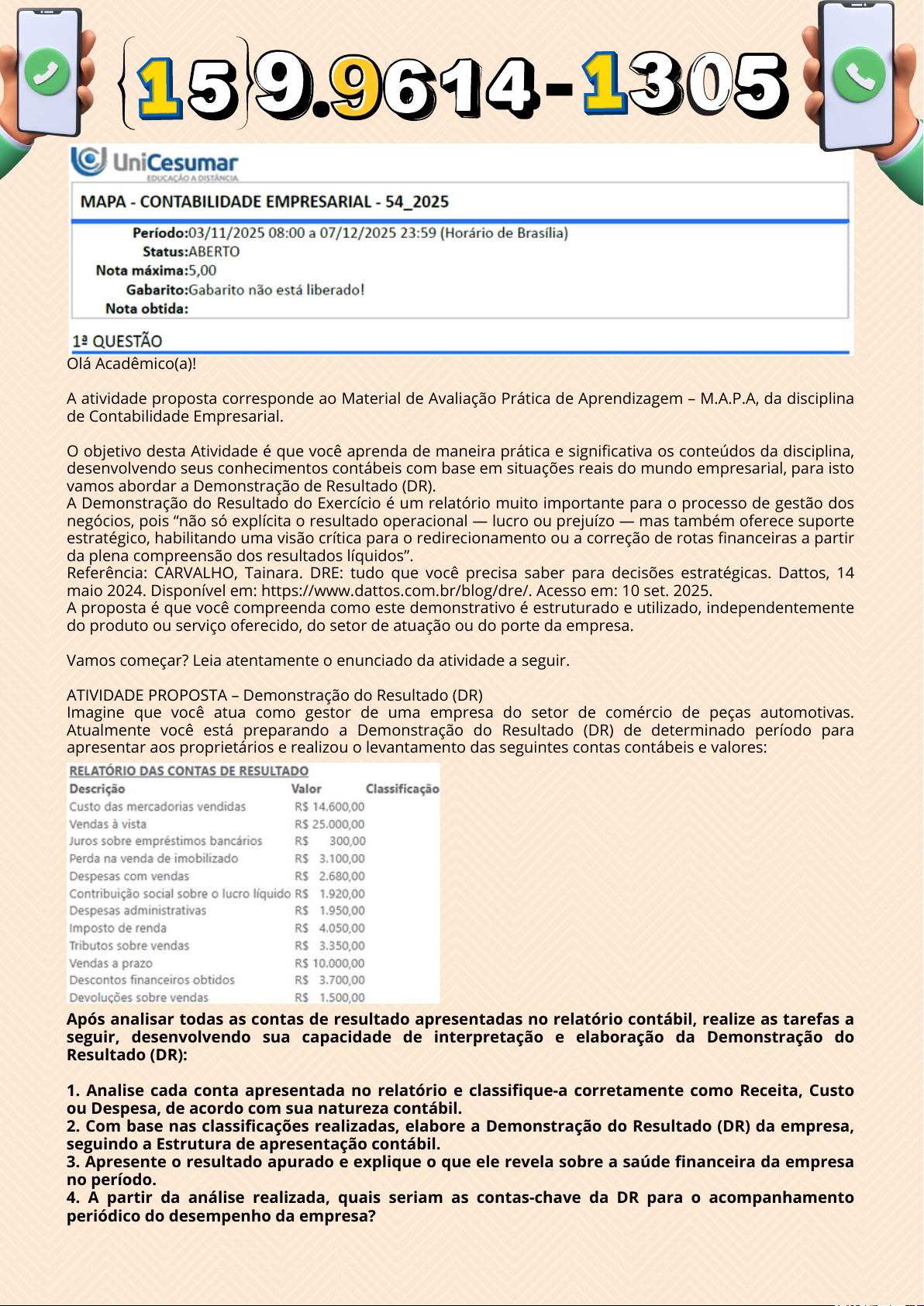 Olá Acadêmico(a)! A atividade proposta corresponde ao Material de Avaliação Prática de Aprendizagem – M.A.P.A, da disciplina de Contabilidade Empresarial. O objetivo desta Atividade é que você aprenda de maneira prática e significativa os conteúdos da disciplina, desenvolvendo seus conhecimentos contábeis com base em situações reais do mundo empresarial, para isto vamos abordar a Demonstração de Resultado (DR). A Demonstração do Resultado do Exercício é um relatório muito importante para o processo de gestão dos negócios, pois “não só explícita o resultado operacional — lucro ou prejuízo — mas também oferece suporte estratégico, habilitando uma visão crítica para o redirecionamento ou a correção de rotas financeiras a partir da plena compreensão dos resultados líquidos”. Referência: CARVALHO, Tainara. DRE: tudo que você precisa saber para decisões estratégicas. Dattos, 14 maio 2024. Disponível em: https://www.dattos.com.br/blog/dre/. Acesso em: 10 set. 2025. A proposta é que você compreenda como este demonstrativo é estruturado e utilizado, independentemente do produto ou serviço oferecido, do setor de atuação ou do porte da empresa. Vamos começar? Leia atentamente o enunciado da atividade a seguir. ATIVIDADE PROPOSTA – Demonstração do Resultado (DR) Imagine que você atua como gestor de uma empresa do setor de comércio de peças automotivas. Atualmente você está preparando a Demonstração do Resultado (DR) de determinado período para apresentar aos proprietários e realizou o levantamento das seguintes contas contábeis e valores: -. Após analisar todas as contas de resultado apresentadas no relatório contábil, realize as tarefas a seguir, desenvolvendo sua capacidade de interpretação e elaboração da Demonstração do Resultado (DR): 1. Analise cada conta apresentada no relatório e classifique-a corretamente como Receita, Custo ou Despesa, de acordo com sua natureza contábil. 2. Com base nas classificações realizadas, elabore a Demonstração do Resultado (DR) da empresa, seguindo a Estrutura de apresentação contábil. 3. Apresente o resultado apurado e explique o que ele revela sobre a saúde financeira da empresa no período. 4. A partir da análise realizada, quais seriam as contas-chave da DR para o acompanhamento periódico do desempenho da empresa?