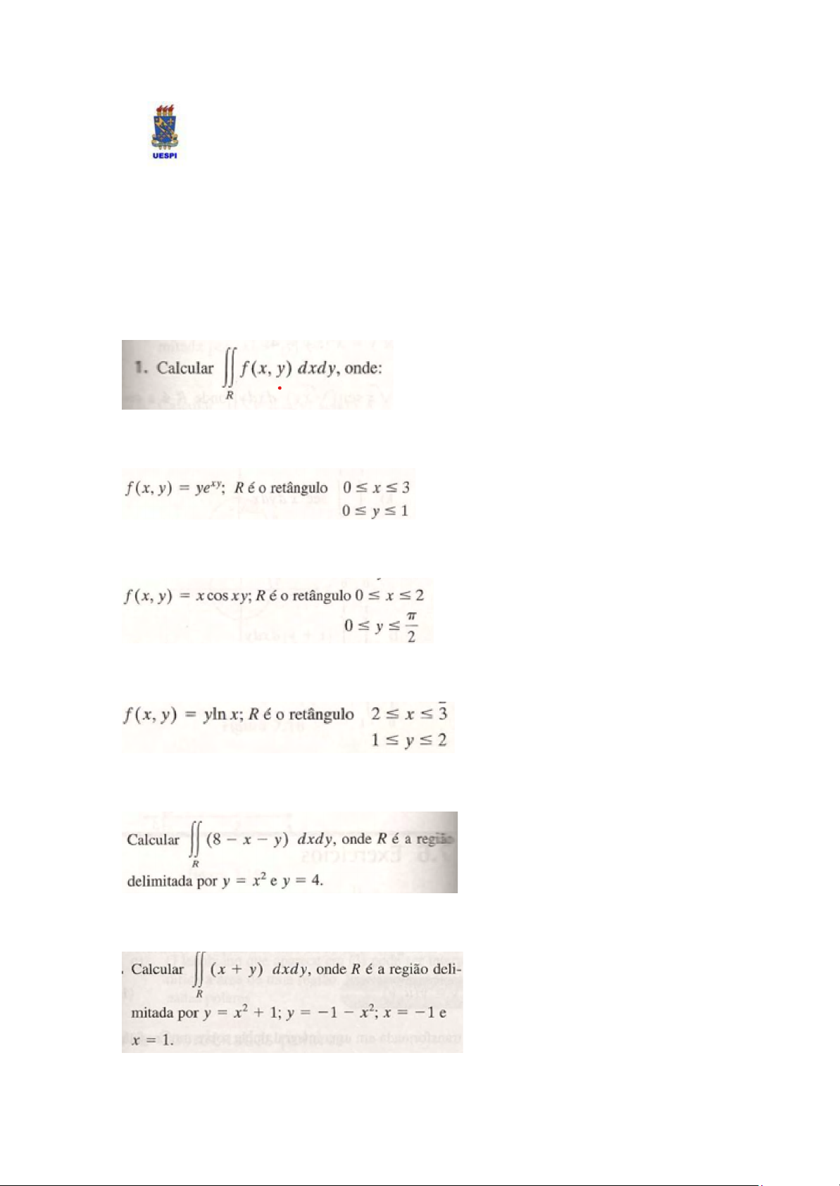 Universidade Estadual do Piauí – UESPI Curso: Licenciatura Plena em Matemática Disciplina: Cálculo III – C.H. 90h/a Professora: Lilane de Araújo Mendes Brandão - LISTA DE EXERCÍCIOS - INTEGRAIS DUPLAS 01) a) b) c) 2) 3) 4) 5) BOA SORTE!!!