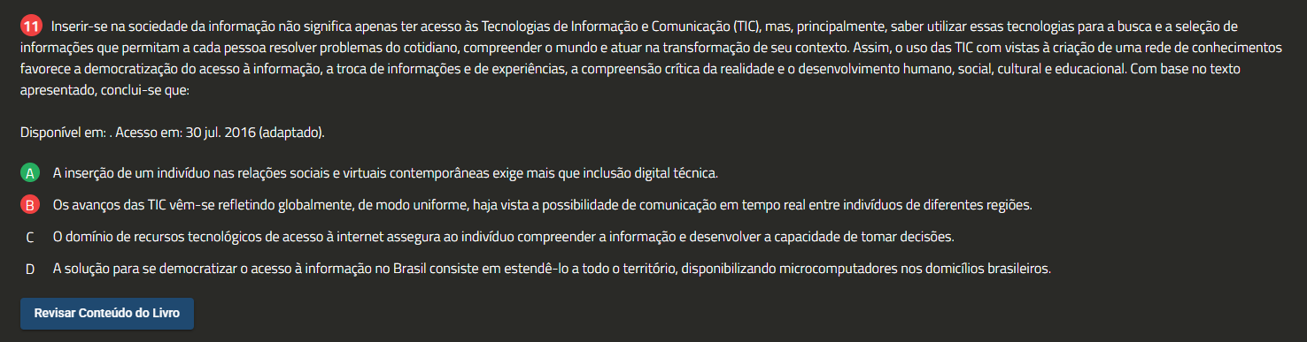 11 Inserir-se na sociedade da informação não significa apenas ter acesso às Tecnologias de Informação e Comunicação (TIC), mas, principalmente, saber utilizar essas tecnologias para a busca e a seleção de informações que permitam a cada pessoa resolver problemas do cotidiano, compreender 0 mundo e atuar na transformação de seu contexto. Assim, 0 das TIC com vistas à criação de uma rede de conhecimentos favorece a democratização do acesso à informação, a troca de informações e de experiências, a compreensão crítica da realidade e 0 desenvolvimento humano, social, cultural e educacional. Com base no texto apresentado, conclui-se que: Disponível em: Acesso em: 30 jul. 2016 (adaptado). A A inserção de um indivíduo nas relações sociais e virtuais contemporâneas exige mais que inclusão digital técnica. Os avanços das TIC vêm-se refletindo globalmente, de modo uniforme, haja vista a possibilidade de comunicação em tempo real entre indivíduos de diferentes regiões. 0 domínio de recursos tecnológicos de acesso à internet assegura ao indivíduo compreender a informação e desenvolver a capacidade de tomar decisões. D A solução para se democratizar 0 acesso à informação no Brasil consiste em estendê-lo a todo 0 território, disponibilizando microcomputadores nos brasileiros. Revisar Conteúdo do Livro
