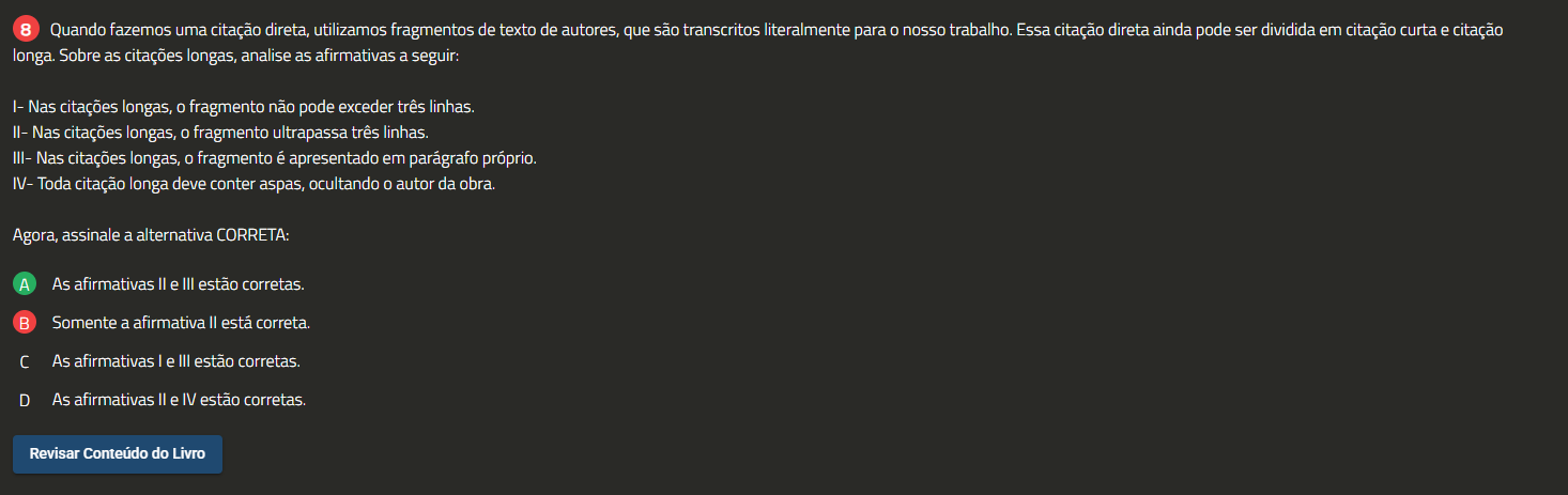 8 Quando fazemos uma citação direta, utilizamos fragmentos de texto de autores, que são transcritos literalmente para 0 nosso trabalho. Essa citação direta ainda pode ser dividida em citação curta e citação longa. Sobre as citações longas, analise as afirmativas a seguir: I- Nas citações longas, fragmento não pode exceder três linhas. II- Nas citações longas, 0 fragmento ultrapassa três linhas. III- Nas citações longas, 0 fragmento é apresentado em parágrafo próprio. IV- Toda citação longa deve conter aspas, ocultando 0 autor da obra. Agora, assinale a alternativa CORRETA: A As afirmativas II e III estão corretas. Somente a afirmativa II está correta. As afirmativas I e III estão corretas. D As afirmativas e IV estão corretas. Revisar Conteúdo do Livro