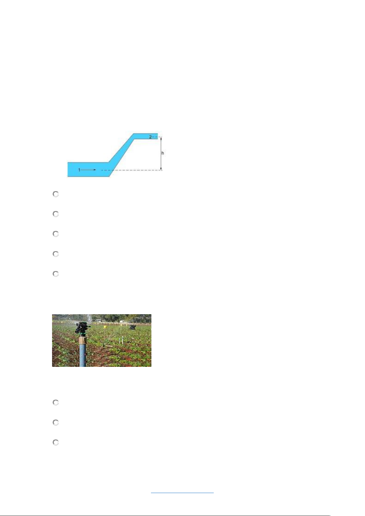 NOME: DATA: Exercício de Equação da continuidade – Equação de Bernoulli - Física 2ª série do EM 1. 1) (UFMS) Água escoa em uma tubulação, onde a região 2 situa-se a uma altura h acima da região 1, conforme figura a seguir. É correto afirmar que: · a) a pressão cinética é maior na região 1. · b) a vazão é a mesma nas duas regiões. · c) a pressão estática é maior na região 2. · d) a velocidade de escoamento é maior na região 1. · e) a pressão em 1 é menor do que a pressão em 2. 2) (UFSM-RS) Em uma cultura irrigada por um cano que tem área de secção reta de 100 cm2, passa água com uma vazão de 7200 litros por hora. A velocidade de escoamento da água nesse cano, em m/s, é · a) 0,02 · b) 0,2 · c) 2 · d) 20 · e) 200 3) (UNAMA-PA) Uma piscina, cujas dimensões são 18m.10m.2m, está vazia. O tempo necessário para enchê-la é 10 h, através de um conduto de seção A = 25 cm2. A velocidade da água, admitida constante, ao sair do conduto, terá módulo igual a: · a) 1 m/s · b) 2 km/s · c) 3 cm/min · d) 4 m/s · e) 5 km/s 4) (UFSM-RS) Observe a figura que representa um vaporizador simples. Sabendo que, normalmente, o herbicida líquido é vaporizado sobre a plantação, um jato de ar, passando por A, ocasiona, nesse ponto, um __________ na pressão quando comparado com B, onde o ar está __________. Então, o líquido sobe pelo conduto porque sempre se desloca da __________ pressão. Assinale a alternativa que completa corretamente as lacunas. · a) acréscimo – em movimento – menor para a maior · b) abaixamento – em movimento – maior para a menor · c) acréscimo – praticamente parado – menor para a maior · d) acréscimo – em movimento – maior para a menor · e) abaixamento – praticamente parado – maior para a menor 5) (UFSM-RS) Vaporizadores semelhantes ao da figura são usados em nebulização. Ao pressionar a bexiga do vaporizador, o ar no seu interior é projetado com velocidade de módulo VB > 0, enquanto o líquido permanece em repouso em A. A relação entre as pressões em A e B é · a) PA = PB · b) PA + PB = 0 · c) PA > PB · d) PA