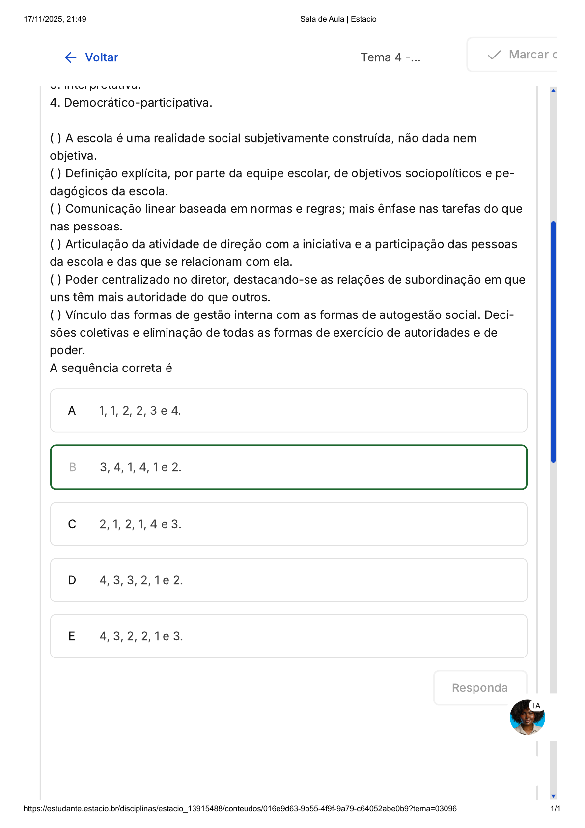 Cursando: Pedagogia Estágio Supervisionado em Gestão Escolar 81% Informações da disciplina Como o progresso é calculado Minhas notas Conteúdos 13 / 16 Concluídos 81% Trabalhos Tutoria A Olá ADRIANA GUIMARÃES Tema 4 -… 3. Interpretativa. 4. Democrático-participativa. ( ) A escola é uma realidade social subjetivamente construída, não dada nem objetiva. ( ) Definição explícita, por parte da equipe escolar, de objetivos sociopolíticos e pe- dagógicos da escola. ( ) Comunicação linear baseada em normas e regras; mais ênfase nas tarefas do que nas pessoas. ( ) Articulação da atividade de direção com a iniciativa e a participação das pessoas da escola e das que se relacionam com ela. ( ) Poder centralizado no diretor, destacando-se as relações de subordinação em que uns têm mais autoridade do que outros. ( ) Vínculo das formas de gestão interna com as formas de autogestão social. Deci- sões coletivas e eliminação de todas as formas de exercício de autoridades e de poder. A sequência correta é A 1, 1, 2, 2, 3 e 4. B 3, 4, 1, 4, 1 e 2. C 2, 1, 2, 1, 4 e 3. D 4, 3, 3, 2, 1 e 2. E 4, 3, 2, 2, 1 e 3. Responda Voltar Marcar c IA 17/11/2025, 21:49 Sala de Aula | Estacio https://estudante.estacio.br/disciplinas/estacio_13915488/conteudos/016e9d63-9b55-4f9f-9a79-c64052abe0b9?tema=03096 1/1