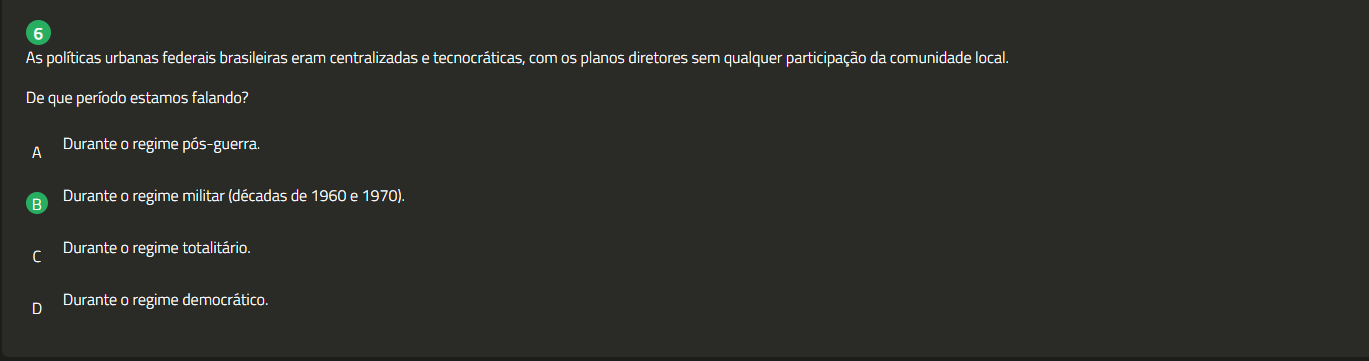 6 As políticas urbanas federais brasileiras eram centralizadas e tecnocráticas, com planos diretores sem qualquer participação da comunidade local. De que período estamos falando? A Durante 0 regime pós-guerra. B Durante 0 regime militar (décadas de 1960 e 1970). Durante 0 regime totalitário. D Durante regime democrático.
