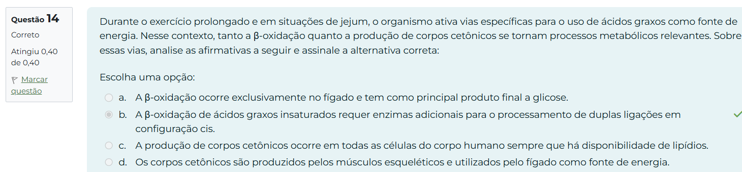 Questão 14 Durante exercício prolongado e em situações de jejum, organismo ativa vias específicas para O uso de ácidos graxos como fonte de Correto energia. Nesse contexto, tanto a quanto a produção de corpos cetônicos se tornam processos metabólicos relevantes. Sobre Atingiu 0,40 essas vias, analise as afirmativas a seguir e assinale a alternativa correta: de 0,40 P Marcar Escolha uma opção: questão a. A ocorre exclusivamente no fígado e tem como principal produto final a glicose. b. A de ácidos graxos insaturados requer enzimas adicionais para O processamento de duplas ligações em configuração cis. C. A produção de corpos cetônicos ocorre em todas as células do corpo humano sempre que há disponibilidade de lipídios. d. Os corpos cetônicos são produzidos pelos músculos esqueléticos e utilizados pelo fígado como fonte de energia.