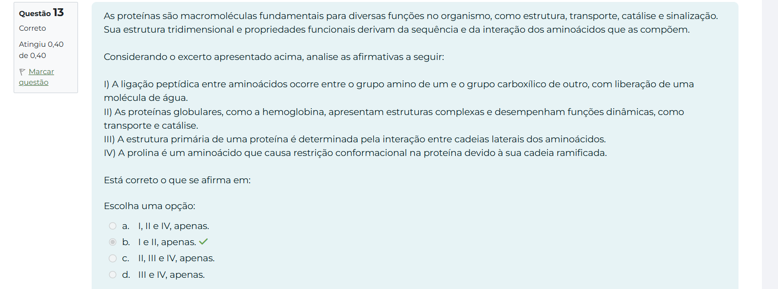 Questão 13 As proteínas são macromoléculas fundamentais para diversas funções no organismo, como estrutura, transporte, catálise e sinalização. Correto Sua estrutura tridimensional e propriedades funcionais derivam da sequência e da interação dos aminoácidos que as compõem. Atingiu 0,40 de 0,40 Considerando O excerto apresentado acima, analise as afirmativas a seguir: P Marcar questão I) A ligação peptídica entre aminoácidos ocorre entre O grupo amino de um e O grupo carboxílico de outro, com liberação de uma molécula de água. II) As proteínas globulares, como a hemoglobina, apresentam estruturas complexas e desempenham funções dinâmicas, como transporte e catálise. III) A estrutura primária de uma proteína é determinada pela interação entre cadeias laterais dos aminoácidos. IV) A prolina é um aminoácido que causa restrição conformacional na proteína devido à sua cadeia ramificada. Está correto que se afirma em: Escolha uma opção: a. I, II e IV, apenas. b. le II, apenas. C. II, III e IV, apenas. d. III e IV, apenas.
