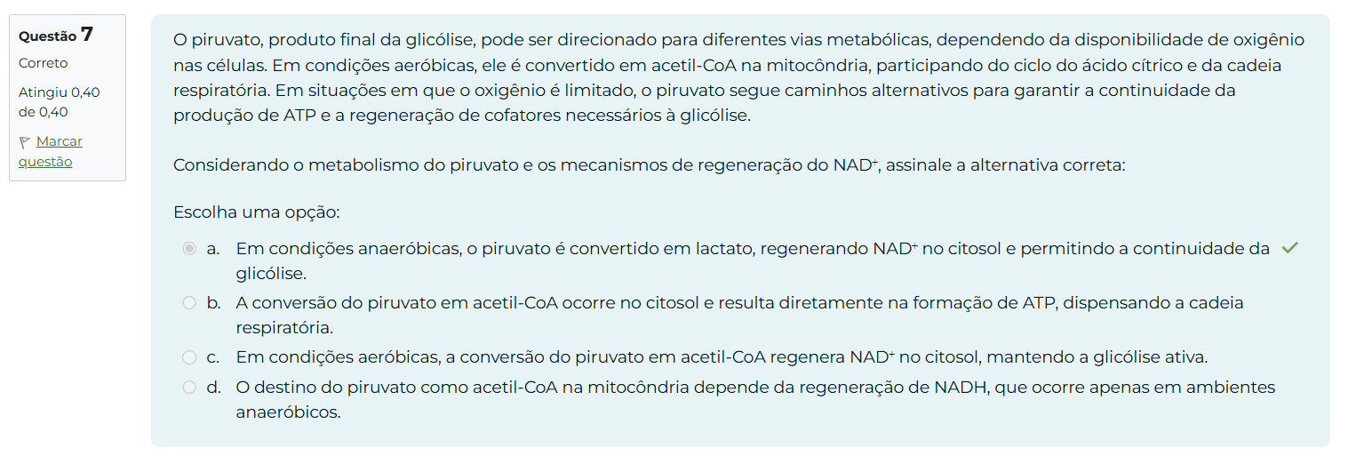 Questão 7 piruvato, produto final da glicólise, pode ser direcionado para diferentes vias metabólicas, dependendo da disponibilidade de oxigênio Correto nas células. Em condições aeróbicas, ele é convertido em acetil-CoA na mitocôndria, participando do ciclo do ácido cítrico e da cadeia Atingiu 0,40 respiratória. Em situações em que O oxigênio é limitado, O piruvato segue caminhos alternativos para garantir a continuidade da de 0,40 produção de ATP e a regeneração de cofatores necessários à glicólise. P Marcar questão Considerando O metabolismo do piruvato e mecanismos de regeneração do NAD+, assinale a alternativa correta: Escolha uma opção: a. Em condições anaeróbicas, piruvato é convertido em lactato, regenerando NAD+ no citosol e permitindo a continuidade da glicólise. b. A conversão do piruvato em acetil-CoA ocorre no citosol e resulta diretamente na formação de dispensando a cadeia respiratória. C. Em condições aeróbicas, a conversão do piruvato em acetil-CoA regenera NAD+ no citosol, mantendo a glicólise ativa. d. O destino do piruvato como acetil-CoA na mitocôndria depende da regeneração de NADH, que ocorre apenas em ambientes anaeróbicos.
