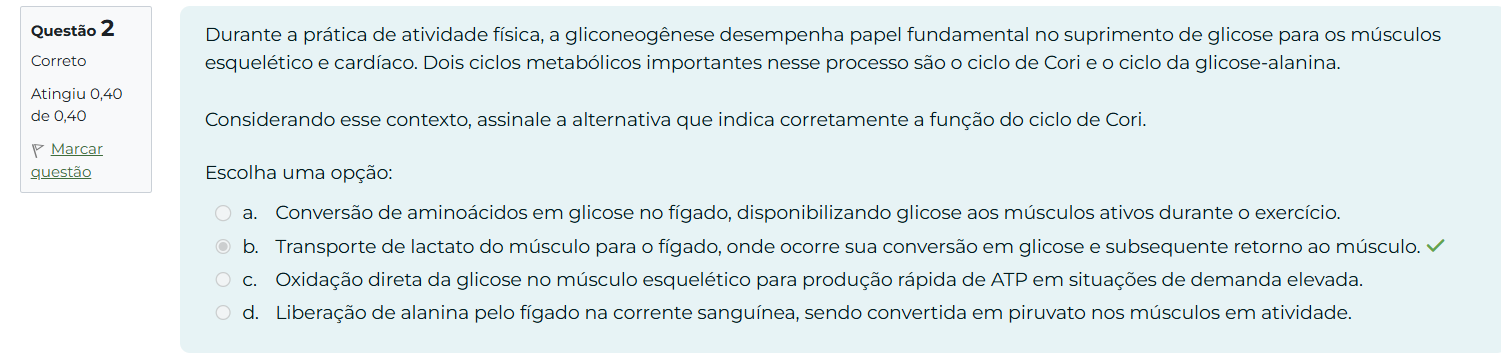 Questão 2 Durante a prática de atividade física, a gliconeogênese desempenha papel fundamental no suprimento de glicose para músculos Correto esquelético e cardíaco. Dois ciclos metabólicos importantes nesse processo são O ciclo de Cori e O ciclo da glicose-alanina. Atingiu 0,40 de 0,40 Considerando esse contexto, assinale a alternativa que indica corretamente a função do ciclo de Cori. Marcar questão Escolha uma opção: a. Conversão de aminoácidos em glicose no fígado, disponibilizando glicose aos músculos ativos durante exercício. b. Transporte de lactato do músculo para O fígado, onde ocorre sua conversão em glicose e subsequente retorno ao músculo. C. Oxidação direta da glicose no músculo esquelético para produção rápida de ATP em situações de demanda elevada. d. Liberação de alanina pelo fígado na corrente sanguínea, sendo convertida em piruvato nos músculos em atividade.
