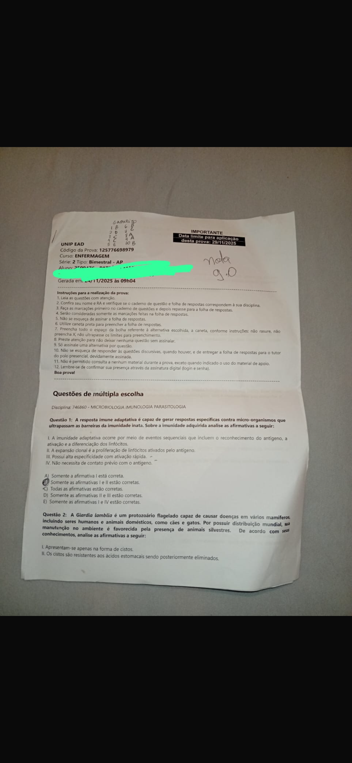 GABARITO 6 IMPORTANTE Data limite para aplicação UNIP EAD 10B desta prova: 29/11/2025 Código da Prova: 125776698979 Curso: ENFERMAGEM nota Série: 2 Tipo: Bimestral AP Aluno: 9.0 Gerada em. 11/2025 às 09h04 Instruções para a realização da prova: 1. Leia as questões com atenção. 2. Confira seu nome e RA e verifique se 0 caderno de questão e folha de respostas correspondem sua disciplina. 3. Faça as marcações primeiro no de questões e depois repasse para a folha de respostas. 4. Serão consideradas somente as marcações feitas na folha de respostas. 5. Não se esqueça de assinar a folha de respostas. 6. Utilize caneta preta para preencher a folha de respostas. 7. Preencha todo espaço da bolha referente à alternativa escolhida, a caneta, conforme instruções: não rasure, não preencha X, não ultrapasse limites para preenchimento. 8. Preste atenção para não deixar nenhuma questão sem assinalar. 9. Só assinale uma alternativa por questão. 10. Não se esqueça de responder as questões discursivas, quando houver, e de entregar a folha de respostas para 0 tutor do polo presencial, devidamente assinada. 11. Não é permitido consulta a nenhum material durante a prova, exceto quando indicado uso do material de apoio. 12. Lembre-se de confirmar sua presença através da assinatura digital (login e senha). Boa proval Questões de múltipla escolha Disciplina: 746860 MICROBIOLOGIA IMUNOLOGIA PARASITOLOGIA Questão 1: A resposta imune adaptativa é capaz de gerar respostas específicas contra micro-organismos que ultrapassam as barreiras da imunidade inata. Sobre a imunidade adquirida analise as afirmativas a seguir: A imunidade adaptativa ocorre por meio de eventos sequenciais que incluem reconhecimento do a ativação e a diferenciação dos linfócitos. A expansão clonal é a proliferação de linfócitos ativados pelo antigeno. III. Possui alta especificidade com ativação rápida. IV. Não necessita de contato prévio com antigeno. A) Somente a afirmativa I está correta. Somente as afirmativas e estão corretas. Todas as afirmativas estão corretas. D) Somente as afirmativas e estão corretas. E) Somente as afirmativas I e IV estão corretas. Questão 2: A Giardia lamblia é um protozoário flagelado capaz de causar doenças em vários mamiferos, incluindo seres humanos e animais domésticos, como cães e gatos. Por possuir distribuição mundial, sua manutenção no ambiente favorecida pela presença de animais silvestres. De acordo com seus conhecimentos, analise as afirmativas a seguir: Apresentam-se apenas na forma de cistos. Os cistos são resistentes aos ácidos estomacais sendo posteriormente eliminados.