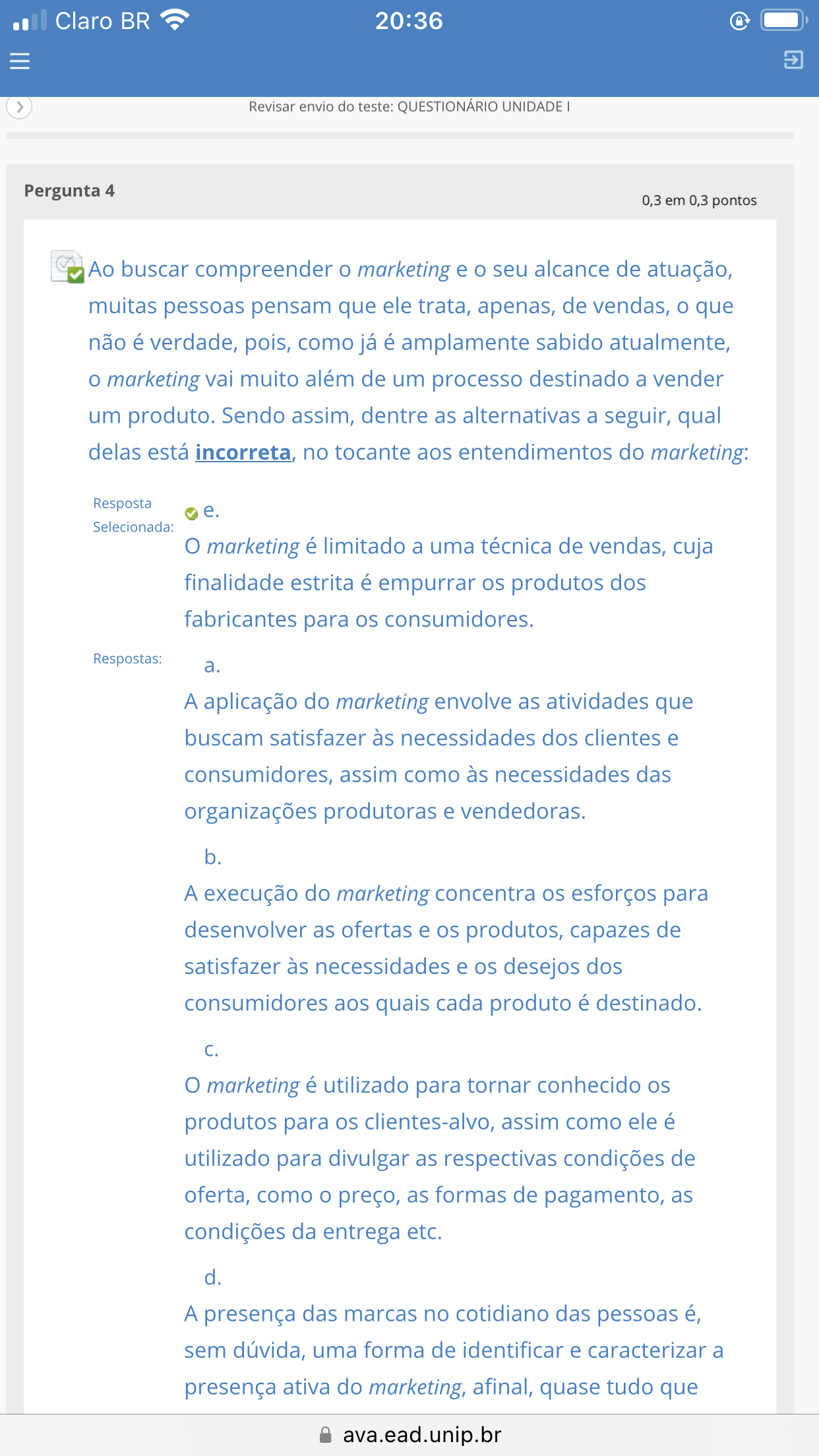 Claro BR 20:36 Revisar envio do teste: QUESTIONÁRIO UNIDADE Pergunta 4 0,3 em 0,3 pontos Ao buscar compreender marketing e seu alcance de atuação, muitas pessoas pensam que ele trata, apenas, de vendas, o que não é verdade, pois, como já é amplamente sabido atualmente, marketing vai muito além de um processo destinado a vender um produto. Sendo assim, dentre as alternativas a seguir, qual delas está incorreta, no tocante aos entendimentos do marketing: Resposta e. Selecionada: marketing é limitado a uma técnica de vendas, cuja finalidade estrita é empurrar os produtos dos fabricantes para os consumidores. Respostas: a. A aplicação do marketing envolve as atividades que buscam satisfazer às necessidades dos clientes e consumidores, assim como às necessidades das organizações produtoras e vendedoras. b. A execução do marketing concentra os esforços para desenvolver as ofertas e os produtos, capazes de satisfazer às necessidades e os desejos dos consumidores aos quais cada produto é destinado. C. marketing é utilizado para tornar conhecido os produtos para os clientes-alvo, assim como ele é utilizado para divulgar as respectivas condições de oferta, como preço, as formas de pagamento, as condições da entrega etc. d. A presença das marcas no cotidiano das pessoas é, sem dúvida, uma forma de identificar e caracterizar a presença ativa do marketing, afinal, quase tudo que ava.ead.unip.br