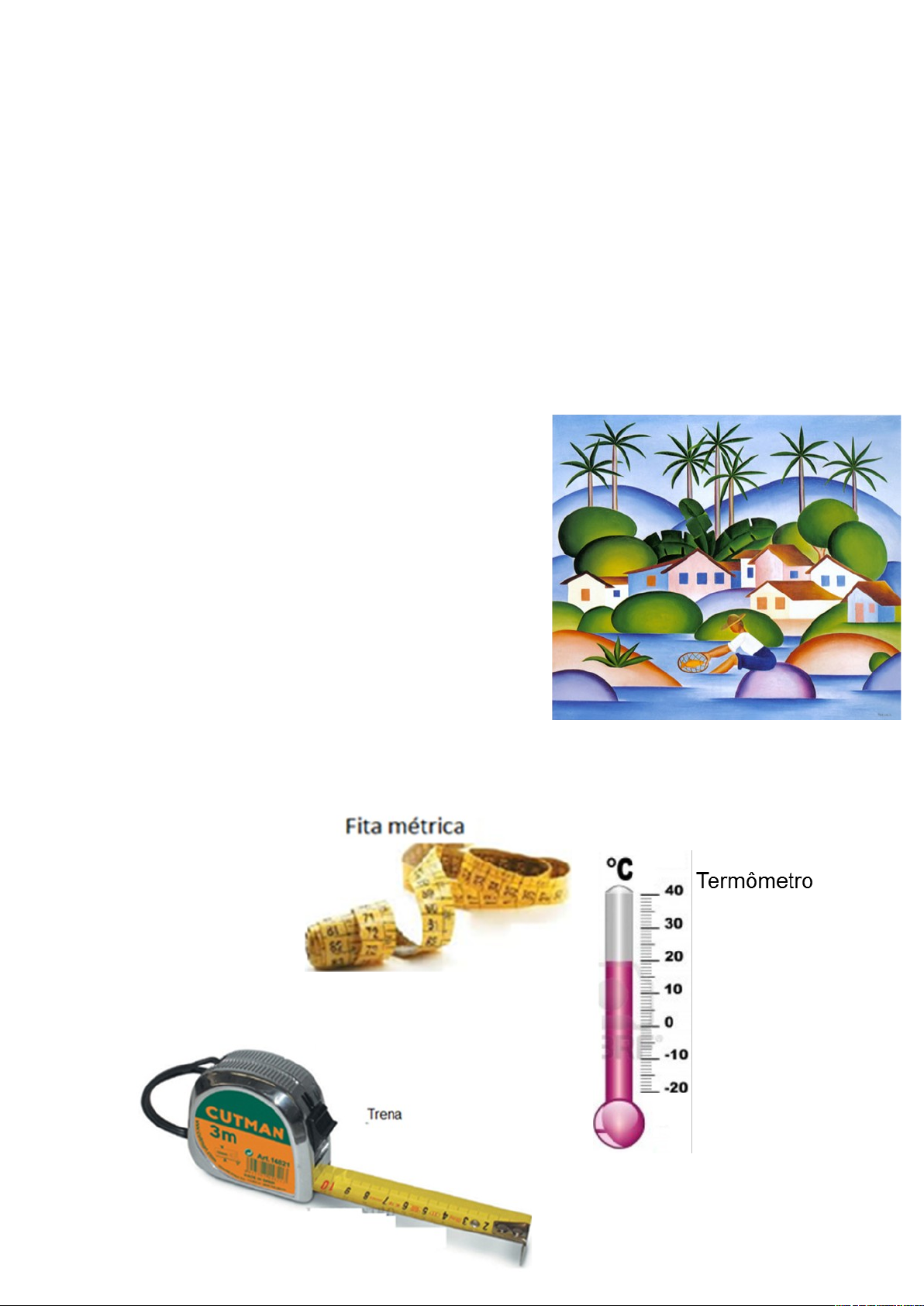 Medidas de comprimento Questão 1 Um serralheiro precisa partir uma barra de ferro com 8 metros em 4 pedaços do mesmo tamanho. Quanto medirá cada pedaço? A) 2 metros; B) 4 metros; C) 6 metros; D) 8 metros. Questão 2 Observe abaixo a obra da artista brasileira Tarsila do Amaral intitulada como “O Pescador” (1925). Sabendo que a tela mede 66 X 75cm, determine: Quantos metros de moldura serão necessários para emoldurar a tela? A) 141 cm B) 280 cm C) 282 cm D) 290 cm Questão 3 Observe os instrumentos de medição abaixo: Quais são os instrumentos utilizados para medir comprimento? A) Fita métrica e termômetro; B) Fita métrica e trena; C) Termômetro e trena; D) Fita métrica, termômetro e trena. Questão 4 Quando viajamos, muitas vezes observamos nas estradas placas que indicam a distância dos lugares. O quilômetro (km) é uma medida muito utilizada para falar de grandes distâncias, por isso é tão comum ser utilizada em placas de estradas. O quilômetro é um múltiplo do metro. 1 Km é igual a 1000 metros. Analisando a indicação da placa, responda: Um viajante que tenha chegado a Vassouras, terá que percorrer quantos quilômetros ainda, para chegar a Três Rios? A) 5 B) 52 C) 59 D) 64 Questão 5 A tabela mostra as distâncias, em quilômetros, entre algumas capitais de estado e a capital do país, Brasília. Quantos quilômetros São Paulo está mais próximo de Brasília do que Porto Alegre? A) 24 km B) 135 km C) 483 km D) 1036 km Questão 6 O gráfico mostra as distâncias, em quilômetros, entre algumas capitais de estado e a capital do país, Brasília. Qual é a capital que está mais próxima de Brasília? A) Natal B) Porto Alegre C) São Paulo D) Vitória Questão 7 Soltar pipa é uma mania nacional. A brincadeira atrai adultos e crianças. Mas, infelizmente, por causa do uso do cerol, essa brincadeira já tirou a vida de muita gente, principalmente de motoqueiros. Em algumas cidades já existem leis que proíbem soltar pipas com cerol. Na imagem, dois amigos estão se preparando para empinar uma pipa. Um dos amigos verificou que a rabiola tem 1 metro. Pense e responda: Quantos centímetros cabem em 1 metro? A) 1 cm B) 10 cm C) 100 cm D) 1000 cm Questão 8 O Estádio Olímpico João Havelange, também denominado, a partir de 2010, Stadium Rio, é conhecido popularmente como Engenhão. É um estádio poliesportivo localizado no antigo terreno da Rede Ferroviária Federal, localizado no bairro do Engenho de Dentro, na cidade do Rio de Janeiro. Considerando que o terreno do estádio tenha a dimensão de 500 metros de frente por 500 metros de lateral, determine o perímetro do terreno. A) 100 metros B) 500 metros C) 1000 metros D) 2000 metros Questão 9 O arremesso de peso é uma modalidade olímpica de atletismo, onde os atletas competem para arremessar uma bola o mais longe possível. Na categoria masculina a bola pesa 7,26 kg. O recorde mundial é de Randy Barnes com a marca de 23,12 metros. A tabela ao lado mostra o resultado de alguns atletas ao longo das últimas Olimpíadas. Atleta Distância Christian 22,03 m Randy 23,12 m Reese 22,04 m Wener 22,23 m Observe a tabela e responda: Quantos metros Randy conseguiu arremessar a mais que Christian? A) 0,04 m B) 0,89 m C) 1,08 m D) 1,09 m Questão 10 O futebol é um esporte de equipe jogado entre dois times de 11 jogadores cada um e um árbitro que se ocupa da correta aplicação das normas. É considerado o esporte mais popular do mundo, pois cerca de 270 milhões de pessoas participam das suas várias competições. Observe as dimensões do campo e determine seu perímetro. A) 68 metros B) 105 metros C) 173 metros D) 346 metros GABARITO: (D) Questão 11 Um pedreiro quer colocar cerâmica numa cozinha retangular que mede 8 metros de comprimento por 5 metros de largura. Para que não falte e nem sobre material, ele precisa calcular a área da cozinha para comprar a quantidade certa de cerâmica. Qual é a área da cozinha? A) 40 m² B) 26 m² C) 13 m² Questão 12 Um agricultor plantou verduras numa horta retangular com 40 m de largura e cercou toda a horta, gastando 130 m de tela de arame. Qual é a medida do comprimento da horta? A) 25 m B) 40 m C) 80 m D) 130 m image4.png image5.png image6.png image7.png image8.png image9.png image1.png image2.png image3.png
