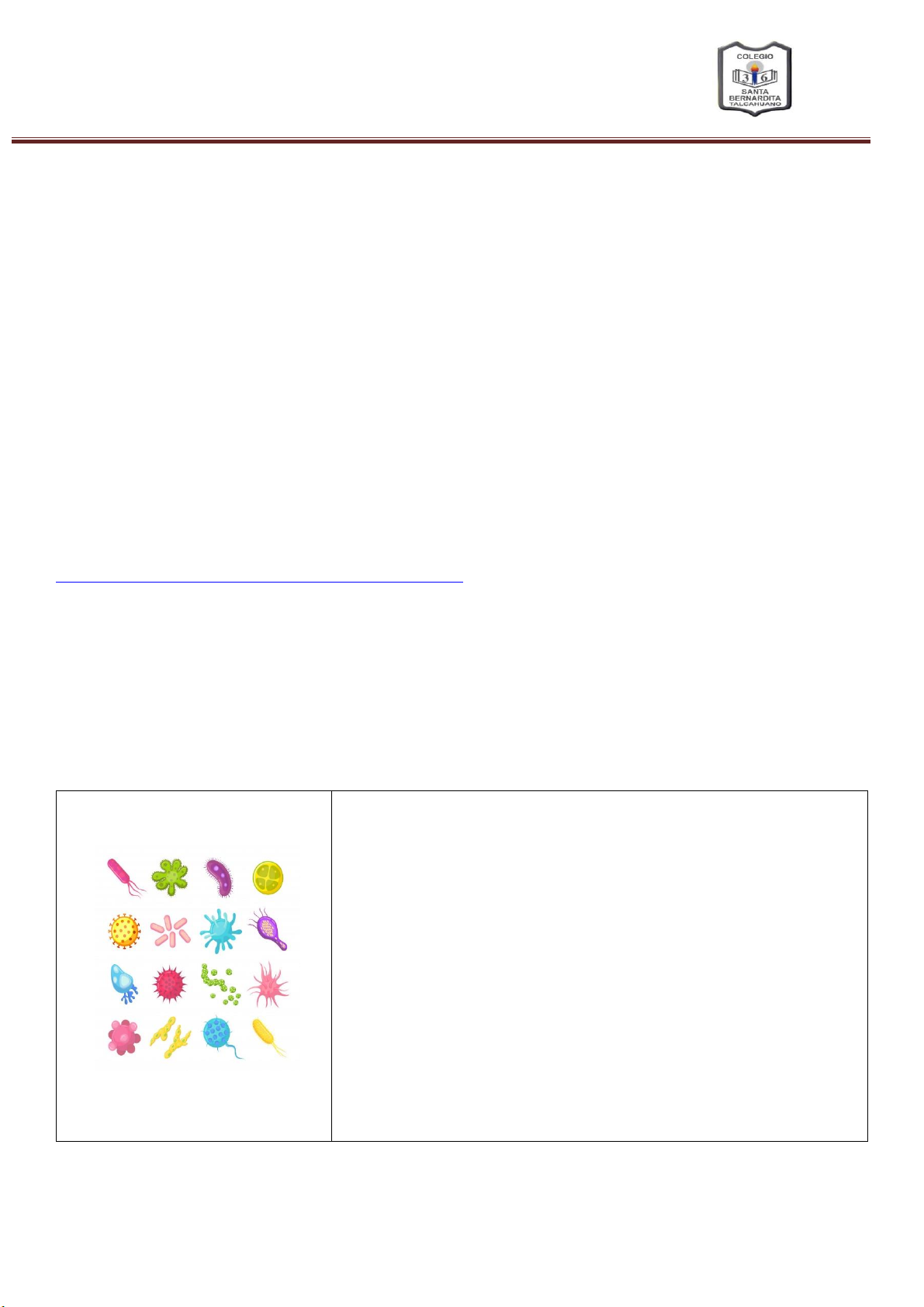 FUNDACIÓN EDUCACIONAL SANTA BERNARDITA TALCAHUANO ASIGNATURA: Ciencias Naturales PROFESORA: Alejandra Burgos Ávila NIVEL: 7-A 1 Actividades: Microorganismos y Células. Indicadores de Logro: Comparan células eucariontes con procariontes mediante la presencia de núcleo, tamaños, formas, sistemas de endomembranas y pared celular, entre otras características Instrucciones: Instrucciones: Estimado estudiante junto con enviarte un cariñoso saludo, espero que tu salud y la de tu familia este bien y libre de síntomas del COVID-19. Te envío esta serie de actividades para que en tu casa refuerces los contenidos que corresponden a la unidad que comenzamos a estudiar. Y para comenzar primero debes observar detenidamente el siguiente video: https://www.youtube.com/watch?v=UML5tydiYN0 el que te ayudara a refrescar los contenidos estudiados. Finalmente y luego visitar las páginas web indicadas y desarrollar la guía debes recordar que esta guía deberá venir junto con tu cuaderno y la revisaremos cuando las clases sean retomadas. 1. Responda la siguiente pregunta ¿Cómo nos relacionamos con los microorganismos? entregue un ejemplo concreto al respecto. Nombre: ______________________________________________________________ Curso: 7º A Fecha: ____________ https://www.youtube.com/watch?v=UML5tydiYN0 FUNDACIÓN EDUCACIONAL SANTA BERNARDITA TALCAHUANO ASIGNATURA: Ciencias Naturales PROFESORA: Alejandra Burgos Ávila NIVEL: 7-A 2 2. ¿Cómo se llama los microorganismos que potencialmente tienen la capacidad de enfermarnos? 3. Investigue y explique qué es la microbiota intestinal, en qué parte específica de nuestro organismo se ubica y cuáles microorganismo existen allí. 4. Observe el siguiente link https://www.youtube.com/watch?time_continue=67&v=3U8XVkj8Pz4&feature =emb_title y respecto de lo estudiando en clases explique ¿Cuáles son las similitudes y diferencias de estos microorganismos? Similitudes Diferencias https://www.youtube.com/watch?time_continue=67&v=3U8XVkj8Pz4&feature=emb_title https://www.youtube.com/watch?time_continue=67&v=3U8XVkj8Pz4&feature=emb_title FUNDACIÓN EDUCACIONAL SANTA BERNARDITA TALCAHUANO ASIGNATURA: Ciencias Naturales PROFESORA: Alejandra Burgos Ávila NIVEL: 7-A 3 5. Lea el siguiente texto y respecto de la actividad anterior responda: Los coronavirus son una extensa familia de virus que pueden causar enfermedades. El coronavirus que se ha descubierto más recientemente causa la enfermedad por coronavirus COVID-19. Tanto el nuevo virus como la enfermedad eran desconocidos antes de que estallara el brote en Wuhan (China) en diciembre de 2019. Una persona puede contraer la COVID-19 por contacto con otra que esté infectada por el virus. La enfermedad puede propagarse de persona a persona a través de las gotículas procedentes de la nariz o la boca que salen despedidas cuando una persona infectada tose o exhala. Estas gotículas caen sobre los objetos y superficies que rodean a la persona, de modo que otras personas pueden contraer la COVID-19 si tocan estos objetos o superficies y luego se tocan los ojos, la nariz o la boca. También pueden contagiarse si inhalan las gotículas que haya esparcido una persona con COVID-19 al toser o exhalar. Por eso es importante mantenerse a más de 1 metro de distancia de una persona que se encuentre enferma. Fuente OMS ¿Por qué el COVID-19 utiliza nuestras células para reproducirse? ¿Por qué es tan importante que las personas realicen la cuarentena y así no tengan contacto con personas infectadas con COVID-19? FUNDACIÓN EDUCACIONAL SANTA BERNARDITA TALCAHUANO ASIGNATURA: Ciencias Naturales PROFESORA: Alejandra Burgos Ávila NIVEL: 7-A 4 6. Analice el siguiente set de imágenes y defina a la célula. Definición de Célula: 7. Ejemplifique su definición: FUNDACIÓN EDUCACIONAL SANTA BERNARDITA TALCAHUANO ASIGNATURA: Ciencias Naturales PROFESORA: Alejandra Burgos Ávila NIVEL: 7-A 5 8. Analice el siguiente esquema y complete la tabla adjunta. Preguntas Respuestas ¿Todas las células tienen ADN? ¿Qué es el núcleo? ¿Qué es el nucleoide? FUNDACIÓN EDUCACIONAL SANTA BERNARDITA TALCAHUANO ASIGNATURA: Ciencias Naturales PROFESORA: Alejandra Burgos Ávila NIVEL: 7-A 6 ¿Las células eucariontes tienen el ADN en el nucleoide? Si una lechuga tiene células vegetales y pertenecen al reino vegetal qué tipo de células tiene y donde está almacenado su ADN ¿Qué significa la abreviación ADN? ¿Qué reino tiene solamente células procariontes? ¿Qué tipo de células tiene el reino fungi, protista, animal y vegetal? ¿Dónde almacenan su ADN las células que pertenecen al reino fungi, protista, animal y vegetal? FUNDACIÓN EDUCACIONAL SANTA BERNARDITA TALCAHUANO ASIGNATURA: Ciencias Naturales PROFESORA: Alejandra Burgos Ávila NIVEL: 7-A 7 9. Investigue ¿Qué son los organelos membranosos? ¿En qué tipo de celula es prosible encontralos, procariontes o eucariontes? 10. ¿Qué es el plasmidio y cómo se relaciona con el ADN? Recuerda que los reinos de la naturaleza son cinco en esta imagen puedes observar las formas de los organismos y microorganismos que los componen, los diferentes tipos de células y su clasificación general FUNDACIÓN EDUCACIONAL SANTA BERNARDITA TALCAHUANO ASIGNATURA: Ciencias Naturales PROFESORA: Alejandra Burgos Ávila NIVEL: 7-A 8 11. Viste el siguiente link https://www.youtube.com/watch?v=AdxzfnmeV0U, observe las imágenes adjuntas y responda si o no a las preguntas que se presentan a continuación sobre estos tipos celulares. Características Célula Procarionte Célula Eucarionte Animal Célula Eucarionte Vegetal Tiene ADN Tiene ADN en el núcleo Tiene ADN en el nucleoide Tiene membrana plasmática Tiene citoplasma Tiene pared celular Tiene ribosomas Tiene cápsula Tiene organelos membranosos Tiene cloroplasto Tiene centriolos https://www.youtube.com/watch?v=AdxzfnmeV0U FUNDACIÓN EDUCACIONAL SANTA BERNARDITA TALCAHUANO ASIGNATURA: Ciencias Naturales PROFESORA: Alejandra Burgos Ávila NIVEL