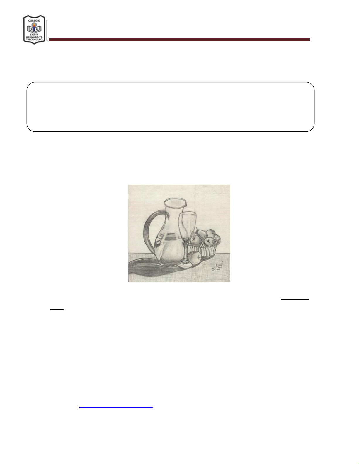 Fundación Educacional Colegio Santa Bernardita Artes Visuales Quintos años Prof. Patricio Muñoz C. GUÍA DE APRENDIZAJE Nº5 Unidad: Aplicar y combinar ele-mentos del lenguaje visual (incluidos los de niveles anteriores) en trabajos de arte y diseño con diferentes propósitos expresivos. Un bodegón, también conocido como naturaleza muerta, es una obra de arte que representa animales, flores y otros objetos, que pueden ser naturales (frutas, comida, plantas, rocas o conchas) o hechos por el hombre (utensilios de cocina, de mesa o de casa, antigüedades, libros, joyas, monedas, pipas, etc.) en un espacio determinado. Actividad: Elige objetos como frutas, botellas, cajas y otros, arma un modelo de naturaleza muerta y lo dibujas con lápiz grafito o carboncillo en una hoja de tu cuaderno o croquera. Aplica luces y sombras en tu trabajo. Correo: pmuñoz@cosanber.cl NOMBRE: ________________________________________________________ CURSO: _______ FECHA: ___________________ https://es.wikipedia.org/wiki/Obra_de_arte https://es.wikipedia.org/wiki/Obra_de_arte mailto:pmuñoz@cosanber.cl