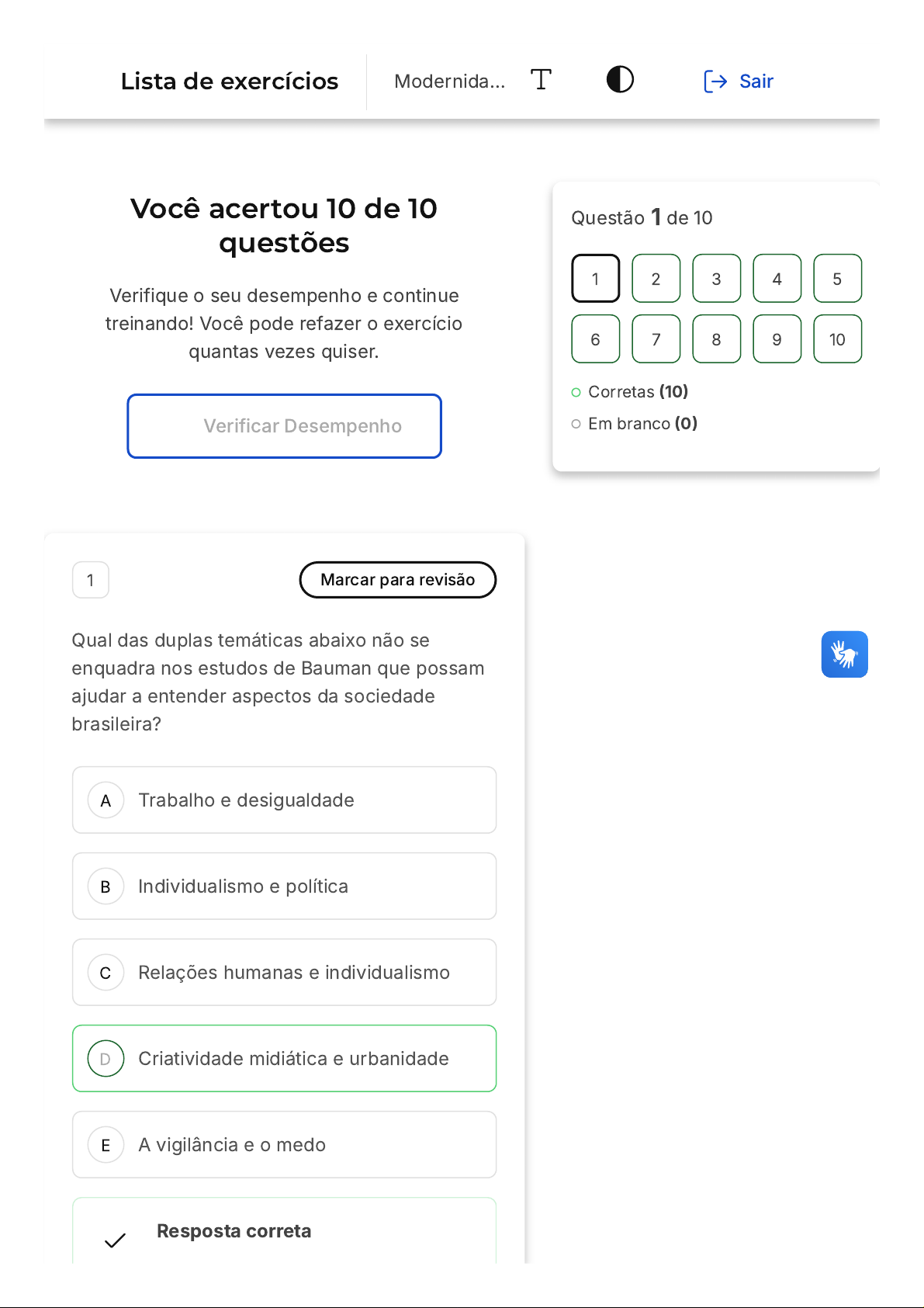 Você acertou 10 de 10 questões Verifique o seu desempenho e continue treinando! Você pode refazer o exercício quantas vezes quiser. Verificar Desempenho A B C D E 1 Marcar para revisão Qual das duplas temáticas abaixo não se enquadra nos estudos de Bauman que possam ajudar a entender aspectos da sociedade brasileira? Trabalho e desigualdade Individualismo e política Relações humanas e individualismo Criatividade midiática e urbanidade A vigilância e o medo Resposta correta Questão 1 de 10 Corretas (10) Em branco (0) 1 2 3 4 5 6 7 8 9 10 Lista de exercícios Modernida… Sair Parabéns, você selecionou a alternativa correta. Confira o gabarito comentado! Gabarito Comentado Zygmunt Bauman, sociólogo polonês, é conhecido por seus estudos sobre a modernidade líquida, individualismo, relações humanas, trabalho, desigualdade, política, vigilância e medo. No entanto, a dupla temática "Criatividade midiática e urbanidade" não se enquadra diretamente em seus estudos. Bauman não focou seus estudos na criatividade midiática e na urbanidade como aspectos centrais para entender a sociedade. Seus trabalhos são mais voltados para a análise das relações humanas na modernidade líquida, a desigualdade social, o individualismo e a política. 2 Marcar para revisão "Ilusão ou não, tendemos a ver as vidas dos outros como obras de arte. E tendo-as visto assim, lutamos para fazer o mesmo: 'Todo mundo tenta fazer de sua vida uma obra de arte.' " Bauman em sua obra Modernidade Líquida disserta sobre a construção de identidades em uma sociedade marcada pela instabilidade. A partir disso, indique quais das afirmativas abaixo estão em conformidade com o pensamento do autor: I - A identidade mostra-se um conceito ilusório e que só faz sentido quando compreendido de fora; pois a identidade experimentada constitui- se como um processo. A B C D E II - A identidade mostra-se um conceito ilusório pois a liberdade de escolha fundamenta-se na disponibilidade de objetos produzidos e comercializados em massa. III - A vida líquida propicia a satisfação identitária, pois todos são capazes de consumir e construir suas próprias identidades. IV - Há uma crise que impossibilita a construção de uma identidade sólida, que persista pela vida, o que ocasiona angústia e uma incerteza irredutível. V - O trabalho, identidades e projetos de vida deixaram de ser um eixo seguro na vida das pessoas. I, III e V II, III e V II, III e IV I, IV e V III, IV e V Resposta correta Parabéns, você selecionou a alternativa correta. Confira o gabarito comentado! Gabarito Comentado A resposta correta é: I, IV e V. Bauman afirma que a identidade é um conceito ilusório, pois é um processo que se constrói ao longo da vida. A vida líquida, marcada pela instabilidade, dificulta a A B C D E construção de uma identidade sólida, que persista pela vida. O trabalho, identidades e projetos de vida deixaram de ser um eixo seguro na vida das pessoas. 3 Marcar para revisão A respeito dos ideais de felicidade e satisfação, assinale a alternativa que descreve tais características na modernidade líquida: O critério para julgar uma vida como bem-sucedida é sua capacidade de produção, pois a modernidade líquida constitui-se como uma sociedade de produtores. O consumismo tem como principal pressuposto a satisfação do desejo ao invés de sua renovação. A promessa de satisfação só permanece sedutora enquanto o desejo continua irrealizado. As buscas existenciais como, por exemplo, a dignidade, autoestima e felicidade independem da mediação do mercado. O norte da vida contemporânea baseia-se no projeto de uma sociedade ordenada, na qual há a satisfação de todas as necessidades. Resposta correta Parabéns, você selecionou a alternativa correta. Confira o gabarito comentado! Gabarito Comentado A promessa de satisfação só permanece sedutora enquanto o desejo continua irrealizado. Na modernidade líquida, a felicidade é entendida como uma busca constante, que nunca é plenamente alcançada. Isso porque, na sociedade de consumo, os desejos são constantemente renovados e estimulados, de modo que nunca é possível satisfazê-los completamente. Como resultado, as pessoas vivem em um estado de insatisfação crônica, que as leva a consumir cada vez mais em busca de uma felicidade que nunca será alcançada. 4 Marcar para revisão A Modernidade Líquida é um conceito criado por Zygmunt Bauman no final do século XX para descrever os atuais arranjos socioculturais predominantes no mundo contemporâneo. Segundo o sociólogo, essa época é caracterizada pela fragilidade, imprevisibilidade e incerteza, em que nada é concebido para ser duradouro. Sobre o pensamento de Bauman, analise as afirmações. I. O autor defende a contemporaneidade não como uma ruptura do período moderno, apenas como uma continuação com aspectos e estruturas diferentes. A B C D E II. A modernidade sólida caracterizava-se por um determinado grau de segurança em seus vínculos. III. O emprego e os relacionamentos contemporâneos são aspectos cada vez mais marcados pela transitoriedade. IV. Pertencem à modernidade líquida a vigilância panóptica, burocracia e controle. É correto o que se afirma em I e II, apenas. II e III, apenas. III e IV, apenas. I, II e III, apenas. I, II, III e IV. Resposta correta Parabéns, você selecionou a alternativa correta. Confira o gabarito comentado! Gabarito Comentado Estão corretas as afirmativas I, II e III. Modernidade líquida é o termo cunhado por Zigmunt Bauman no final do século XX para definir os novos arranjos socioculturais vigentes no mundo contemporâneo. É uma época marcada, segundo o sociólogo, por fragilidade, imprevisibilidade e incerteza, em que nada é feito para durar. Zygmunt Bauman é A B C referido como um teórico da pós- modernidade; entretanto, o autor é crítico a tal conceito, tendo o substituído gradualmente em sua obra pelo termo modernidade lí