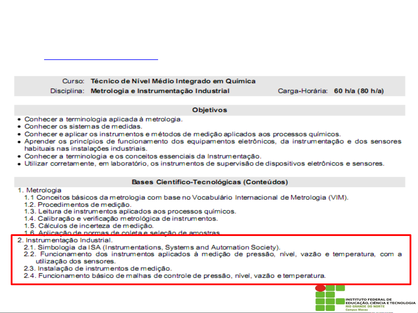 Curso: Técnico de Nível Médio Integrado em Química Disciplina: Metrologia e Instrumentação Industrial Carga-Horária: 60 h (80 h/a) Professor: Gustavo de Souza Medeiros Email: gustavo.souza@ifrn.edu.br Site: http://docente.ifrn.edu.br/gustavosouza CALENDÁRIO DE AVALIAÇÕES 3 BIMESTRE: 16 JANEIRO 20 FEVEREIRO 4 BIMESTRE: 27 MARÇO 24 ABRIL image2.png image3.png image1.jpeg