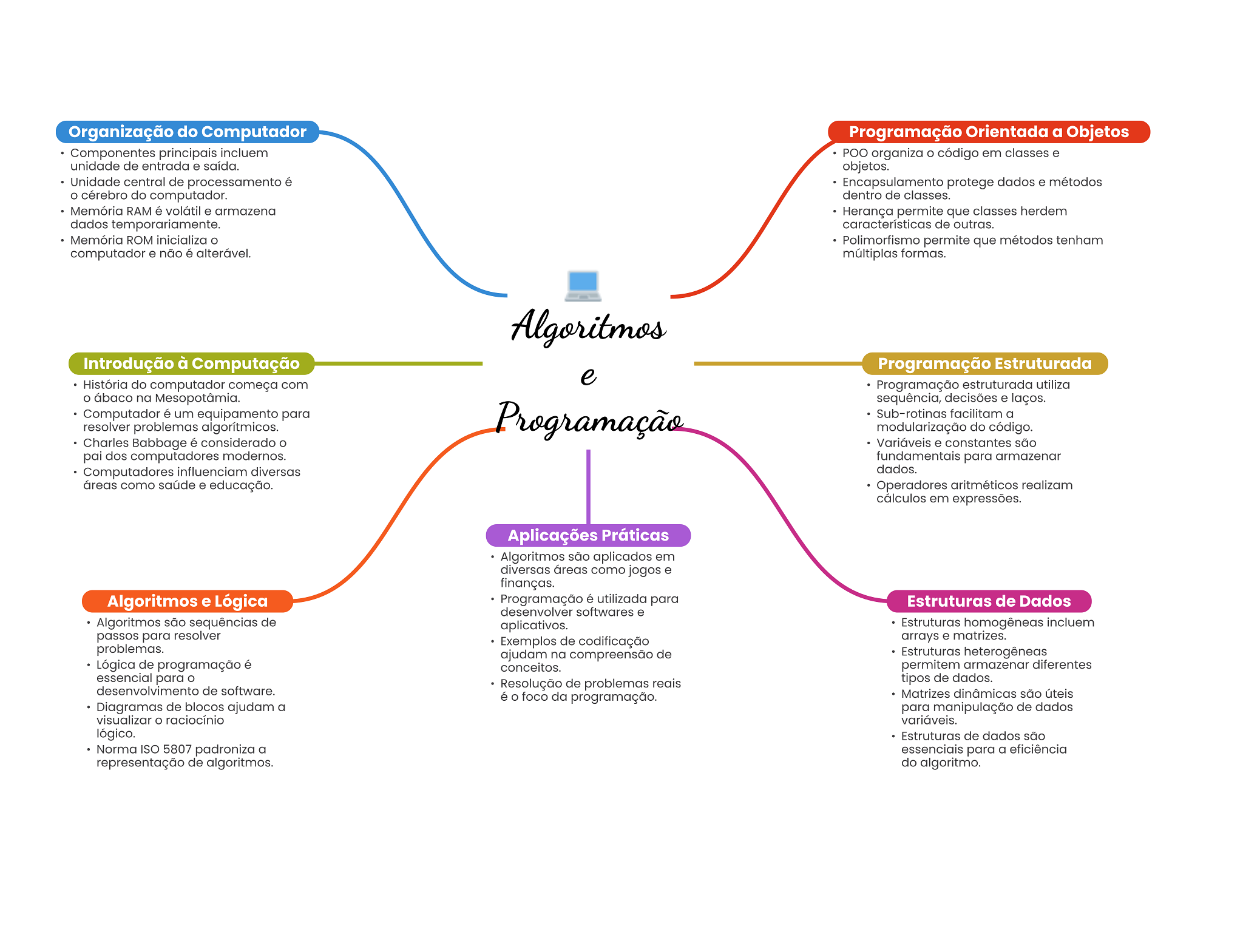 Organização do Computador Programação Orientada a Objetos Componentes principais incluem organiza código em classes e unidade de entrada e saída. objetos. Unidade central de processamento é Encapsulamento protege dados e métodos cérebro do computador. dentro de classes. Memória RAM é volátil e armazena Herança permite que classes herdem dados temporariamente. características de outras. Memória ROM inicializa Polimorfismo permite que métodos tenham computador e não é alterável. múltiplas formas. Algoritmos Introdução à Computação Programação Estruturada e História do computador começa com Programação estruturada utiliza ábaco na Mesopotâmia. sequência, decisões e laços. Computador é um equipamento para resolver problemas algorítmicos. Programação Sub-rotinas facilitam a modularização do código. Charles Babbage é considerado Variáveis e constantes são pai dos computadores modernos. fundamentais para armazenar Computadores influenciam diversas dados. áreas como saúde e educação. Operadores aritméticos realizam cálculos em expressões. Aplicações Práticas Algoritmos são aplicados em diversas áreas como jogos e finanças. Algoritmos e Lógica Programação é utilizada para Estruturas de Dados desenvolver softwares e Algoritmos são sequências de aplicativos. Estruturas homogêneas incluem passos para resolver Exemplos de codificação arrays e matrizes. problemas. ajudam na compreensão de Estruturas heterogêneas Lógica de programação é conceitos. permitem armazenar diferentes essencial para Resolução de problemas reais tipos de dados. desenvolvimento de software. é O foco da programação. Matrizes dinâmicas são úteis Diagramas de blocos ajudam a para manipulação de dados visualizar raciocínio variáveis. lógico. Estruturas de dados são Norma ISO 5807 padroniza a essenciais para a eficiência representação de algoritmos. do algoritmo.