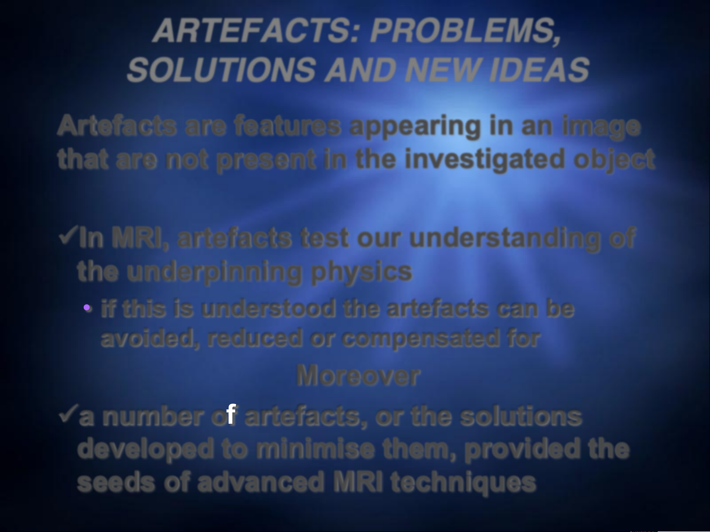 ARTEFACTS: PROBLEMS, SOLUTIONS AND NEW IDEAS Artefacts are features appearing in an image that are not present in the investigated object üIn MRI, artefacts test our understanding of the underpinning physics • if this is understood the artefacts can be avoided, reduced or compensated for Moreover üa number of artefacts, or the solutions developed to minimise them, provided the seeds of advanced MRI techniques Motion Artefacts in MRI üEach data point in the k space contains information from the entire selected slice • or selected volume in 3D imaging ü Interleaved multislice imaging is used to cover the whole of an organ or body area of interest ü Movement during acquisition affects all the slices in the investigated volume • not a limited number of them • The acquisition time of an MRI dataset is typically a few minutes Motion Artefacts in MRI üMovement during acquisition affects all the slices in the investigated volume • not a limited number of them • The acquisition time of an MRI dataset is typically a few minutes üit is of utmost importance to optimise patient positioning üan uncomfortable position increases the probability of movement during the exam Motion Artefacts in MRI üPatient movement disrupts the relationship between phase and position üThis can result in faint displaced images • known as ghosts phase encoding gradient in the left–right direction Motion Artefacts in MRI üIn medical imaging, some types of motion cannot be avoided • breathing, the cardiac cycle, and blood flow üthere are some techniques to minimise the resulting artefacts Cardiac Motion üSynchronizing the sequence to the cardiac cycle • known as ‘gating’ üSpecial electrocardiogram (ECG) non-metallic electrodes • to reduce artefacts on the images • to avoid local skin heating • The ECG wires typically have high impedance v reducing the chance of RF burns for the patient Cardiac Motion üThe peak of the R wave is used to trigger the next acquisition üEach line of K space is acquired at the same point in the cardiac cycle üThe TR is determined by the heart rate (HR) • typical HR of 75 beats per minute (bpm) • TR ~ 800 ms or multiple of the cardiac cycle Cardiac Motion üEach line of k space is acquired at the same point in the cardiac cycle • Ghosting is removed • Cine imaging of the cardiac movement vhttps://www.imaios.com/en/e-Courses/e-MRI/Image- quality-and-artifacts/motion-artifact-remedies https://www.imaios.com/en/e-Courses/e-MRI/Image-quality-and-artifacts/motion-artifact-remedies https://www.imaios.com/en/e-Courses/e-MRI/Image-quality-and-artifacts/motion-artifact-remedies Peripheral Gating üCardiac gating by detecting the arterial pulse of blood in the patient’s finger • the blood vessels are very close to the skin • an infrared light detector pick up the increased volume of blood as the arterial pulse reaches the extremity vsufficient to provide a trigger for the MR sequence üPeripheral gating is useful for removing pulsatility artefacts in the brain and spine Respiratory Motion Breathing motion causes ghosting thoracic and abdominal imaging ü15 s scan time or less than can be acquired during a single breath-hold • The acquisition can be split up so that packages of slices are acquired in separate breath- holds vThe position of the liver and kidneys is more reproducible if the breath is held in expiration Careful coaching with the patient is needed before the examination Respiratory gating ü The respiratory cycle can be monitored using a ‘breathing belt’ strapped around the thorax üthis generates an electric signal dependent on the pressure of the thorax on the belt • allowing breathing to be monitored https://www.imaios.com/en/e-Courses/e-MRI/Image-quality-and-artifacts/motion-artifact-remedies https://www.imaios.com/en/e-Courses/e-MRI/Image-quality-and-artifacts/motion-artifact-remedies Respiratory gating üRespiratory gating can then be applied in order to perform acquisition of k-space lines during the end-expiration phase • when chest motion is minimal üTR is defined by the breathing cycle • the interval between 2 consecutive triggers • a normal breathing rate of about 10–15 breaths per minute gives an effective TR of at least 4000 ms vrespiratory gating useful for PD or T2-weighted imaging Respiratory compensation Respiratory- Ordered Phase Encoding (ROPE) ük-space lines are acquired during the whole respiratory cycle üsimilar phase encoding gradient amplitudes are used with the thorax at similar positions üThis avoids abrupt variation in the position of chest structures between closely-spaced k-space lines • minimising artefacts https://www.imaios.com/en/e-Courses/e- MRI/Image-quality-and-artifacts/motion- artifact-remedies https://www.imaios.com/en/e-Courses/e-MRI/Image-quality-and-artifacts/motion-artifact-remedies https://www.imaios.com/en/e-Courses/e-MRI/Image-quality-and-artifacts/motion-artifact-remedies https://www.imaios.com/en/e-Courses/e-MRI/Image-quality-and-artifacts/motion-artifact-remedies Respiratory compensation üin respiratory gating only the quasi-stationary phase of the cycle is used for acquisition üROPE is more effective because data are acquired throughout the respiratory cycle ROPE sequence Navigator echoes üThe navigator ‘signal’ is from a single column of voxels used to monitor the position of the diaphragm • 1D signal acquired from 1 echo • Strong contrast between the lung and the liver shows up clearly • The boundary automatically detected and controls the acquisition: the image data are acquired when the diaphragm is within certain spatial limits v typically 2–4 mm • ROPE acquisition without respiratory belt The navigator signal is spatially encoded in one direction: the other direction is time What is the best ? üa breath-hold is usually the best choice übreath-hold for morphology and perfusion scans ünavigators for coronary arteries and high- resolution viabil