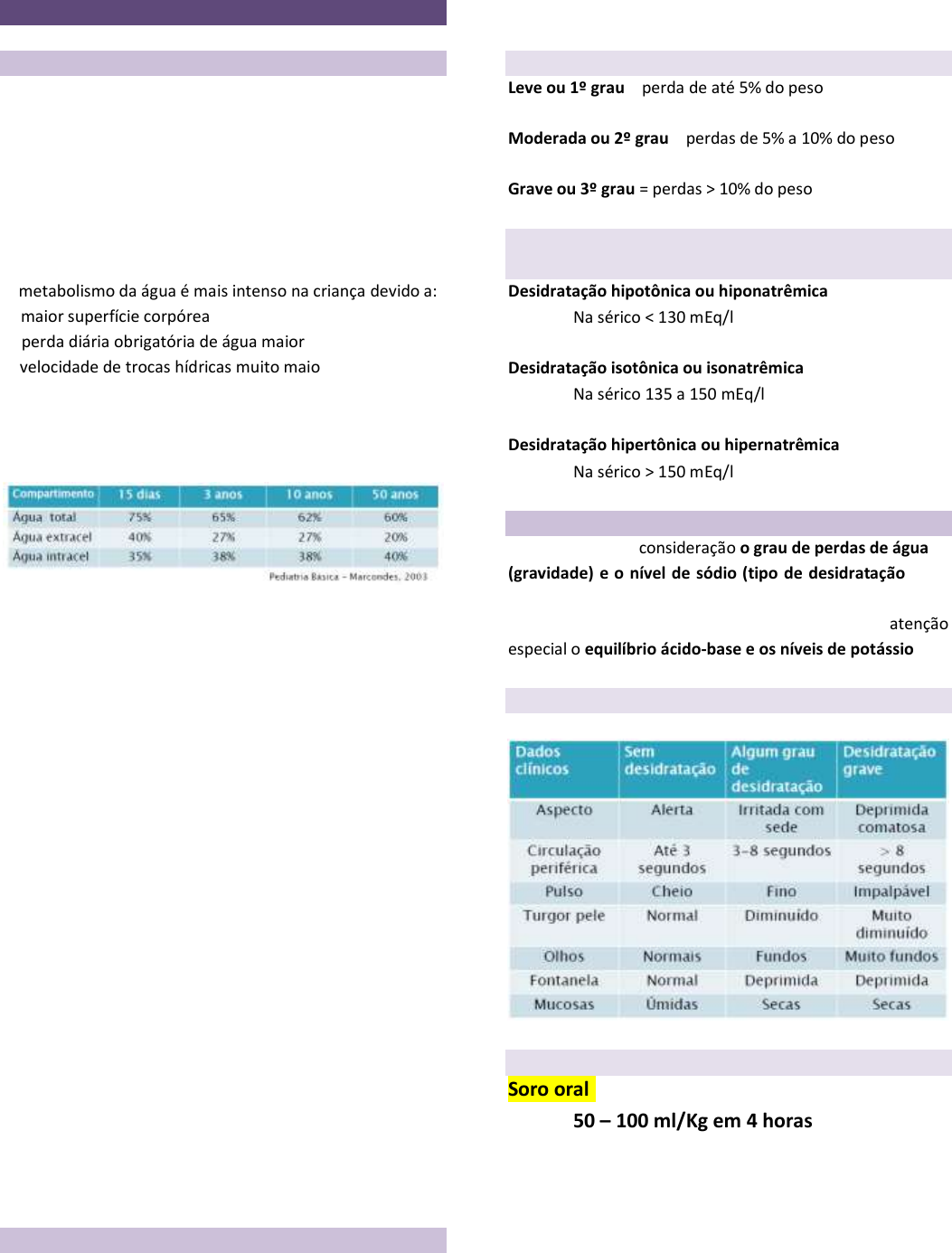 Roxanne Cabral – 2019.1 – M6 – Pediatria 2 HIDRATAÇÃO VENOSA Metabolismo da água A água é o principal componente do corpo humano, constituindo de 60% a 80% do peso corporal. As necessidades hídricas estão aumentadas na criança, comparativamente ao adulto, em decorrência do maior metabolismo hídrico, da distribuição dos compartimentos aquosos e da imaturidade renal. O metabolismo da água é mais intenso na criança devido a: a) maior superfície corpórea b) perda diária obrigatória de água maior c) velocidade de trocas hídricas muito maio. A água extracelular diminui progressivamente desde o nascimento, de 44 até 19% nos adultos jovens A distribuição da água nos vários compartimentos corpóreos depende da permeabilidade da barreira entre os compartimentos e da quantidade de soluto em cada um deles. A pressão osmótica gerada pelo equilíbrio de Gibbs-Donnan favorece o movimento de água de fluido intersticial (baixa concentração proteica) para o plasma e espaço intracelular (ricos em proteína). A rotura celular é impedida pela ação da bomba Na-K- ATPase. • Fluido extracelular: o Plasma = cátion predominante é o sódio • Fluido intersticial: o Ultrafiltrado do plasma e concentração desprezível de proteínas • Fluido intracelular • Balanço hídrico Distúrbios da Água Desidratação é a contração do volume extracelular secundária as perdas hidroeletrolíticas, cuja gravidade irá depender da magnitude do déficit em relação às reservas corpóreas e da relação entre o déficit de água e de eletrólitos, principalmente o sódio. Classificação da desidratação quanto ao déficit de água: Leve ou 1º grau = perda de até 5% do peso Moderada ou 2º grau = perdas de 5% a 10% do peso Grave ou 3º grau = perdas > 10% do peso Classificação quanto ao nível sérico de sódio resultante das perdas: Desidratação hipotônica ou hiponatrêmica: • Na sérico 150 mEq/l Tratamento Deve-se levar em consideração o grau de perdas de água (gravidade) e o nível de sódio (tipo de desidratação), não se esquecendo de que outros distúrbios eletrolíticos e metabólicos poderão estar presentes, merecendo atenção especial o equilíbrio ácido-base e os níveis de potássio. Classificação do Estado de Hidratação Desidratação leve a moderada Soro oral: • 50 – 100 ml/Kg em 4 horas A partir de 1975: solução única padrão (OMS/UNICEF): • Sódio 90, potássio 20, cloro 80, glicose 111 • Osmolaridade: 311 mOm/l Nova SRO: • Sódio 75, potássio 20, cloro 65, glicose 75 • Osmolaridade: 245 mOm/l Roxanne Cabral – 2019.1 – M6 – Pediatria 2 Gastróclise: • Administração da TRO por SNG, com volume inicial de 20 – 30 ml/Kg/h Contraindicações: ▪ Alteração do nível de consciência ▪ Persistência dos vômitos após uso da SNG ▪ Criança que não ganha ou perde peso após 2h de gastróclise; ▪ Presença de íleo paralítico Desidratação grave É indicada a reposição via endovenosa para desidratação grave, vômitos persistentes (> 4 episódios/h), perdas intensas e continuadas. 1ª Fase: Expansão Volume: 100ml/kg ▪ 12m a 5ª: 30 ml/kg (30 min); 70 ml/kg (2h 30m). Repetir se pulso fino ou não detectável. Reavaliar a cada 1- 2h. Término: quando desaparecem os sinais clínicos de desidratação e quando a criança apresentar duas micções com urina clara (afastadas as causas de poliúria, hipopotasemia, hiponatremia e hiperglicemia com diurese osmótica). Frente a uma desidratação grave com choque, nós vamos optar por uma terapia de hidratação venosa de expansão. Para isso precisamos de uma solução muito concentrada para atrair osmoticamente água para dentro do vaso. Isso que vai tirar a pessoa do choque. A desidratação pode ser causada por: Diarreia, vômitos incoercíveis, insolação, baixa ingesta hídrica. Na cetoacidose diabética, no pós-operatório e nas arboviroses também será necessária hidratação. 2ª fase: Manutenção Primeira Etapa no Cálculo Calcular volume de soro glicosado a ser utilizado. Volume: baseado na Regra de Holliday-Seggar Peso Soro Glicosado (SG) a 5% Até 10kg 100 ml/kg/dia De 10 a 20kg 1000ml + 50ml/kg/dia (para cada Kg acima de 10) > 20kg 1500ml + 20ml/kg/dia (para cada Kg acima de 20) Segunda Etapa no Cálculo Calcular a quantidade de eletólitos a ser adicionada no SG: Sódio (Na): NaCl 20%: 1ml de uma solução de NaCl 20% tem: 3,4 mEq NaCl 0.9% (SF 0.9%): 1ml de uma solução de NaCl 0,9% tem = 0,15 mEq * Lembrete: Na → 3 mEq para cada 100ml Potássio (K): KCl 10%: 1ml de uma solução de KCl 10% tem: 1,3 mEq * Lembrete: K → 2 mEq para cada 100ml EXEMPLO: Criança de 2 anos com história de diarreia sem sangue e profusa. Está em desidratação grave (chocada). Além disso, ela está com gengivoestomatite herpética, não conseguindo comer ou beber. • Peso = 12 kg Fase de Expansão No momento da anamnese, foi decidida a realização de uma HV de expansão. A solução de escolha deve ser hiperosmolar, com isso, a melhor opção é o SORO FISIOLÓGICO. Entendendo osmolaridade: É a quantidade de soluto dentro do solvente. A osmolaridade é dada por íons positivos. O soro fisiológico tem 308mOm e é o sódio quem dá osmolaridade a ele. O Cloro não interessa para o cálculo da osmolaridade pois ele é negativo. Cálculo da osmolaridade: Em 1000ml de solução temos que calcular quantos mEq de íons positivos há. O resultado deve ser multiplicado por dois. • 1000ml → Y mEq de íons positivos • Osmolaridade = Y x 2 1ml de solução de NaCl 0,9% (SF) tem 0,154mEq 1000ml de solução de NaCl 0,9% (SF) tem 154mEq Roxanne Cabral – 2019.1 – M6 – Pediatria 2 Para calcular a osmolaridade, devemos multiplicar esse valor por 2: ➔ 154 x 2 = 308mEq (soro fisiológico) Para Rafael, o volume para expansão é: ▪ > 12m a 5a: 30 ml/kg (30 min); 70 ml/kg (2h 30m). Volume de SF 0,9% = 360ml em meia hora, seguido de 840 ml em 2 horas e meia.