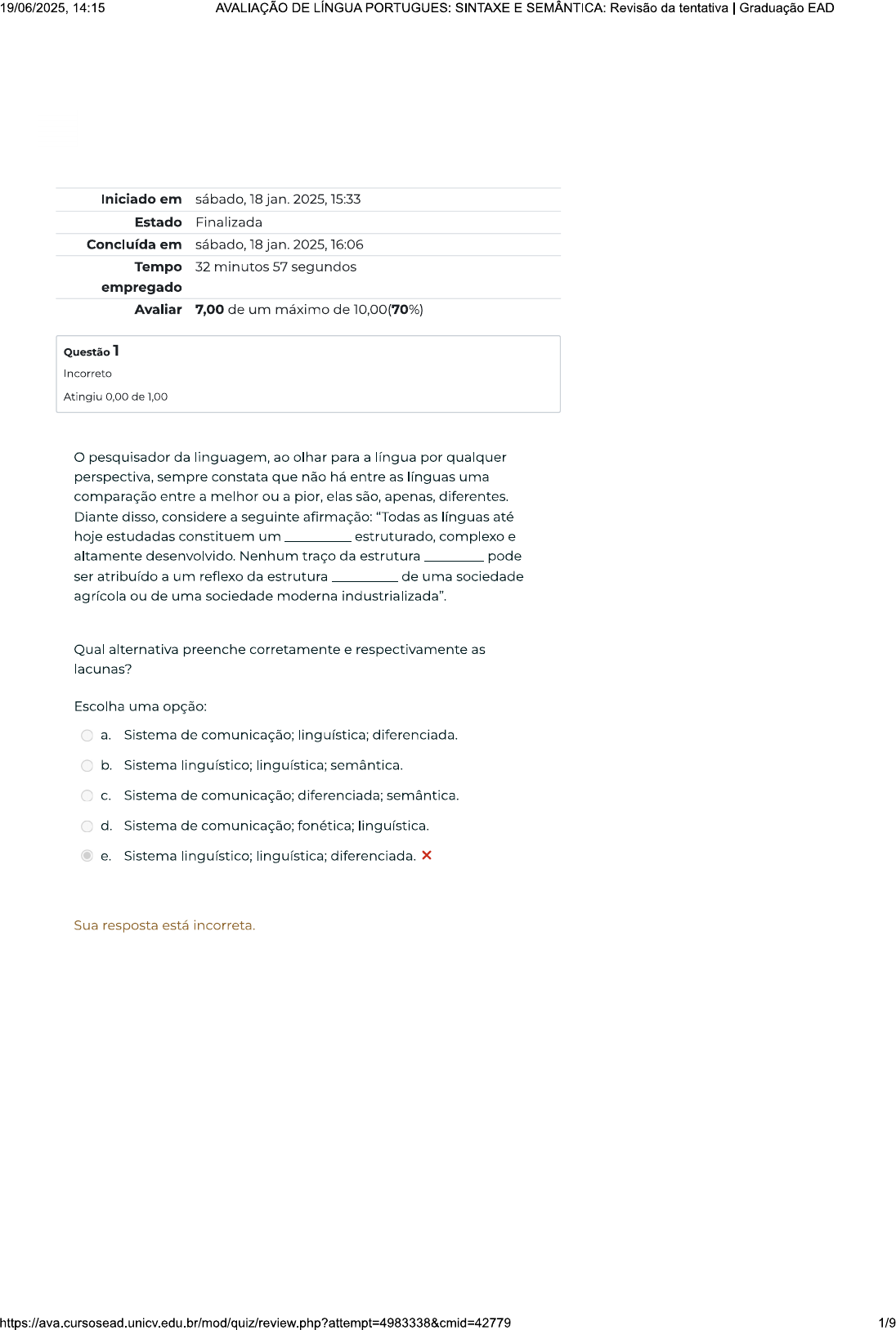 19/06/2025, 14:15 AVALIAÇÃO DE LÍNGUA PORTUGUES: SINTAXE E SEMÂNTICA: Revisão da tentativa Graduação EAD Iniciado em sábado, 18 jan. 2025, 15:33 Estado Finalizada Concluída em sábado, 18 jan. 2025, 16:06 Tempo 32 minutos 57 segundos empregado Avaliar 7,00 de um máximo de 10,00(70%) Questão 1 Incorreto Atingiu 0,00 de 1,00 pesquisador da linguagem, ao olhar para a língua por qualquer perspectiva, sempre constata que não há entre as línguas uma comparação entre a melhor ou a pior, elas são, apenas, diferentes. Diante disso, considere a seguinte afirmação: "Todas as línguas até hoje estudadas constituem um estruturado, complexo e altamente desenvolvido. Nenhum traço da estrutura pode ser atribuído a um reflexo da estrutura de uma sociedade agrícola ou de uma sociedade moderna industrializada". Qual alternativa preenche corretamente e respectivamente as lacunas? Escolha uma opção: a. Sistema de comunicação; linguística; diferenciada. b. Sistema linguístico; linguística; semântica. Sistema de comunicação; diferenciada; semântica. d. Sistema de comunicação; fonética; linguística. e. Sistema linguístico; linguística; diferenciada. Sua resposta está incorreta. 1/919/06/2025, 14:15 AVALIAÇÃO DE LÍNGUA PORTUGUES: SINTAXE E SEMÂNTICA: Revisão da tentativa Graduação EAD Questão 2 Correto Atingiu 1,00 de 1,00 Na disciplina em questão, você estudou sobre os verbos. Como é elemento que distingue nomes e os verbos em grupos ou classes, e que se junta ao radical para formar uma base que vai receber as desinências? A esse respeito, assinale a alternativa correta: Escolha uma opção: a. Sufixo. b. Fonema. C. Prefixo. d. Vogal temática. e. Afixo. Sua resposta está correta. Questão 3 Correto Atingiu 1,00 de 1,00 Na disciplina em questão, você estudou sobre a nova ortografia da língua portuguesa. Novo Acordo Ortográfico buscou uma unificação das regras da língua portuguesa, para a qual foram efetuadas muitas alterações. Dessa maneira, qual foi a primeira mudança? Diante disso, assinale a alternativa correta: Escolha uma opção: a. Nos casos de estrangeirismos. b. Nas regras de maiúsculas. C. Na adequação dos verbos. d. Nas abreviaturas. e. No alfabeto. Sua resposta está correta. htps://ava.cursosead.unicv.edu.br/mod/quiz/review.php?attempt=4983338&cmid=42779 2/919/06/2025, 14:15 AVALIAÇÃO DE LÍNGUA PORTUGUES: SINTAXE E SEMÂNTICA: Revisão da tentativa Graduação EAD Questão 4 Incorreto Atingiu 0,00 de 1,00 Na disciplina em questão, você estudou sobre as orações coordenadas e as subordinadas. Sabe-se que as orações coordenadas podem ser ligadas por uma conjunção (sindéticas) ou podem se ligar sem uma conjunção (assindéticas). Considerando esse contexto, avalie as seguintes asserções e a relação proposta entre elas. Geralmente, as conjunções não são antecedidas pela vírgula, ou ainda podem ser deslocadas dentro do período. PORQUE II. A função das conjunções é unir as orações. É correto que se afirma em: Escolha uma opção: a. A asserção lé uma proposição verdadeira, e a é uma proposição falsa. As asserções le são proposições falsas. b. As asserções e são proposições verdadeiras, mas a não é uma justificativa da I. A asserção é uma proposição falsa, e a é uma proposição verdadeira. d. A asserção é uma proposição verdadeira e a é uma proposição falsa. e. As asserções I e são proposições verdadeiras, e a II é uma justificativa da I. Sua resposta está incorreta. 3/919/06/2025, 14:15 AVALIAÇÃO DE LÍNGUA PORTUGUES: SINTAXE E SEMÂNTICA: Revisão da tentativa Graduação EAD Questão 5 Correto Atingiu 1,00 de 1,00 Na disciplina em questão, você estudou sobre Verbos. verbo é o termo essencial do enunciado oracional. Por meio dele podemos expressar ação ("pular", "vender", "partir"), fenômeno ("chover", "trovejar") ou caráter de estado (ser doente, estar doente, parecer doente, ficar doente). Diante desse conceito, os verbos podem ser classificados em: Escolha uma opção: a. Regulares; irregulares; defectivos. b. Irregulares; subjetivos; restritivos. C. Regulares; subjetivos; restritivos. d. Regulares; irregulares; restritivos. e. Regulares; subjetivos; defectivos. Sua resposta está correta. 4/919/06/2025, 14:15 AVALIAÇÃO DE LÍNGUA PORTUGUES: SINTAXE E SEMÂNTICA: Revisão da tentativa Graduação EAD Questão 6 Correto Atingiu 1,00 de 1,00 Na disciplina em questão, você estudou sobre frase, oração e período. Todo texto, seja escrito ou falado, é resultado de uma produção conjunta entre interlocutores, e que distingue os dois tipos é a forma como essa produção se realiza. Em relação à definição de frase, avalie as afirmações a seguir: I. A frase tem como objetivo transmitir uma informação, de modo que atenda um sujeito e outro, para que aconteça um processo comunicativo. II. Só é possível existir uma construção frasal com verbos e mais de uma palavra. III. Frase é uma unidade plena de sentido. IV. "Socorro!" não pode ser considerada uma frase, pois falta um verbo e outros complementos. É correto apenas que se afirma em: Escolha uma opção: a. le IV. b. e IV. C. e III. d. le II. e. le III. Sua resposta está correta. 5/919/06/2025, 14:15 AVALIAÇÃO DE LÍNGUA PORTUGUES: SINTAXE E SEMÂNTICA: Revisão da tentativa Graduação EAD Questão 7 Correto Atingiu 1,00 de 1,00 Com base nas asserções de Negão, Scher e Violli (2004, p. 106), todo falante tem um conhecimento linguístico que contém saberes específicos, utilizados para entender a estrutura de uma frase. Considerando esses saberes específicos, analise as sentenças a seguir: I. Um dos saberes é: organizar os itens lexicais em categorias gramaticais, estabelecidas de acordo com as características morfológicas, distribucionais e semânticas por eles exibidas. II. Um dos saberes é: que a sentença resulta da projeção dessas categorias em constituintes hierarquic