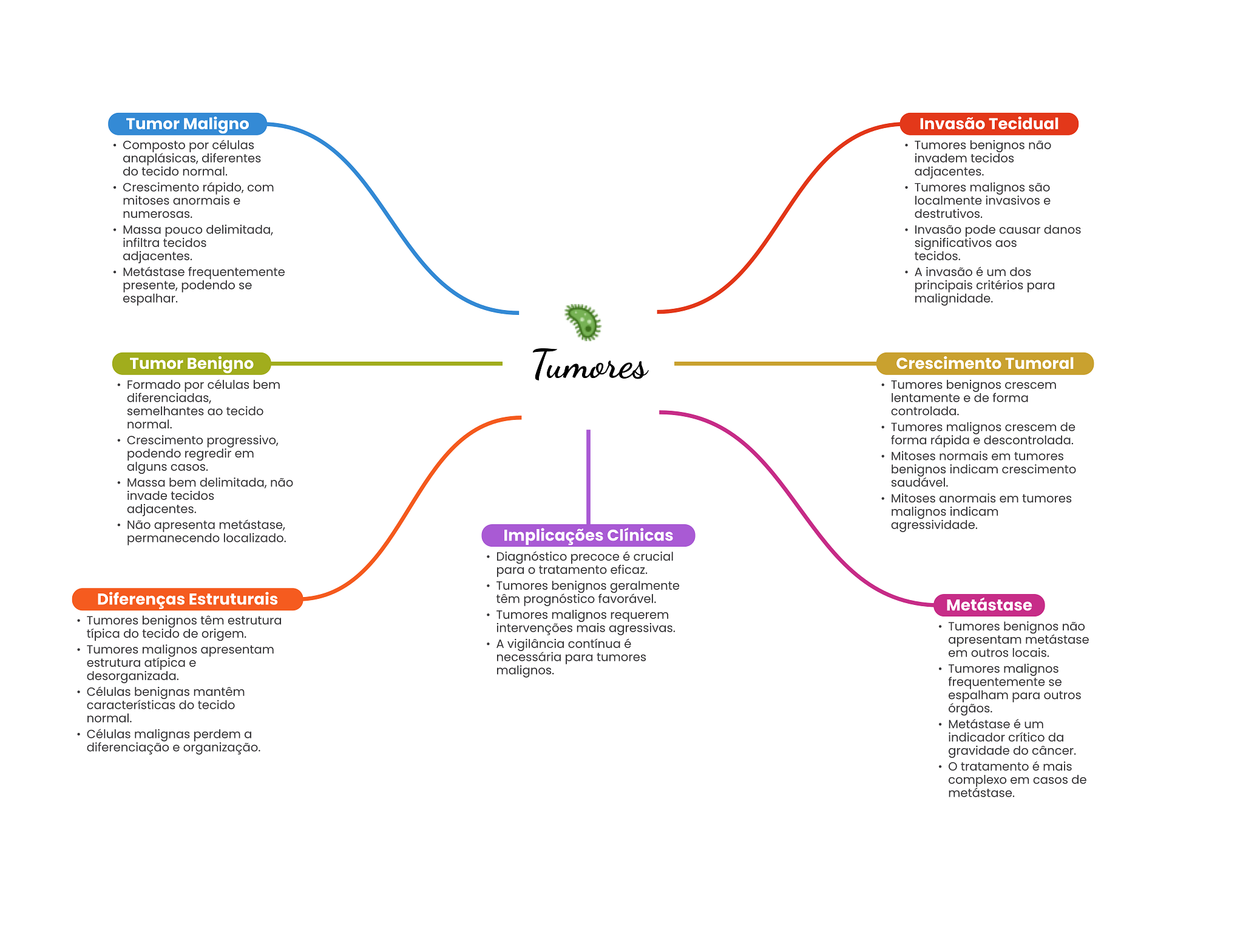 Tumor Maligno Invasão Tecidual Composto por células Tumores benignos não anaplásicas, diferentes invadem tecidos do tecido normal. adjacentes. Crescimento rápido, com Tumores malignos são mitoses anormais e localmente invasivos e numerosas. destrutivos. Massa pouco delimitada, Invasão pode causar danos infiltra tecidos significativos aos adjacentes. tecidos. Metástase frequentemente A invasão é um dos presente, podendo se principais critérios para espalhar. malignidade. Tumor Benigno Tumores Crescimento Tumoral Formado por células bem Tumores benignos crescem diferenciadas, lentamente e de forma semelhantes ao tecido controlada. normal. Tumores malignos crescem de Crescimento progressivo, forma rápida e descontrolada. podendo regredir em Mitoses normais em tumores alguns casos. benignos indicam crescimento Massa bem delimitada, não saudável. invade tecidos Mitoses anormais em tumores adjacentes. malignos indicam Não apresenta metástase, agressividade. permanecendo localizado. Implicações Clínicas Diagnóstico precoce é crucial para tratamento eficaz. Tumores benignos geralmente Diferenças Estruturais têm prognóstico favorável. Metástase Tumores benignos têm estrutura Tumores malignos requerem típica do tecido de origem. intervenções mais agressivas. Tumores benignos não Tumores malignos apresentam A vigilância contínua é apresentam metástase necessária para tumores em outros locais. estrutura atípica e malignos. Tumores malignos desorganizada. frequentemente se Células benignas mantêm espalham para outros características do tecido órgãos. normal. Metástase é um Células malignas perdem a indicador crítico da diferenciação e organização. gravidade do câncer. tratamento é mais complexo em casos de metástase.