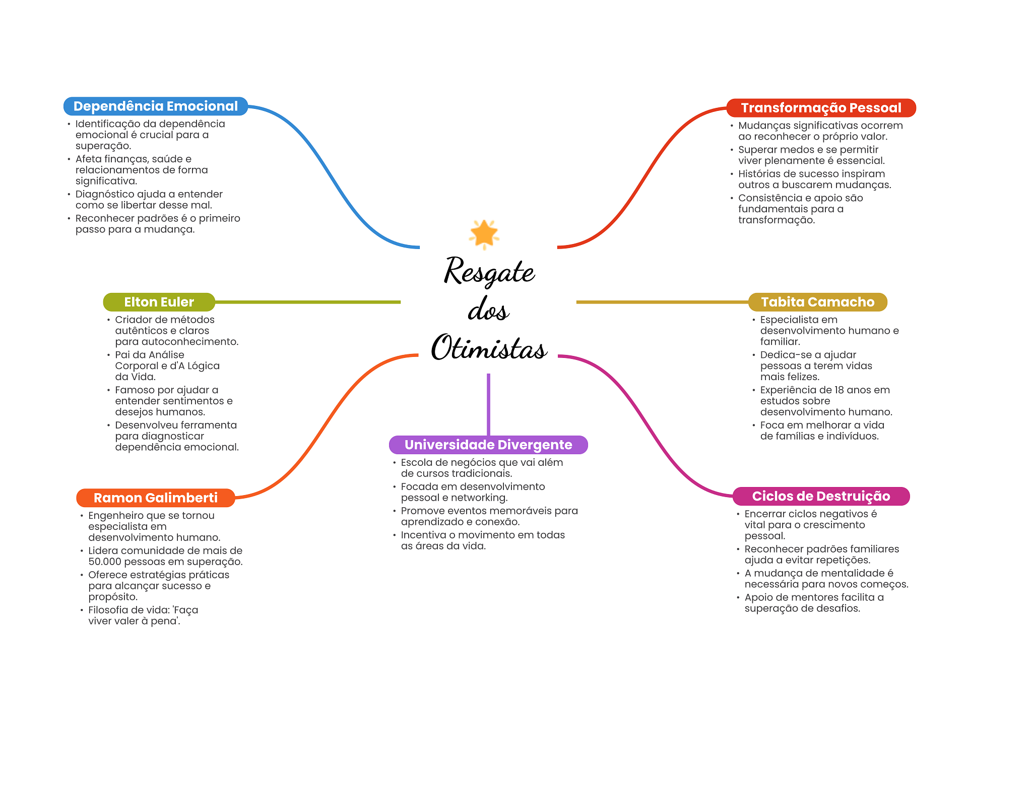 Dependência Emocional Transformação Pessoal Identificação da dependência Mudanças significativas ocorrem emocional é crucial para a ao reconhecer próprio valor. superação. Superar medos e se permitir Afeta finanças, saúde e viver plenamente é essencial. relacionamentos de forma Histórias de sucesso inspiram significativa. outros a buscarem mudanças. Diagnóstico ajuda a entender Consistência e apoio são como se libertar desse mal. fundamentais para a Reconhecer padrões é primeiro transformação. passo para a mudança. Resgate Elton Euler dos Tabita Camacho Criador de métodos Especialista em autênticos e claros desenvolvimento humano e para autoconhecimento. Pai da Análise Otimistas familiar. Dedica-se a ajudar Corporal e d'A Lógica pessoas a terem vidas da Vida. mais felizes. Famoso por ajudar a Experiência de 18 anos em entender sentimentos e estudos sobre desejos humanos. desenvolvimento humano. Desenvolveu ferramenta Foca em melhorar a vida para diagnosticar de famílias e indivíduos. dependência emocional. Universidade Divergente Escola de negócios que vai além de cursos tradicionais. Focada em desenvolvimento Ramon Galimberti pessoal e networking. Ciclos de Destruição Engenheiro que se tornou Promove eventos memoráveis para Encerrar ciclos negativos é especialista em aprendizado e conexão. vital para O crescimento desenvolvimento humano. Incentiva O movimento em todas pessoal. Lidera comunidade de mais de as áreas da vida. Reconhecer padrões familiares 50.000 pessoas em superação. ajuda a evitar repetições. Oferece estratégias práticas A mudança de mentalidade é para alcançar sucesso e necessária para novos começos. propósito. Apoio de mentores facilita a Filosofia de vida: Faça superação de desafios. viver valer à pena'.