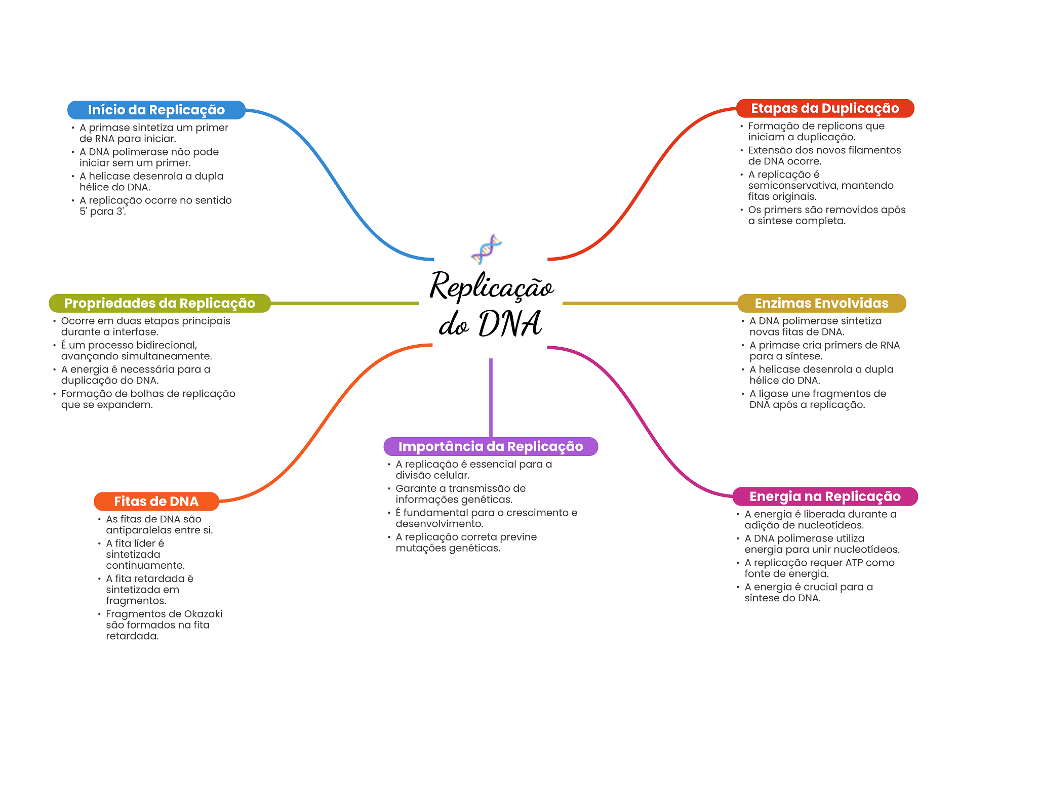 Início da Replicação Etapas da Duplicação A primase sintetiza um primer Formação de replicons que de RNA para iniciar. iniciam a duplicação. A DNA polimerase não pode Extensão dos novos filamentos iniciar sem um primer. de DNA ocorre. A helicase desenrola a dupla A replicação é hélice do DNA. semiconservativa, mantendo A replicação ocorre no sentido fitas originais. 5' para 3'. Os primers são removidos após a síntese completa. Replicação Propriedades da Replicação Enzimas Envolvidas Ocorre em duas etapas principais durante a interfase. do DNA A DNA polimerase sintetiza novas fitas de DNA. É um processo bidirecional, A primase cria primers de RNA avançando simultaneamente. para a síntese. A energia é necessária para a A helicase desenrola a dupla duplicação do DNA. hélice do DNA. Formação de bolhas de replicação A ligase une fragmentos de que se expandem. DNA após a replicação. Importância da Replicação A replicação é essencial para a divisão celular. Garante a transmissão de Fitas de DNA informações genéticas. Energia na Replicação É fundamental para crescimento e As fitas de DNA são A energia é liberada durante a desenvolvimento. antiparalelas entre si. adição de nucleotídeos. A fita líder é A replicação correta previne A DNA polimerase utiliza sintetizada mutações genéticas. energia para unir nucleotídeos. continuamente. A replicação requer ATP como A fita retardada é fonte de energia. sintetizada em A energia é crucial para a fragmentos. síntese do DNA. Fragmentos de Okazaki são formados na fita retardada.