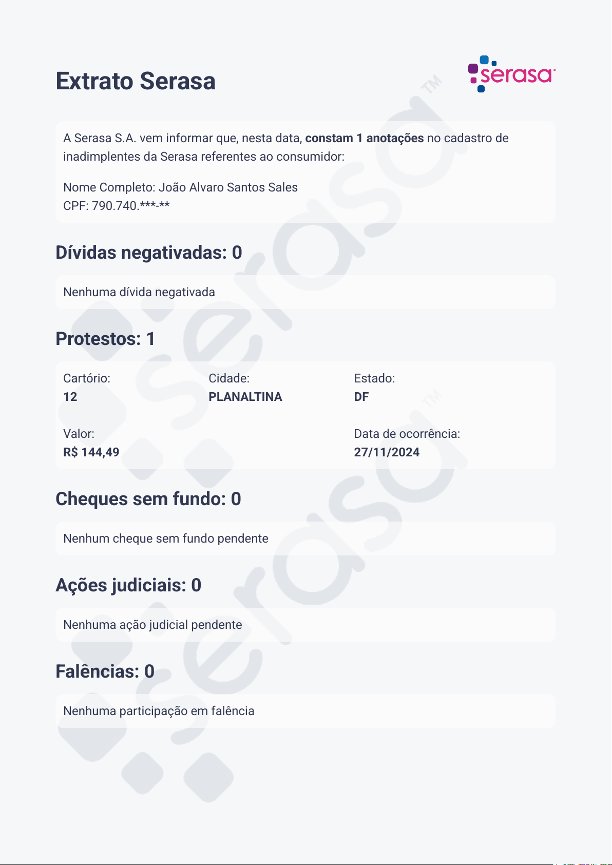 Extrato Serasa A Serasa S.A. vem informar que, nesta data, constam 1 anotações no cadastro de inadimplentes da Serasa referentes ao consumidor: Nome Completo: João Alvaro Santos Sales CPF: 790.740.***-** Dívidas negativadas: 0 Nenhuma dívida negativada Protestos: 1 Cartório: 12 Valor: R$ 144,49 Cidade: PLANALTINA Estado: DF Data de ocorrência: 27/11/2024 Cheques sem fundo: 0 Nenhum cheque sem fundo pendente Ações judiciais: 0 Nenhuma ação judicial pendente Falências: 0 Nenhuma participação em falência Este extrato foi emitido em 26/11/2025 às 09:40:47 do horário de Brasília e está disponível para consulta no endereço de internet https://www.serasa.com.br/area- cliente/meu-cpf/pendencias/extrato. Código de autenticidade: J54E.SH47.ZLMT.WBJE O extrato tem as informações que constam no Cadastro de Inadimplentes da Serasa no momento da consulta. A Serasa Experian não possui qualquer atuação sobre o uso do extrato ou sobre qualquer processo de concessão de crédito ou realização de negócio. A empresa credora é responsável pela solicitação de baixa das dívidas negativadas em até 5 dias úteis após a confirmação do pagamento. Após esse prazo, se a dívida ainda estiver anotada, ou no caso de não reconhecimento de alguma das informações do extrato, deve-se entrar em contato diretamente com a empresa ou com a Serasa por meio do telefone 3003 6300, de segunda a sexta, das 8h às 20h. Extrato Serasa