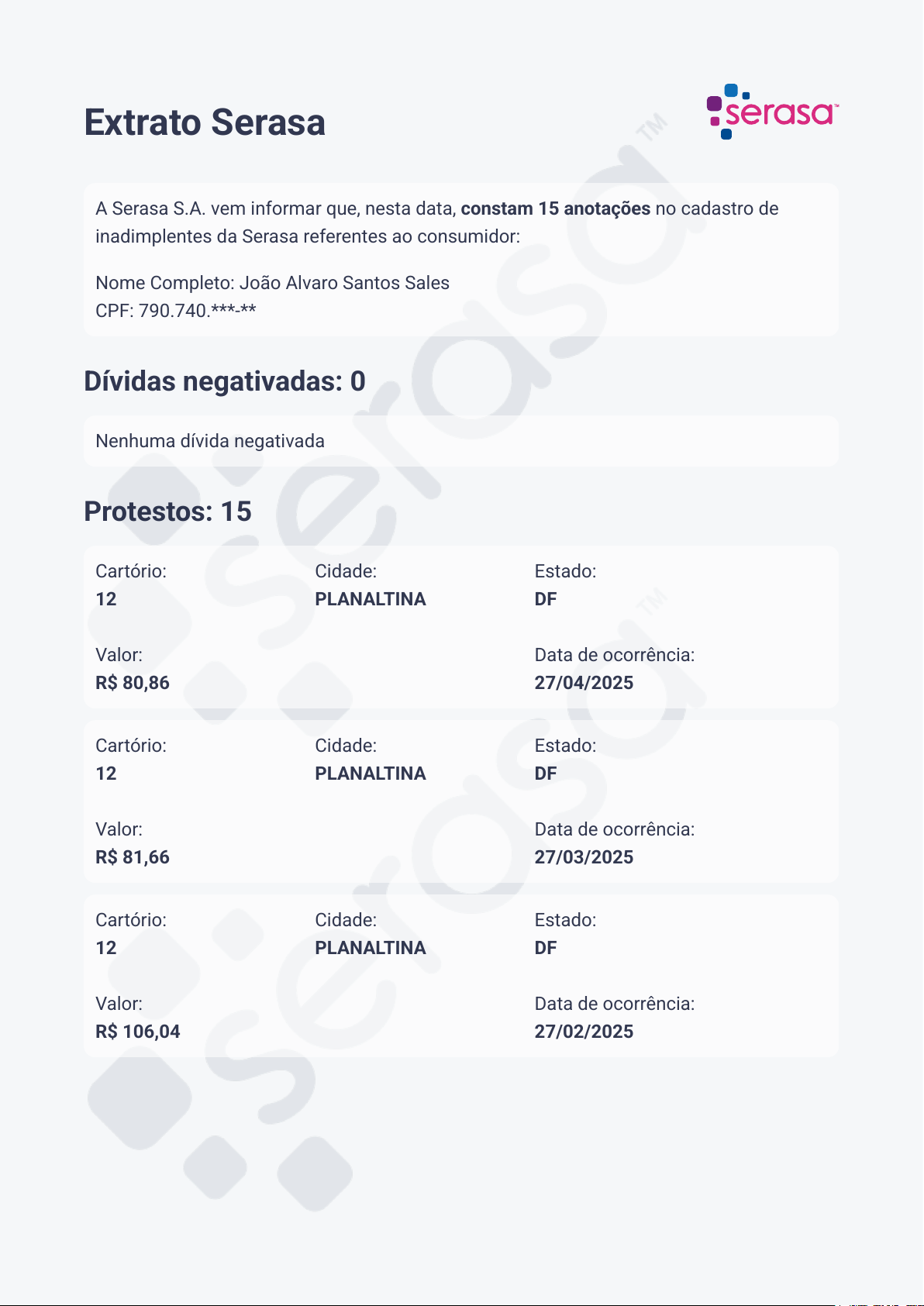 Extrato Serasa A Serasa S.A. vem informar que, nesta data, constam 15 anotações no cadastro de inadimplentes da Serasa referentes ao consumidor: Nome Completo: João Alvaro Santos Sales CPF: 790.740.***-** Dívidas negativadas: 0 Nenhuma dívida negativada Protestos: 15 Cartório: 12 Valor: R$ 80,86 Cidade: PLANALTINA Estado: DF Data de ocorrência: 27/04/2025 Cartório: 12 Valor: R$ 81,66 Cidade: PLANALTINA Estado: DF Data de ocorrência: 27/03/2025 Cartório: 12 Valor: R$ 106,04 Cidade: PLANALTINA Estado: DF Data de ocorrência: 27/02/2025 Cartório: 12 Valor: R$ 90,05 Cidade: PLANALTINA Estado: DF Data de ocorrência: 27/01/2025 Cartório: 12 Valor: R$ 114,40 Cidade: PLANALTINA Estado: DF Data de ocorrência: 27/12/2024 Cartório: 12 Valor: R$ 144,49 Cidade: PLANALTINA Estado: DF Data de ocorrência: 27/11/2024 Cartório: 12 Valor: R$ 137,72 Cidade: PLANALTINA Estado: DF Data de ocorrência: 27/10/2024 Cartório: 12 Valor: R$ 163,41 Cidade: PLANALTINA Estado: DF Data de ocorrência: 27/09/2024 Cartório: 12 Valor: R$ 184,21 Cidade: PLANALTINA Estado: DF Data de ocorrência: 27/08/2024 Cartório: 12 Valor: R$ 43,18 Cidade: PLANALTINA Estado: DF Data de ocorrência: 12/04/2023 Cartório: 12 Valor: R$ 30,81 Cidade: PLANALTINA Estado: DF Data de ocorrência: 12/08/2022 Cartório: 12 Valor: R$ 37,44 Cidade: PLANALTINA Estado: DF Data de ocorrência: 12/05/2021 Cartório: 12 Valor: R$ 18,66 Cidade: PLANALTINA Estado: DF Data de ocorrência: 12/03/2021 Cartório: 12 Valor: R$ 22,53 Cidade: PLANALTINA Estado: DF Data de ocorrência: 12/02/2021 Cartório: 12 Valor: R$ 37,23 Cidade: PLANALTINA Estado: DF Data de ocorrência: 12/10/2020 Cheques sem fundo: 0 Nenhum cheque sem fundo pendente Ações judiciais: 0 Nenhuma ação judicial pendente Falências: 0 Nenhuma participação em falência Este extrato foi emitido em 01/09/2025 às 16:26:40 do horário de Brasília e está disponível para consulta no endereço de internet https://www.serasa.com.br/area- cliente/meu-cpf/pendencias/extrato. Código de autenticidade: WV7U.CWWU.XUG7.IN8I O extrato tem as informações que constam no Cadastro de Inadimplentes da Serasa no momento da consulta. A Serasa Experian não possui qualquer atuação sobre o uso do extrato ou sobre qualquer processo de concessão de crédito ou realização de negócio. A empresa credora é responsável pela solicitação de baixa das dívidas negativadas em até 5 dias úteis após a confirmação do pagamento. Após esse prazo, se a dívida ainda estiver anotada, ou no caso de não reconhecimento de alguma das informações do extrato, deve-se entrar em contato diretamente com a empresa ou com a Serasa por meio do telefone 3003 6300, de segunda a sexta, das 8h às 20h. Extrato Serasa