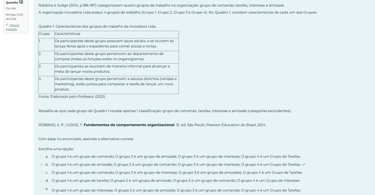 Questão 12 Robbins e Judge (2014, p.186-187) categorizaram quatro grupos de trabalho na organização: grupo de comando, tarefas, interesse e amizade. Correto A organização Inovadora Ltda possui 4 grupos de trabalho (Grupo 1, Grupo 2, Grupo 3 e Grupo 4). No Quadro 1, constam características de cada um dos Grupos: Atingiu 0,40 de 0,40 P Marcar Quadro 1: Características dos grupos de trabalho da Inovadora Ltda. questão Grupo Características 1 Os participantes deste grupo possuem laços sociais, e se reúnem às terças-feiras após O expediente para comer pizzas e tortas. 2 Os participantes deste grupo pertencem ao departamento de compras (todas as funções estão no organograma). 3 Os participantes se reuniram de maneira informal para alcançar a meta de lançar novos produtos. 4 Os participantes deste grupo pertencem a setores distintos (vendas e marketing), estão juntos para completar a tarefa de lançar um novo produto. Fonte: Elaborado pelo Professor (2021). Ressalta-se que cada grupo do Quadro 1 recebe apenas 1 classificação: grupo de comando, tarefas, interesse e amizade (categorias excludentes). ROBBINS, S. P.; JUDGE, T. Fundamentos do comportamento organizacional. 12. ed. São Paulo: Pearson Education do Brasil, 2014. Com base no enunciado, assinale a alternativa correta: Escolha uma opção: a. O grupo lé um grupo de comando; O grupo 2 é um grupo de amizade; O grupo um grupo de interesse; O grupo 4 é um Grupo de Tarefas. b. O grupo lé um grupo de amizade; O grupo um grupo de comando; O grupo um grupo de interesse; O grupo 4 é um Grupo de Tarefas. C. grupo lé um grupo de comando; O grupo um grupo de interesse; O grupo um grupo de amizades; O grupo 4 é um Grupo de Tarefas. d. O grupo lé um grupo de tarefas; O grupo um grupo de amizade; O grupo 3 é um grupo de comando; O grupo 4 é um Grupo de interesse. e. O grupo 1 é um grupo de interesse; O grupo 2 é um grupo de amizade; O grupo 3 é um grupo de comando; O grupo 4 é um Grupo de Tarefas.