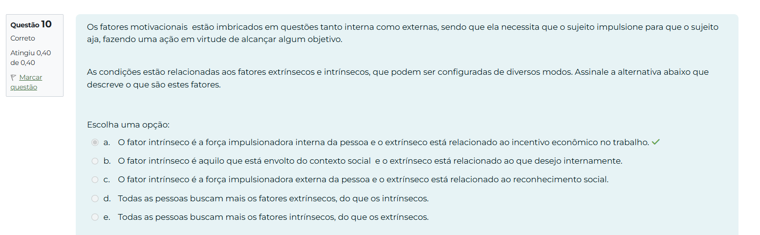 Questão 10 Os fatores motivacionais estão imbricados em questões tanto interna como externas, sendo que ela necessita que O sujeito impulsione para que O sujeito Correto aja, fazendo uma ação em virtude de alcançar algum objetivo. Atingiu 0,40 de 0,40 As condições estão relacionadas aos fatores extrínsecos e intrínsecos, que podem ser configuradas de diversos modos. Assinale a alternativa abaixo que Marcar questão descreve O que são estes fatores. Escolha uma opção: a. fator intrínseco é a força impulsionadora interna da pessoa e O extrínseco está relacionado ao incentivo econômico no trabalho. b. fator intrínseco é aquilo que está envolto do contexto social e O extrínseco está relacionado ao que desejo internamente. C. fator intrínseco é a força impulsionadora externa da pessoa e O extrínseco está relacionado ao reconhecimento social. d. Todas as pessoas buscam mais OS fatores extrínsecos, do que intrínsecos. e. Todas as pessoas buscam mais fatores intrínsecos, do que extrínsecos.