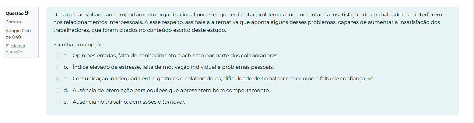 Questão 9 Uma gestão voltada ao comportamento organizacional pode ter que enfrentar problemas que aumentam a insatisfação dos trabalhadores e interferem Correto nos relacionamentos interpessoais. A esse respeito, assinale a alternativa que aponta alguns desses problemas, capazes de aumentar a insatisfação dos Atingiu 0,40 trabalhadores, que foram citados no conteúdo escrito deste estudo. de 0,40 Marcar Escolha uma opção: questão a. Opiniões erradas, falta de conhecimento e achismo por parte dos colaboradores. b. elevado de estresse, falta de motivação individual e problemas pessoais. C. Comunicação inadequada entre gestores e colaboradores, dificuldade de trabalhar em equipe e falta de confiança. d. Ausência de premiação para equipes que apresentem bom comportamento. e. Ausência no trabalho, demissões e turnover.