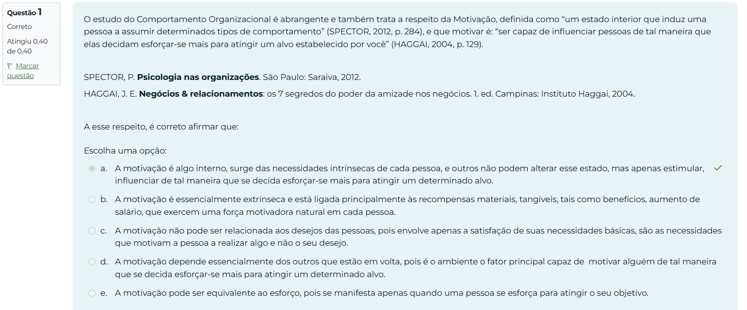 Questão 1 O estudo do Comportamento Organizacional é abrangente e também trata a respeito da Motivação, definida como "um estado interior que induz uma Correto pessoa a assumir determinados tipos de comportamento" (SPECTOR, 2012, 284), e que motivar é: "ser capaz de influenciar pessoas de tal maneira que Atingiu 0,40 elas decidam esforçar-se mais para atingir um alvo estabelecido por você" (HAGGAI, 2004, p. 129). de 0,40 Marcar questão SPECTOR, P. Psicologia nas organizações. São Paulo: Saraiva, 2012. HAGGAI, J.E. Negócios & 7 segredos do poder da amizade nos negócios. 1. ed. Campinas: Instituto Haggai, 2004. A esse respeito, é correto afirmar que: Escolha uma opção: a. A motivação é algo interno, surge das necessidades intrínsecas de cada pessoa, e outros não podem alterar esse estado, mas apenas estimular, influenciar de tal maneira que se decida esforçar-se mais para atingir um determinado alvo. b. A motivação é essencialmente extrínseca e está ligada principalmente às recompensas materiais, tangíveis, tais como benefícios, aumento de salário, que exercem uma força motivadora natural em cada pessoa. C. A motivação não pode ser relacionada aos desejos das pessoas, pois envolve apenas a satisfação de suas necessidades básicas, são as necessidades que motivam a pessoa a realizar algo e não O seu desejo. d. A motivação depende essencialmente dos outros que estão em volta, pois é O ambiente O fator principal capaz de motivar alguém de tal maneira que se decida esforçar-se mais para atingir um determinado alvo. e. A motivação pode ser equivalente ao esforço, pois se manifesta apenas quando uma pessoa se esforça para atingir O seu objetivo.