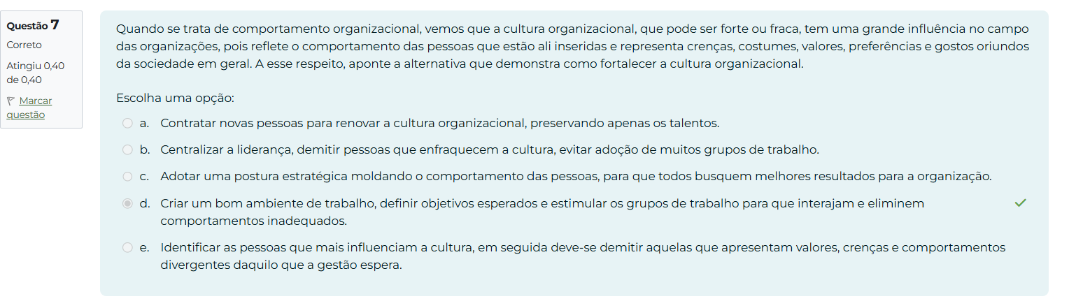 Questão 7 Quando se trata de comportamento organizacional, vemos que a cultura organizacional, que pode ser forte ou fraca, tem uma grande influência no campo Correto das organizações, pois reflete O comportamento das pessoas que estão ali inseridas e representa crenças, costumes, valores, preferências e gostos oriundos Atingiu 0,40 da sociedade em geral. A esse respeito, aponte a alternativa que demonstra como fortalecer a cultura organizacional. 0,40 Marcar Escolha uma opção: questão a. Contratar novas pessoas para renovar a cultura organizacional, preservando apenas talentos. b. Centralizar a liderança, demitir pessoas que enfraquecem a cultura, evitar adoção de muitos grupos de trabalho. C. Adotar uma postura estratégica moldando O comportamento das pessoas, para que todos busquem melhores resultados para a organização. d. Criar um bom ambiente de trabalho, definir objetivos esperados e estimular grupos de trabalho para que interajam e eliminem comportamentos inadequados. e. Identificar as pessoas que mais influenciam a cultura, em seguida deve-se demitir aquelas que apresentam valores, crenças e comportamentos divergentes daquilo que a gestão espera.