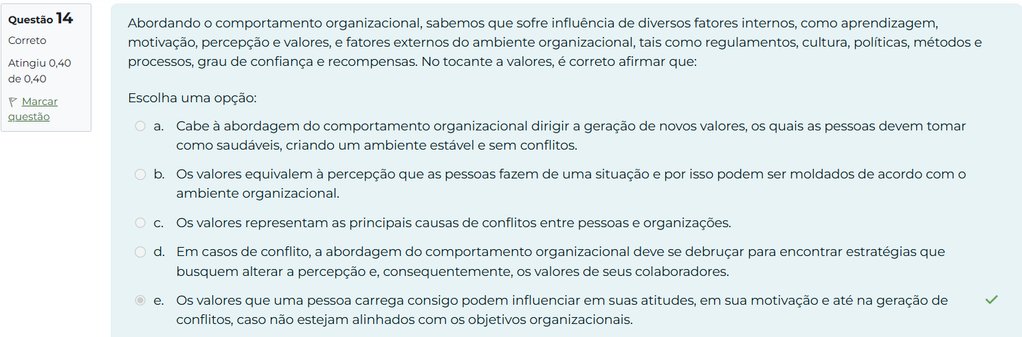 Questão 14 Abordando comportamento organizacional, sabemos que sofre influência de diversos fatores internos, como aprendizagem, Correto motivação, percepção e valores, e fatores externos do ambiente organizacional, tais como regulamentos, cultura, políticas, métodos e Atingiu 0,40 processos, grau de confiança e recompensas. No tocante a valores, é correto afirmar que: de 0,40 Marcar Escolha uma opção: questão a. Cabe à abordagem do comportamento organizacional dirigir a geração de novos valores, quais as pessoas devem tomar como saudáveis, criando um ambiente estável e sem conflitos. b. Os valores equivalem à percepção que as pessoas fazem de uma situação e por isso podem ser moldados de acordo com ambiente organizacional. C. Os valores representam as principais causas de conflitos entre pessoas e organizações. d. Em casos de conflito, a abordagem do comportamento organizacional deve se debruçar para encontrar estratégias que busquem alterar a percepção e, consequentemente valores de seus colaboradores. e. Os valores que uma pessoa carrega consigo podem influenciar em suas atitudes, em sua motivação e até na geração de conflitos, caso não estejam alinhados com objetivos organizacionais.